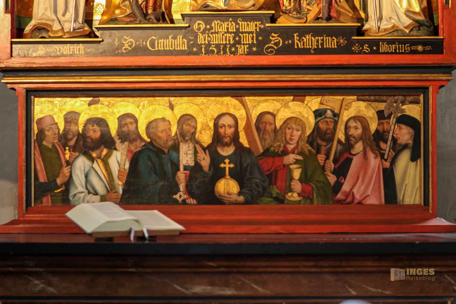 Das Sockelbild des Altars spricht für sich - Christus im Kreis seiner Apostel. Genauso braucht es zur Kreuzigungsgruppe keine weiteren Worte.