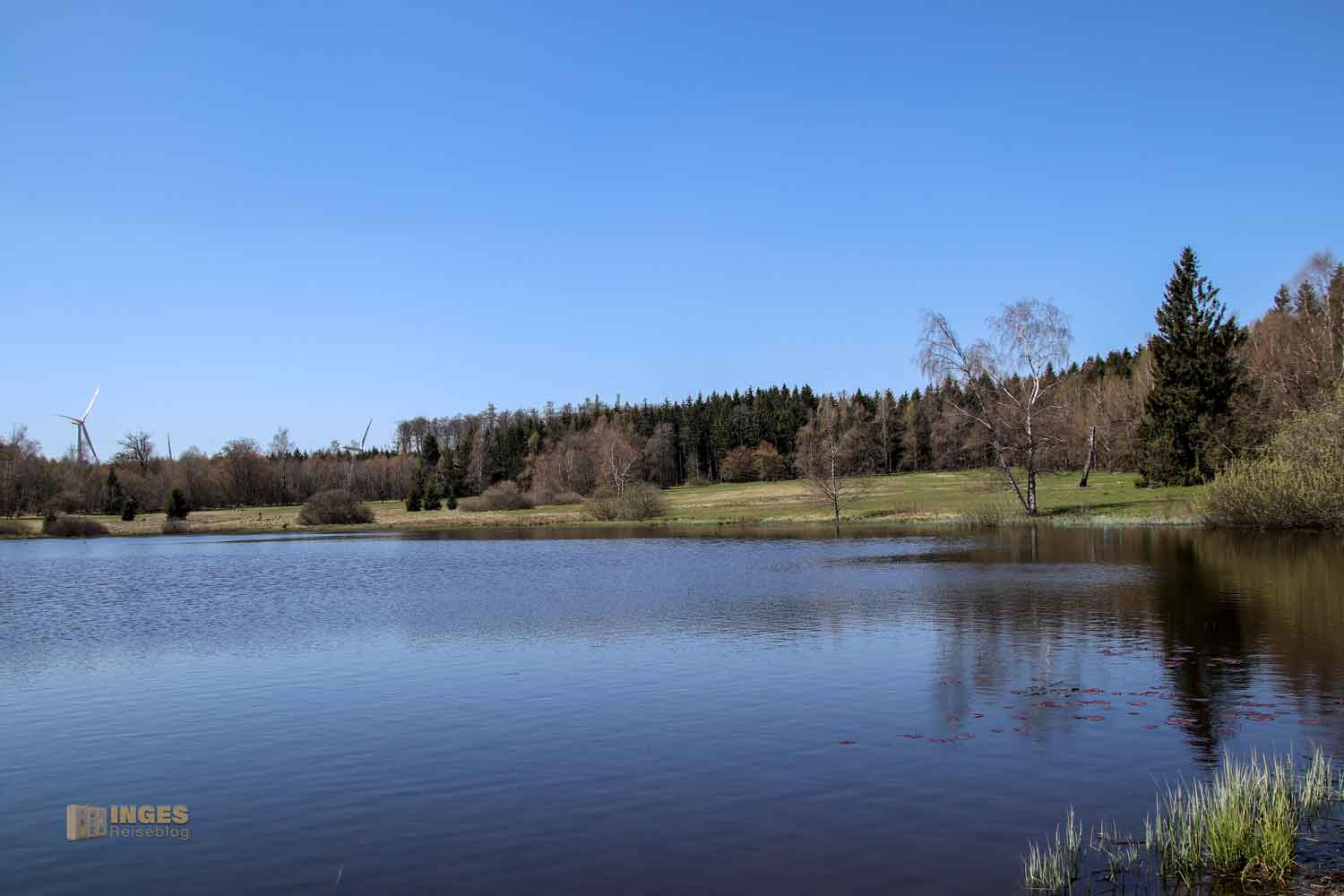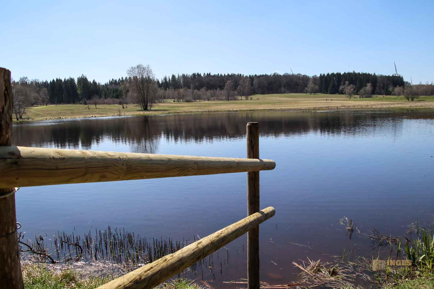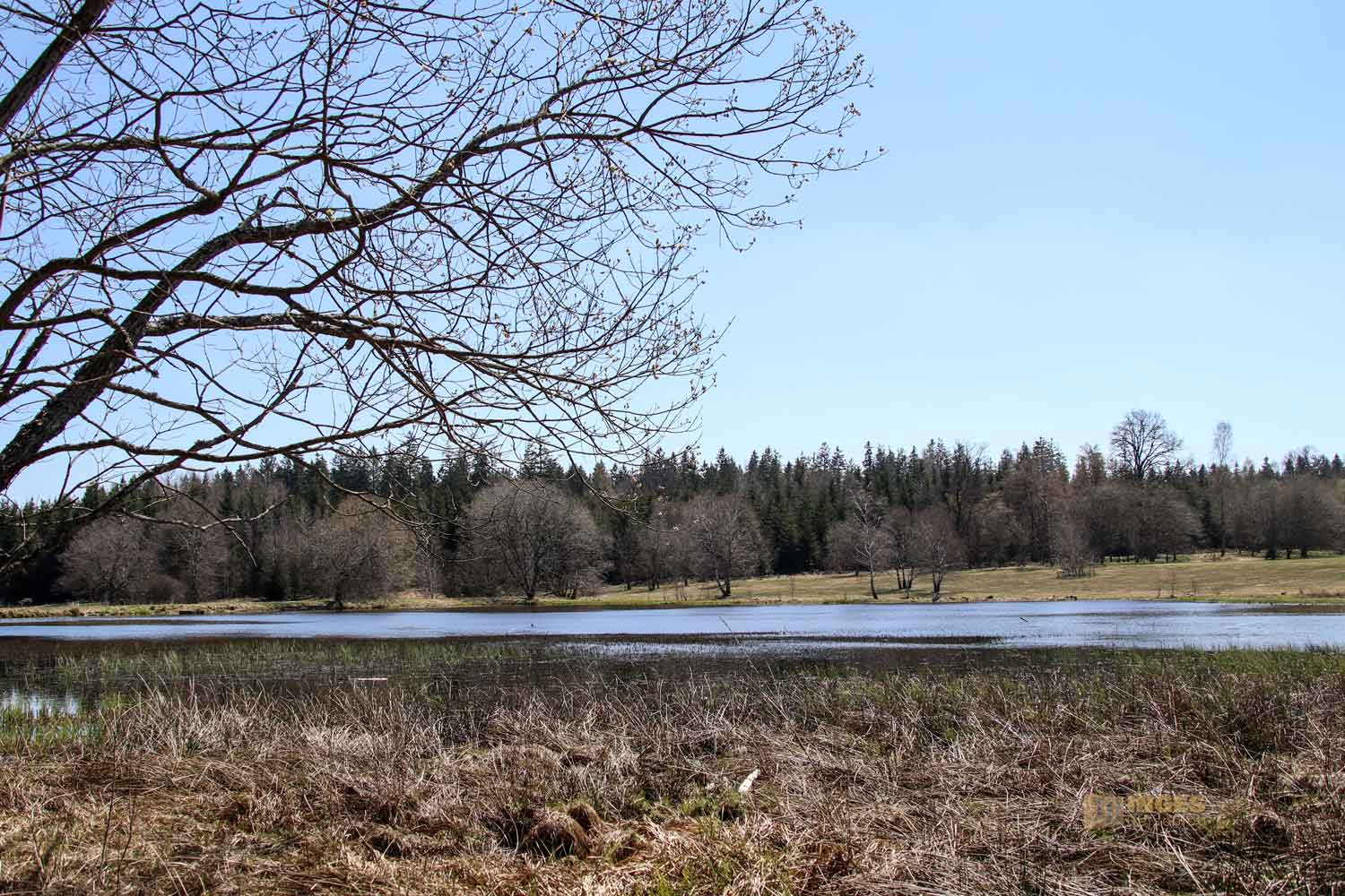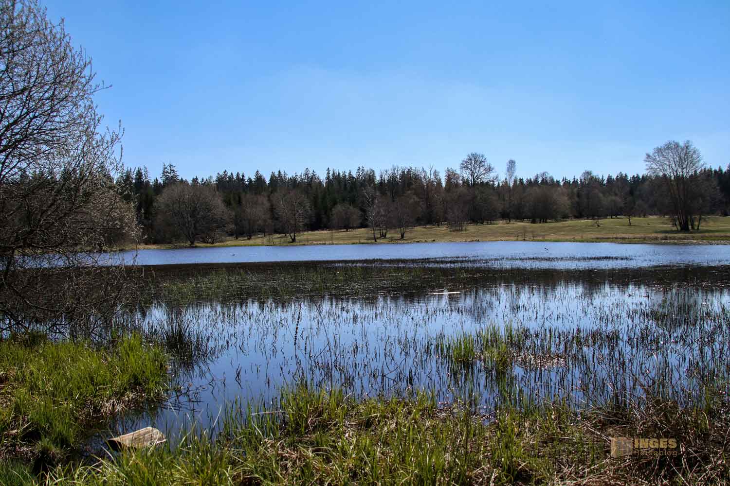 man kann ihn nur erahnen. In wenigen Schritten erreicht man ihn vom oberen See (links davon) und weiß spätestens hier, warum die Weiherwiesen Teil des europäischen Schutzgebietsnetzes Natura 2000 sind. Eine vielfältige Pflanzenwelt findet sich hier, und kein Wunder, dass dieses Gebiet für die Besucher nicht zu betreten ist. So können in Ruhe Orchideen, Lupinien und viele viele weitere Pflanzen gedeihen.