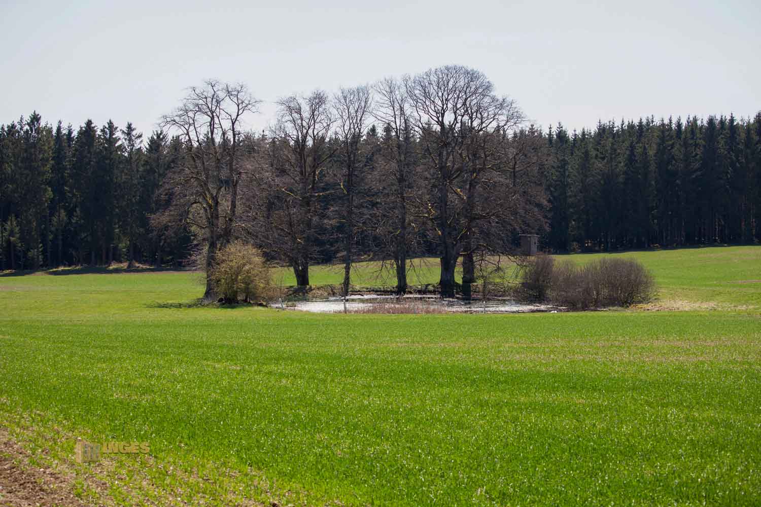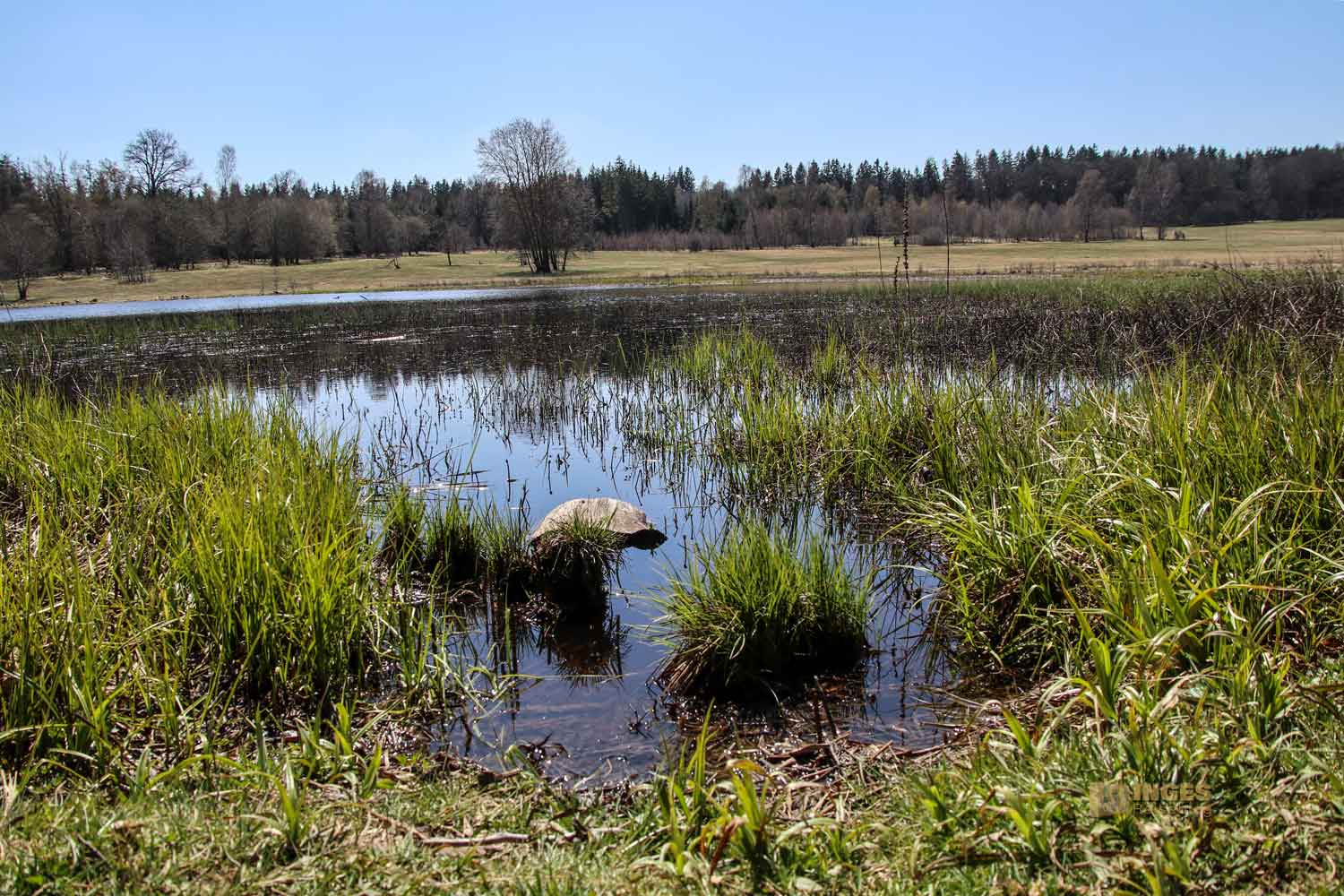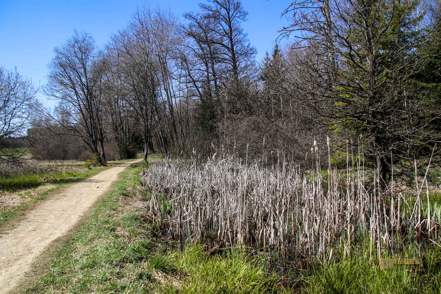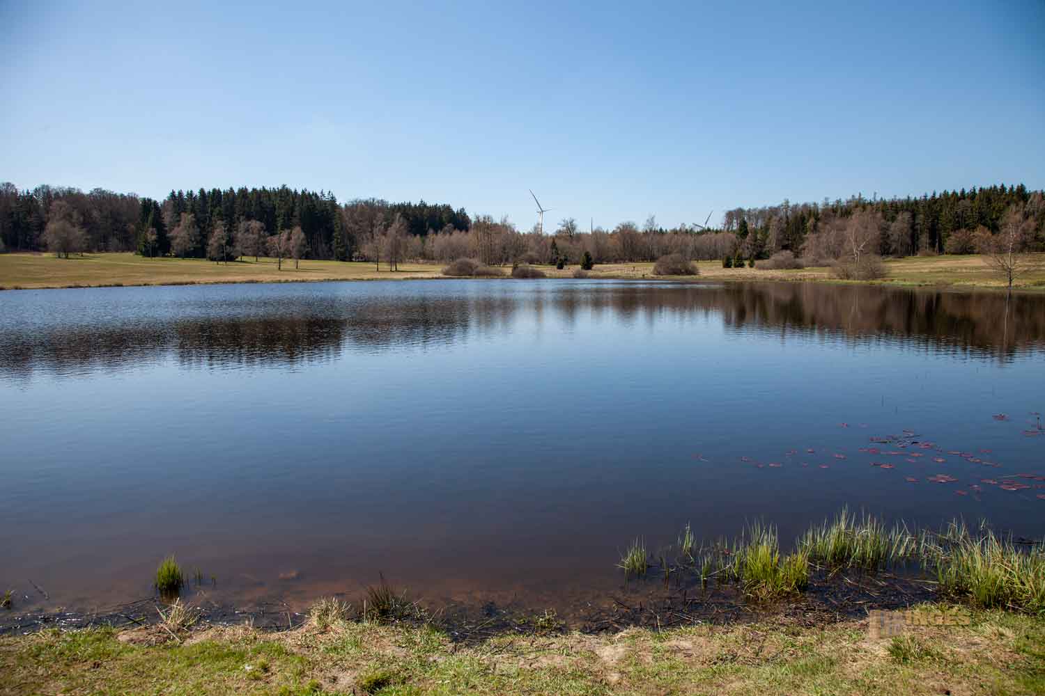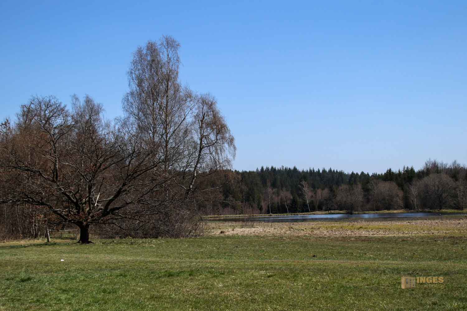 man kann ihn nur erahnen. In wenigen Schritten erreicht man ihn vom oberen See (links davon) und weiß spätestens hier, warum die Weiherwiesen Teil des europäischen Schutzgebietsnetzes Natura 2000 sind. Eine vielfältige Pflanzenwelt findet sich hier, und kein Wunder, dass dieses Gebiet für die Besucher nicht zu betreten ist. So können in Ruhe Orchideen, Lupinien und viele viele weitere Pflanzen gedeihen.