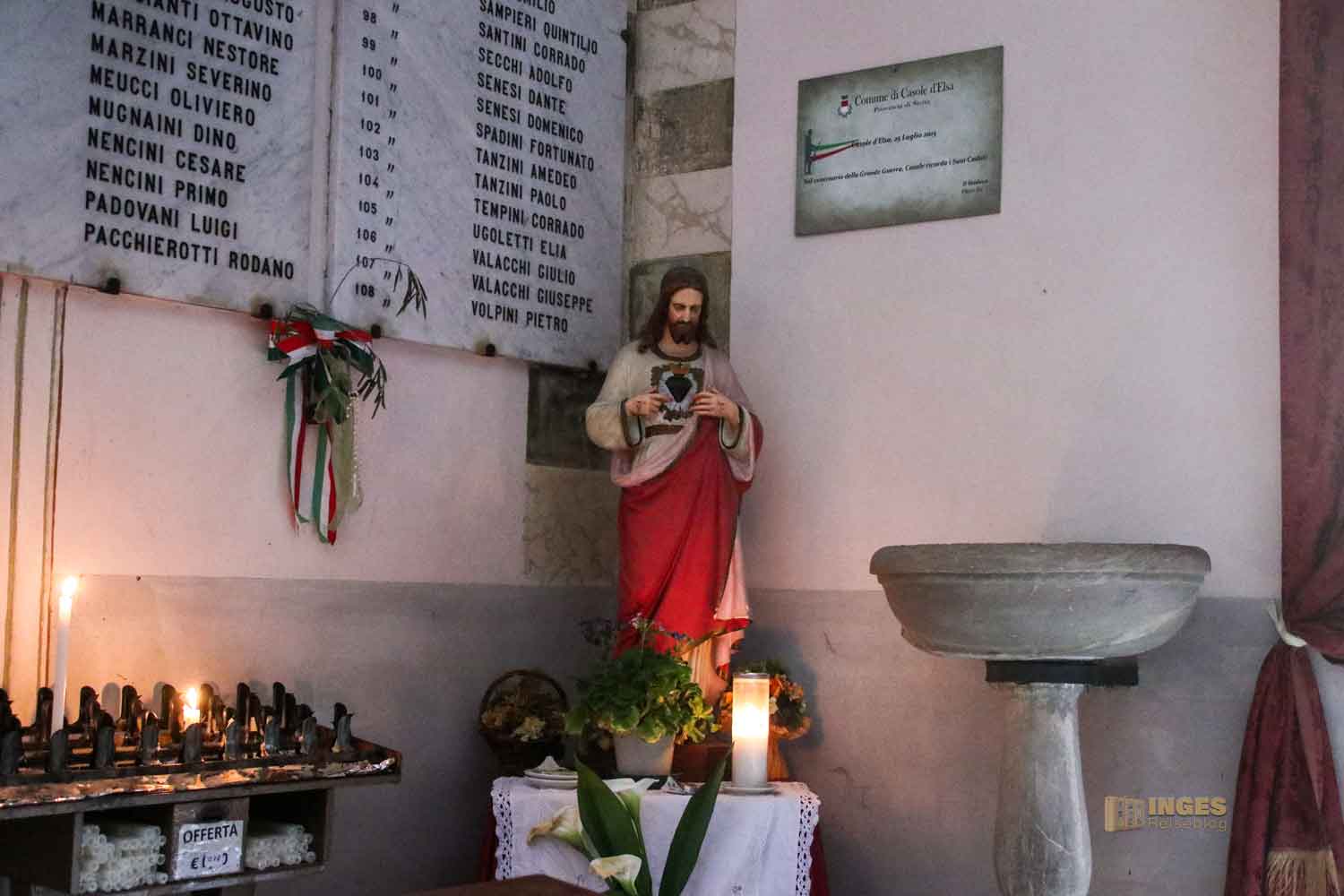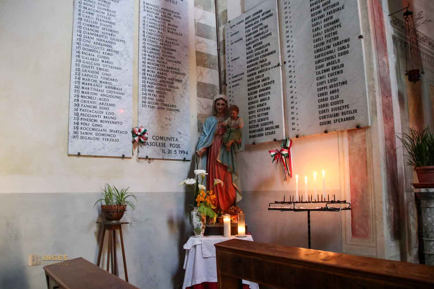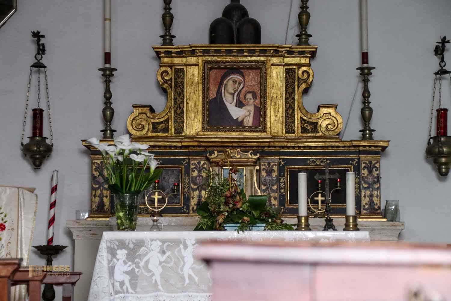 In der kleinen Kirche, die ganz der Mutter Gottes gewidmet ist, sind neben der Apsis vier Gedenktafeln angebracht. Sie erinnern an die Gefallenen der Weltkriege.