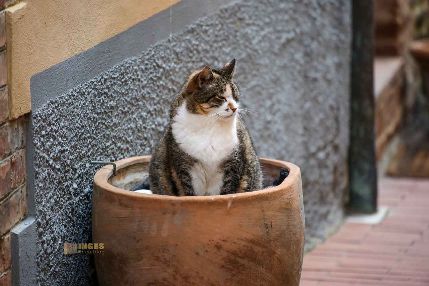 Die kleine Katze am Ende der Gasse hat sich kunstvoll in einen der für sie bereit gestellten Kübel drapiert. Die kleinen Quergassen führen zur Stadtmauer, in die z.T. die Häuser integriert sind.