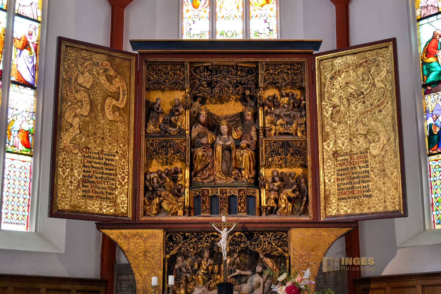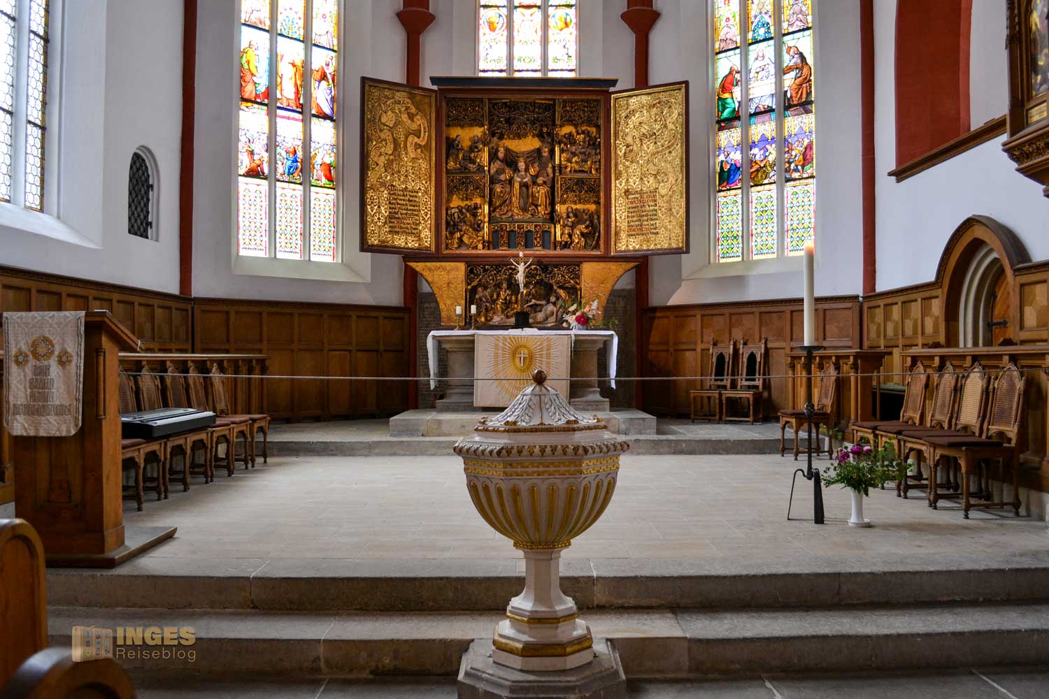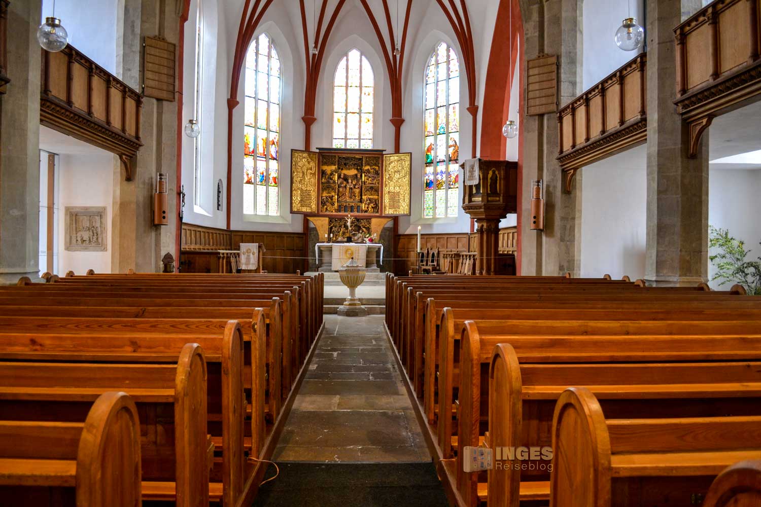 1883/84 wurden in einer Renovierungszeit die farbigen Fenster im Chorraum geschaffen. Der Schnitzaltar wird dem Jahr 1500 zugesprochen, der Taufstein aus der Mitte des 15. Jahrhunderts. Das Highlight der Kirche ist das 1929 installierte erste stimmbare und damit spielbare Porzellanglockenspiel der Welt, das erstmals am 1.06.1929 erklang. Es stammt aus der Staatlichen Prozellanmanufaktur Meißens.