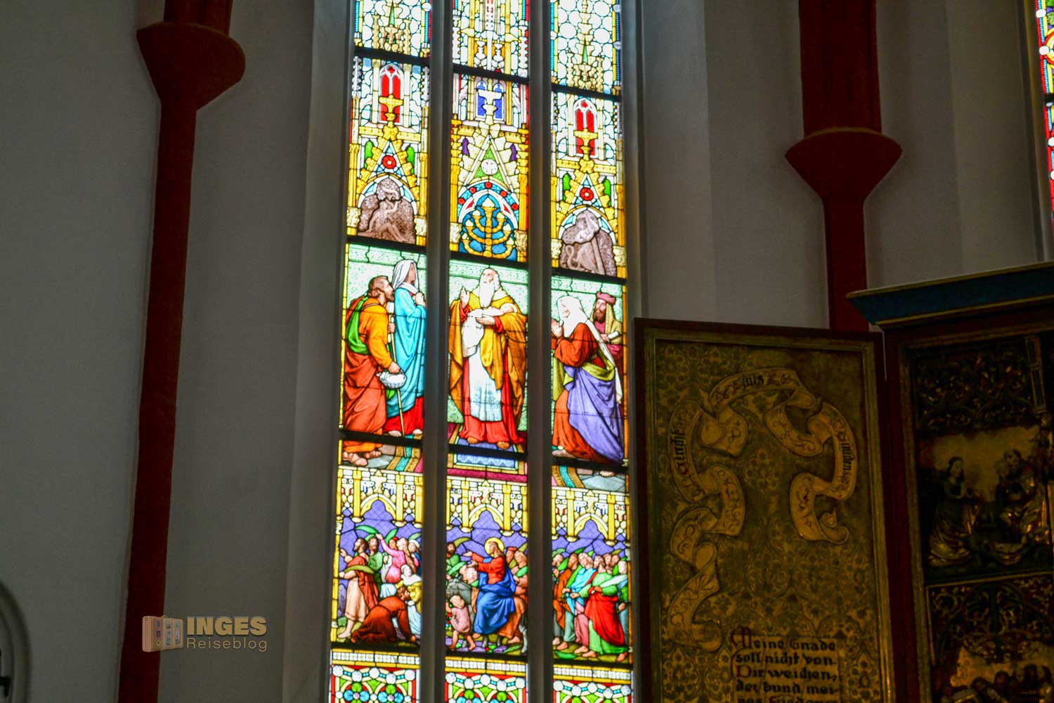 sind. Sie ist eine spätgotische Hallenkirche und wurde 1205 erstmals urkundlich erwähnt, als Kapelle der Heiligen Maria am Markt. Erst ca. 100 Jahre später trat der Name Frauenkirche auf. Sie war der Afrakirche, der ersten Pfarrkirche der Stadt unterstellt (wir haben sie aufgrund Zeitmangels aus unserem Besichtigungsprogramm gestrichen) entwickelte sich zur Bürgerkirche und erhielt 1457 das Taufrecht. Nach Stadtbränden entstand sie zwischen 1450 und 1520 als spätgotische Hallenkirche. Als nach einem Blitzschlag 1547 die Turmspitze zerstört wurde, erhielt sie ihr goldenes Häubchen samt Wetterfahne.