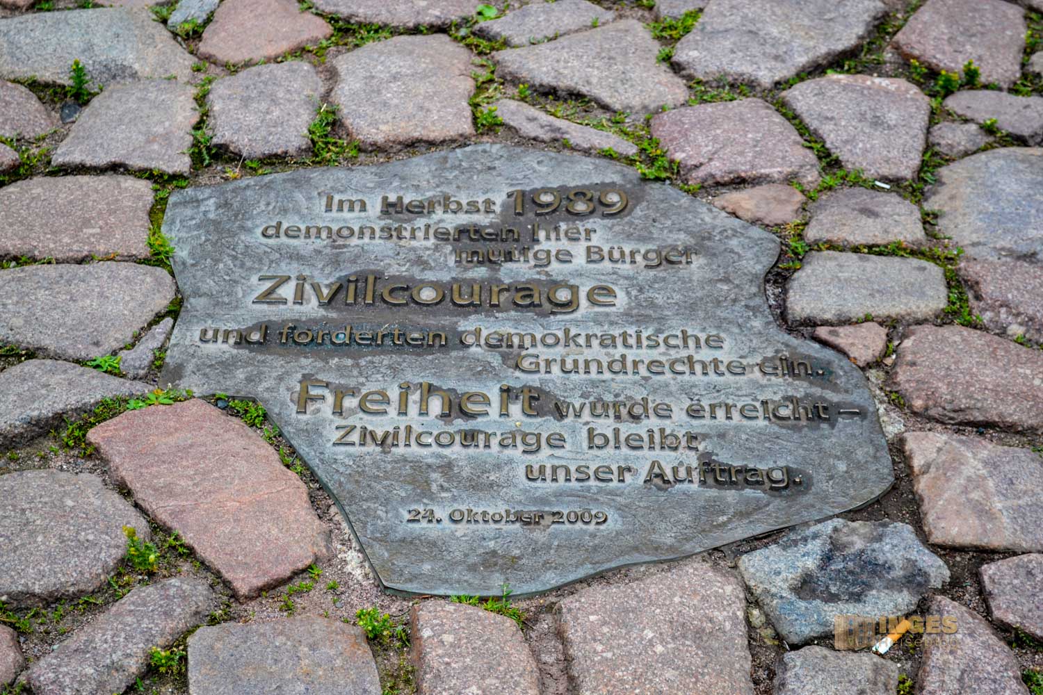 Vor dem Rathaus, leicht zu übersehen, ist im Pflaster ein Gedenkstein eingebracht, der an die Umbrüche von 1990 erinnert.