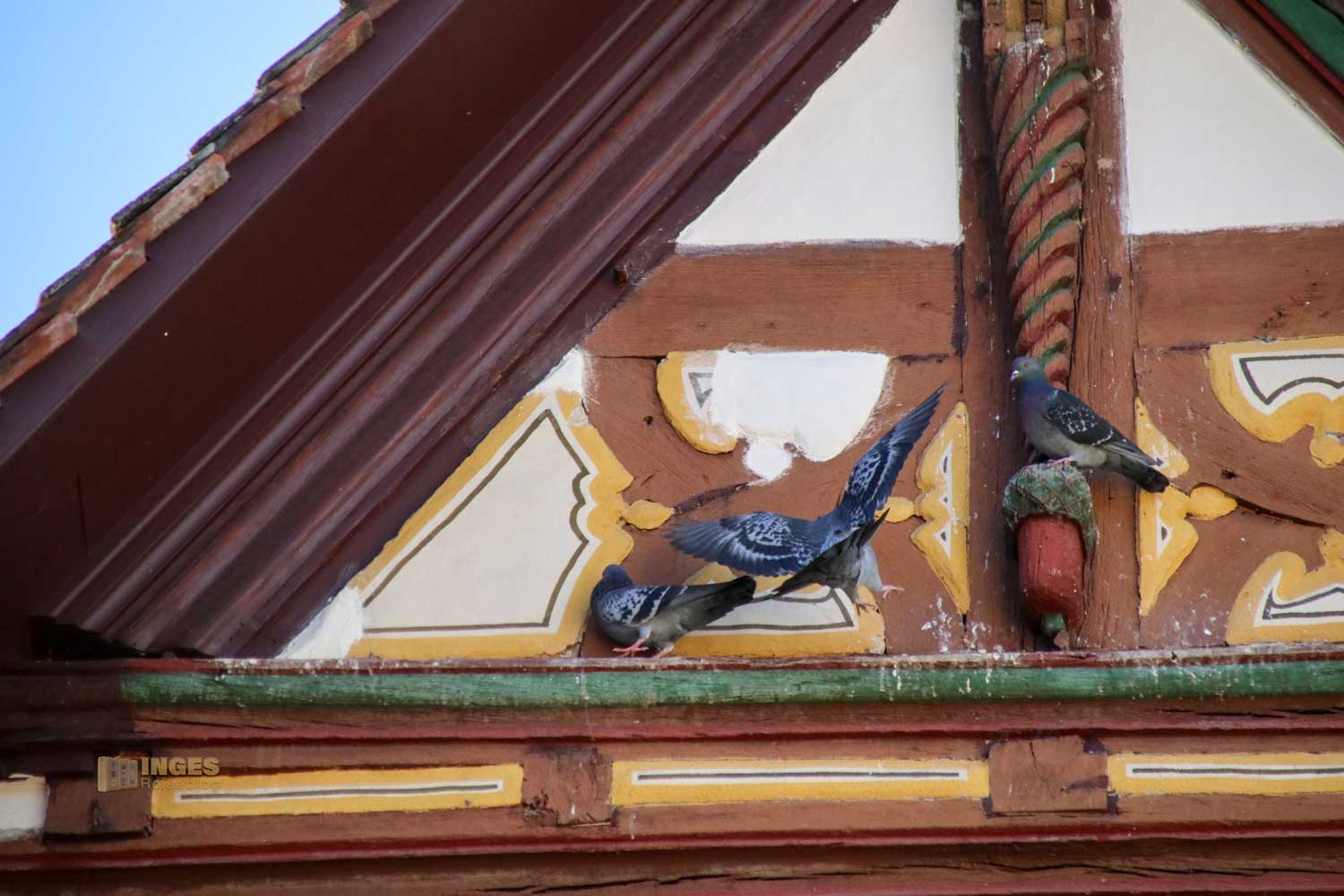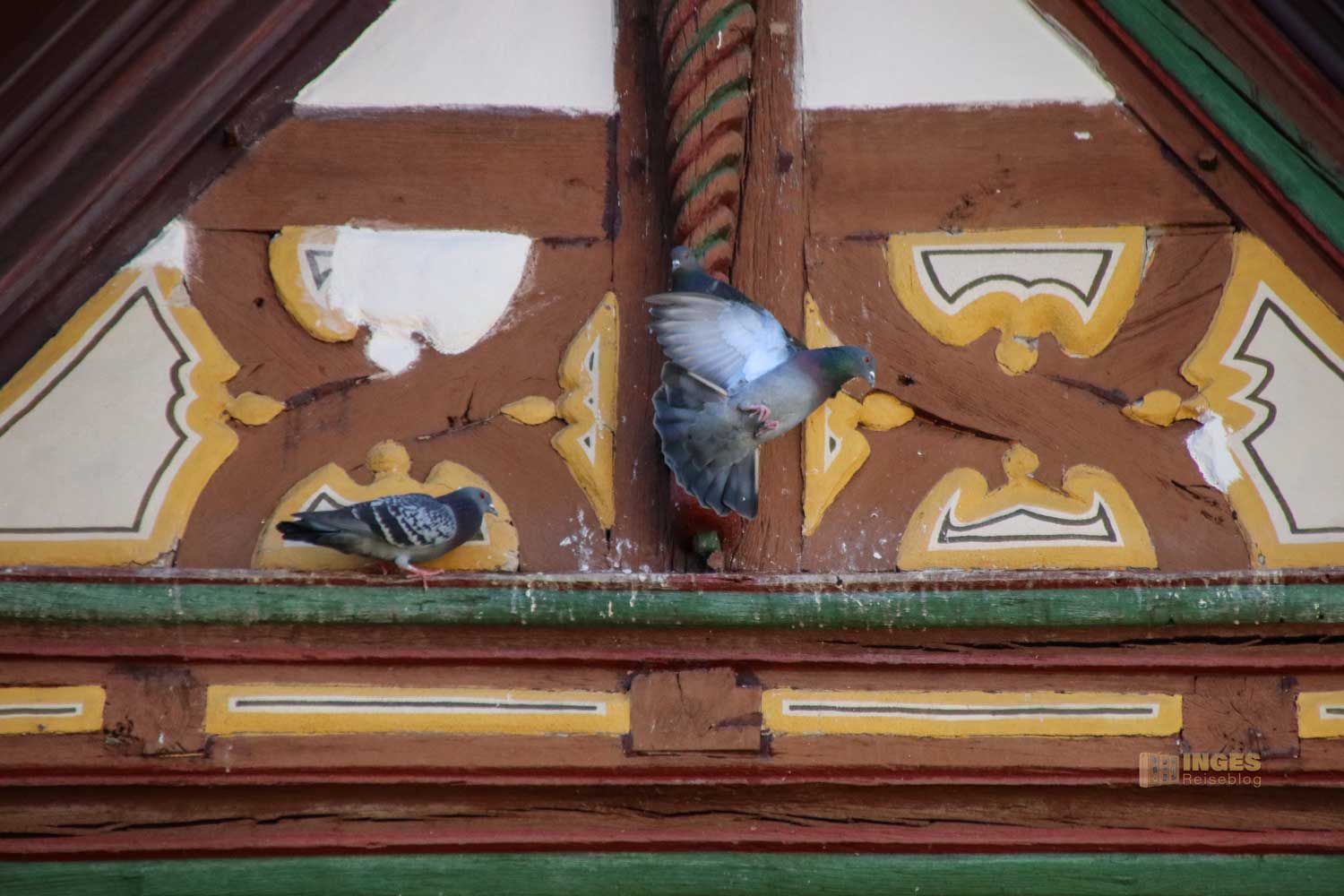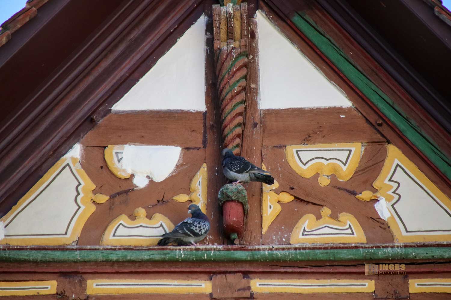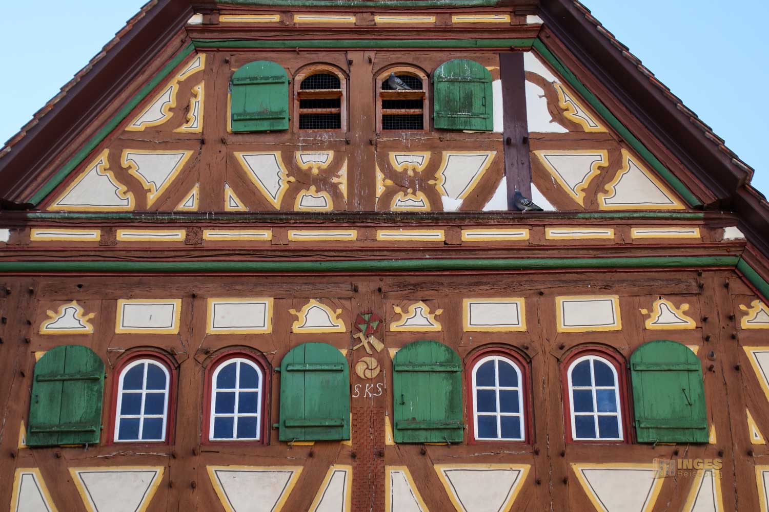 Allein das Satteldach des 1591 gebauten Fachwerkhauses hat drei Dachebenen und bietet am Giebel für die Tauben eine Anflugstation.