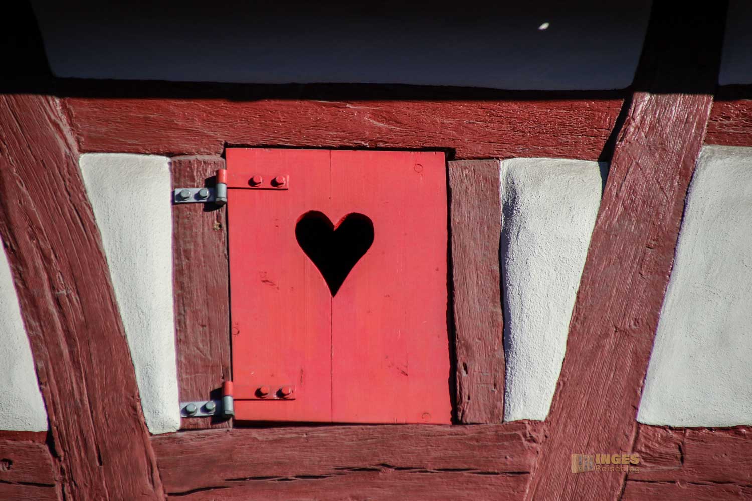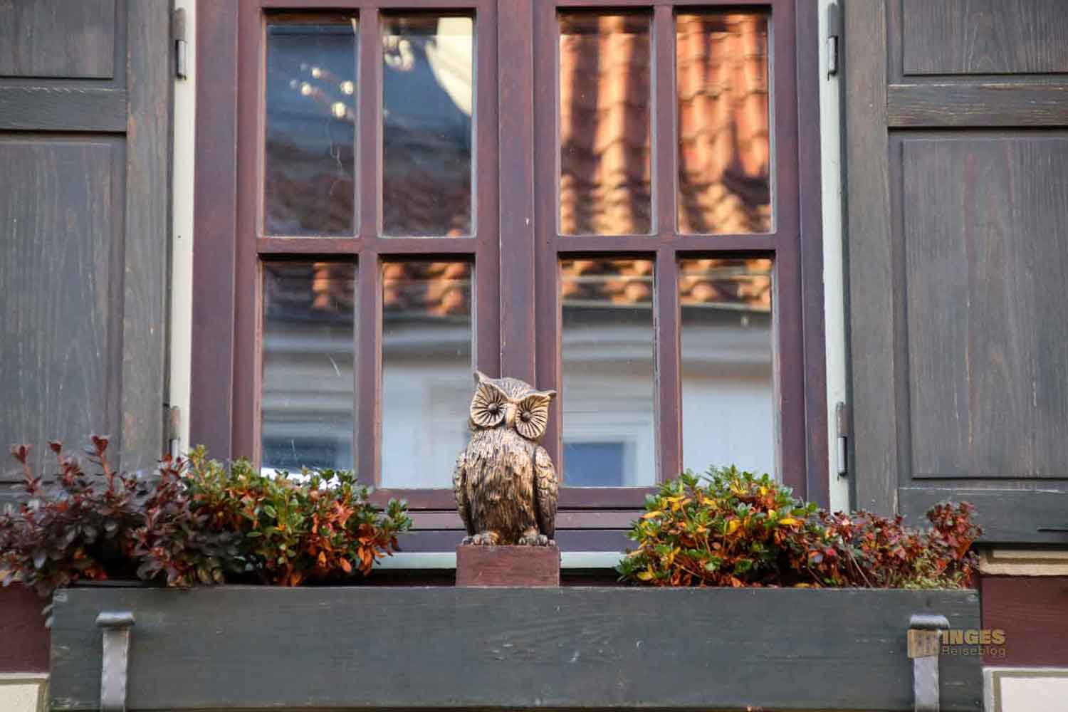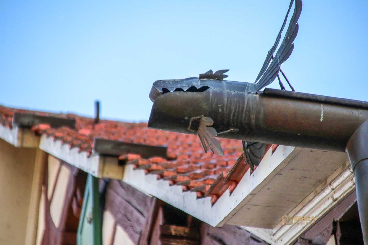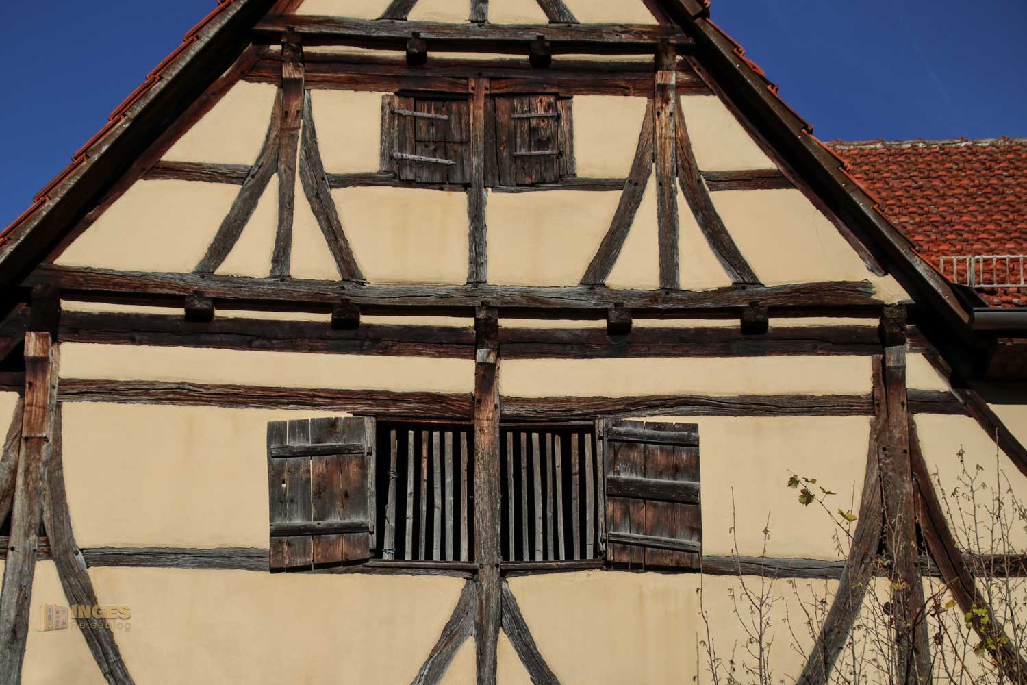 Allein das Satteldach des 1591 gebauten Fachwerkhauses hat drei Dachebenen und bietet am Giebel für die Tauben eine Anflugstation.