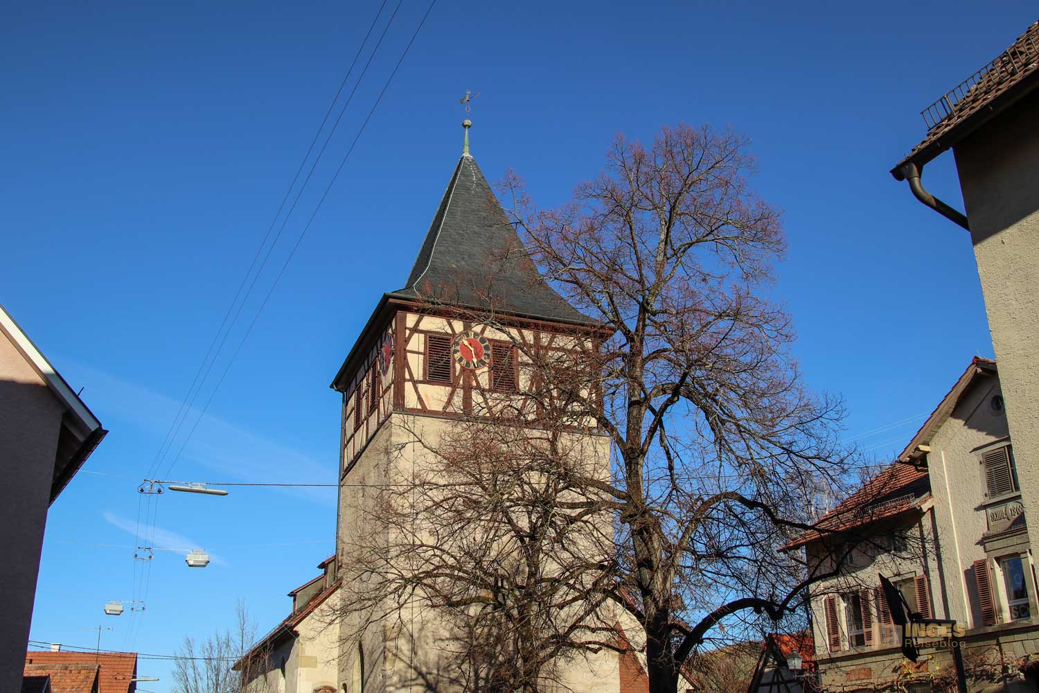 Zurück zur Pfarrkirche in Strümpfelbach, die 1534 wie so viele andere katholische Kirchen in Württemberg reformiert wurde. 1784 wurde die Kirche vergrößert und soll im Inneren einige sehenswerte Schätzchen bergen. SOLL - dieses Los trifft uns ja immer wieder bei unseren Kirchenbesuchen - GESCHLOSSEN! Naja, wer geht auch unter der Woche auf Sightseeing? 🙂