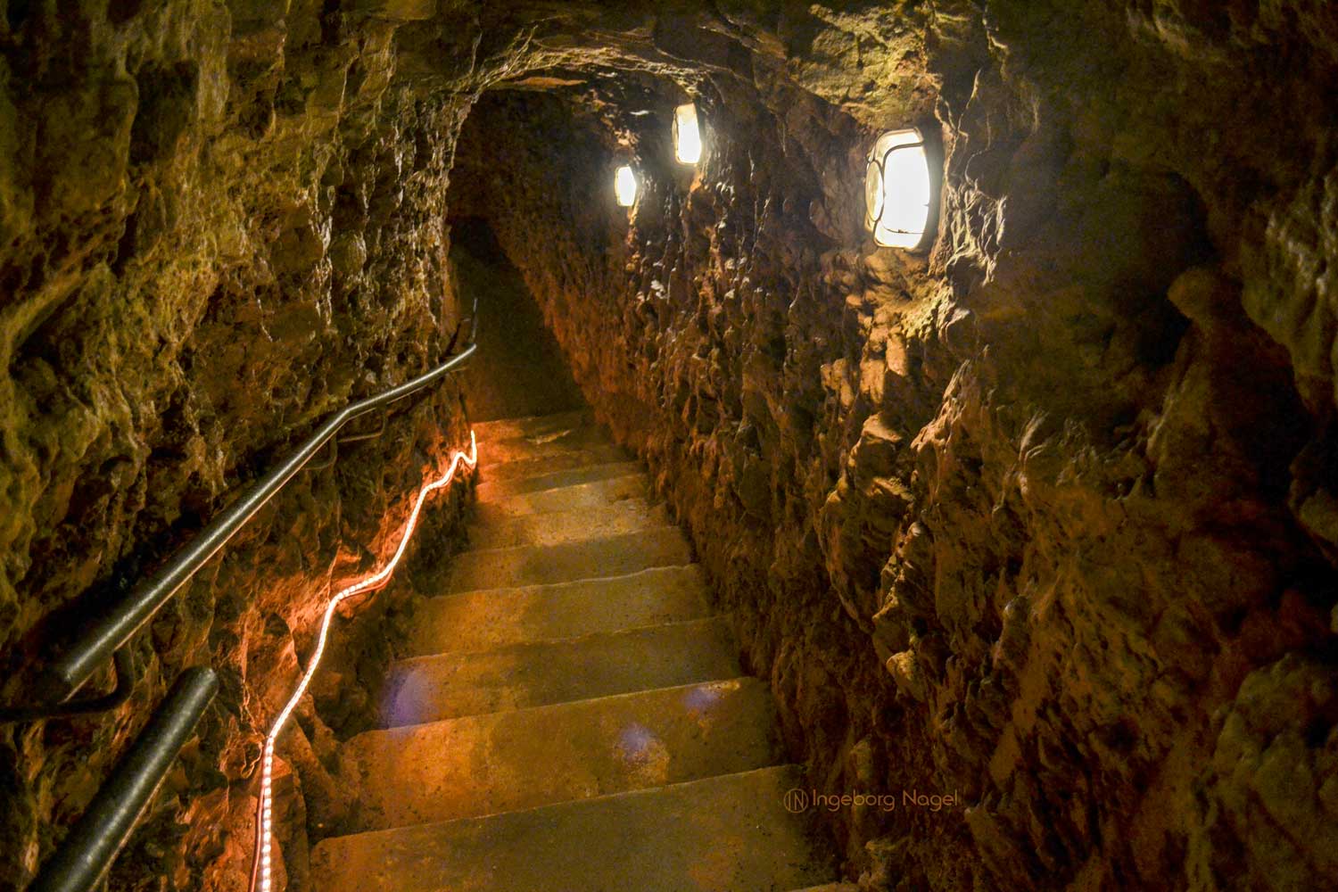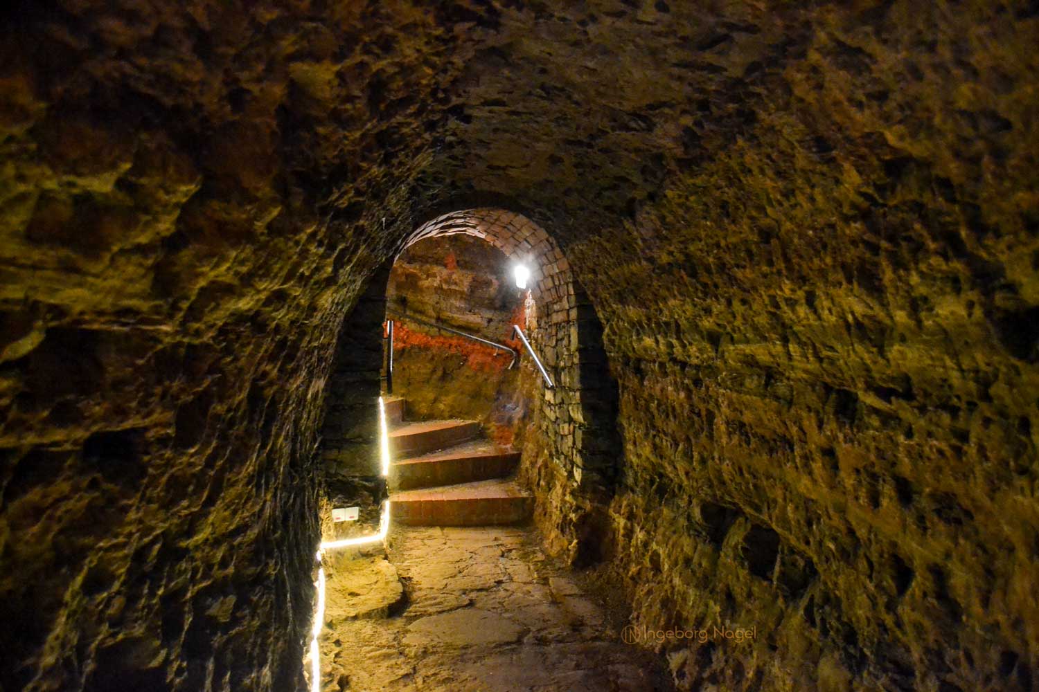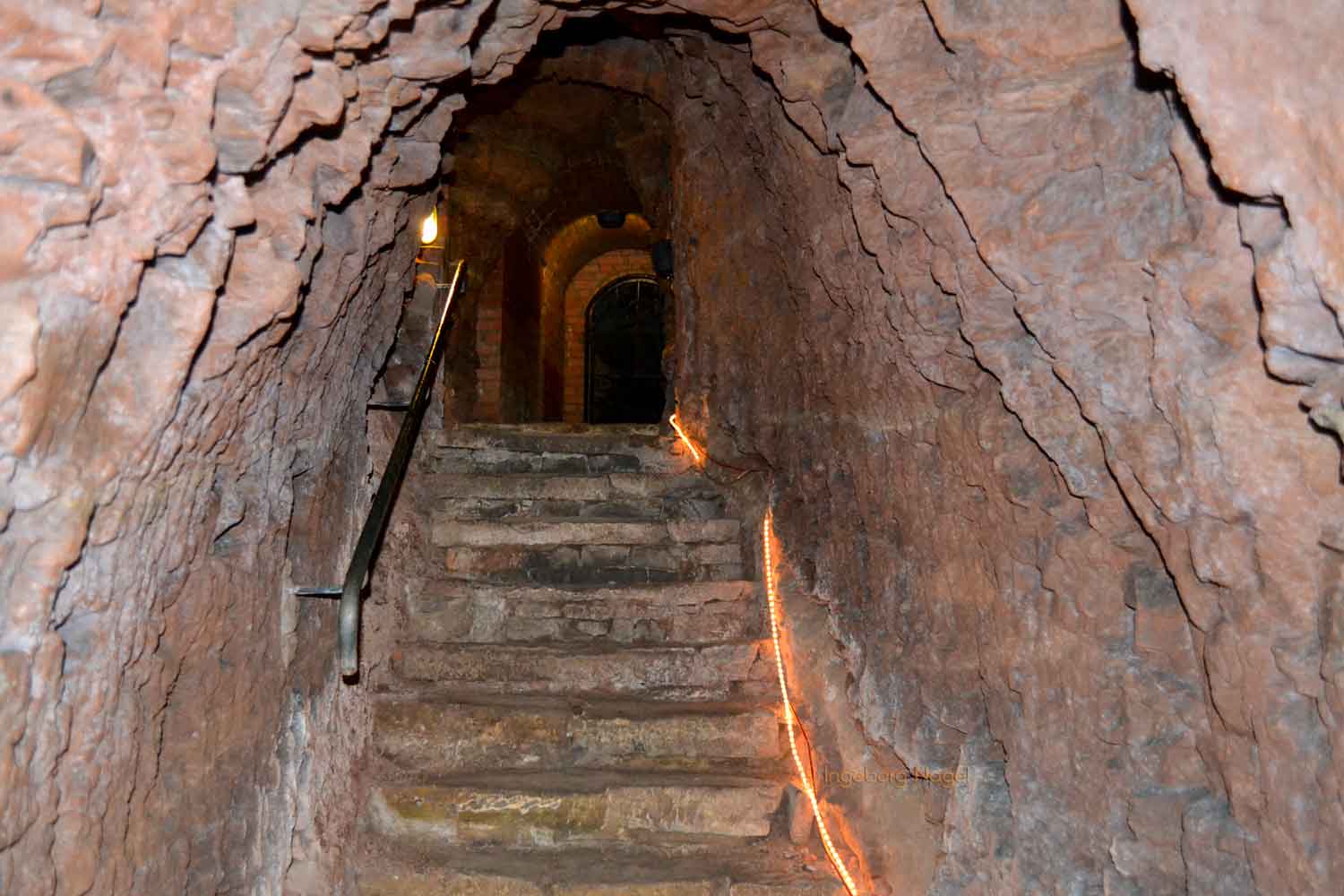 Unter den ältesten Teilen der Stadt wurde dieses Gangsystem kreuz und quer angelegt und ausgebaut. Oft nicht viel breiter als einen Meter sind die Gänge, die mühsam in jahrzehntelanger Arbeit in den Buntsandstein gehauen wurden. Da man nicht in die Breite bauen konnte, ging es eben dann in die Tiefe. In einigen Fällen sogar 3 Stockwerke und gut 8 Meter tief unter der Straße.