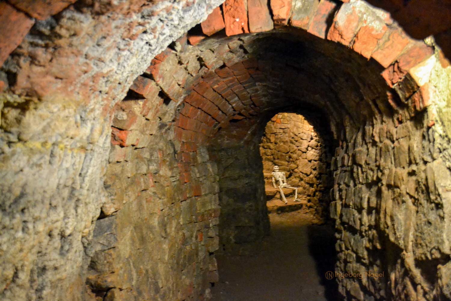 Man könnte jetzt denken, diese Gänge wären vielleicht zu Luftschutzzwecken im zweiten Weltkrieg angelegt worden. Tatsächlich hat man sie da auch genutzt, teilweise miteinander verbunden, mit Licht und Sitzgelegenheiten ausgestattet und mit fest verschließbaren Stahl- oder Holztüren verschließbar. Aber dies war nicht der Grund für die Schaffung dieser Gänge. Ein Grund war, das unterirdische System als Lagermöglichkeit für Lebensmittel zu nutzen.