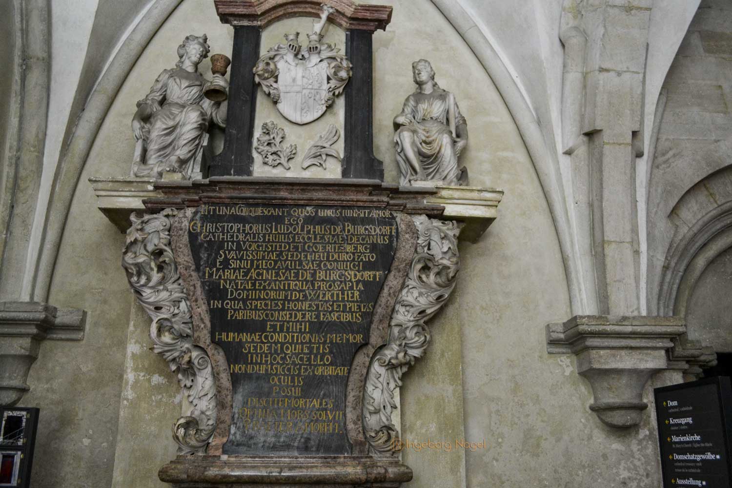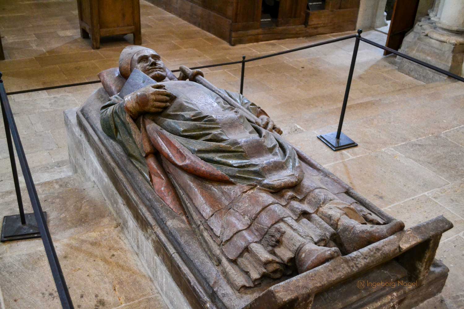 Die Grabplatte eines Naumburger Bischofs stammt ebenfalls aus der Werkstatt dieses Meisters. Sie wurde im 13. Jahrhundert geschaffen und zählt zu den qualitätsvollsten Grabbildnissen.