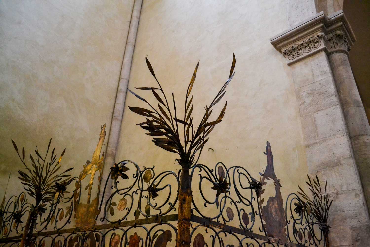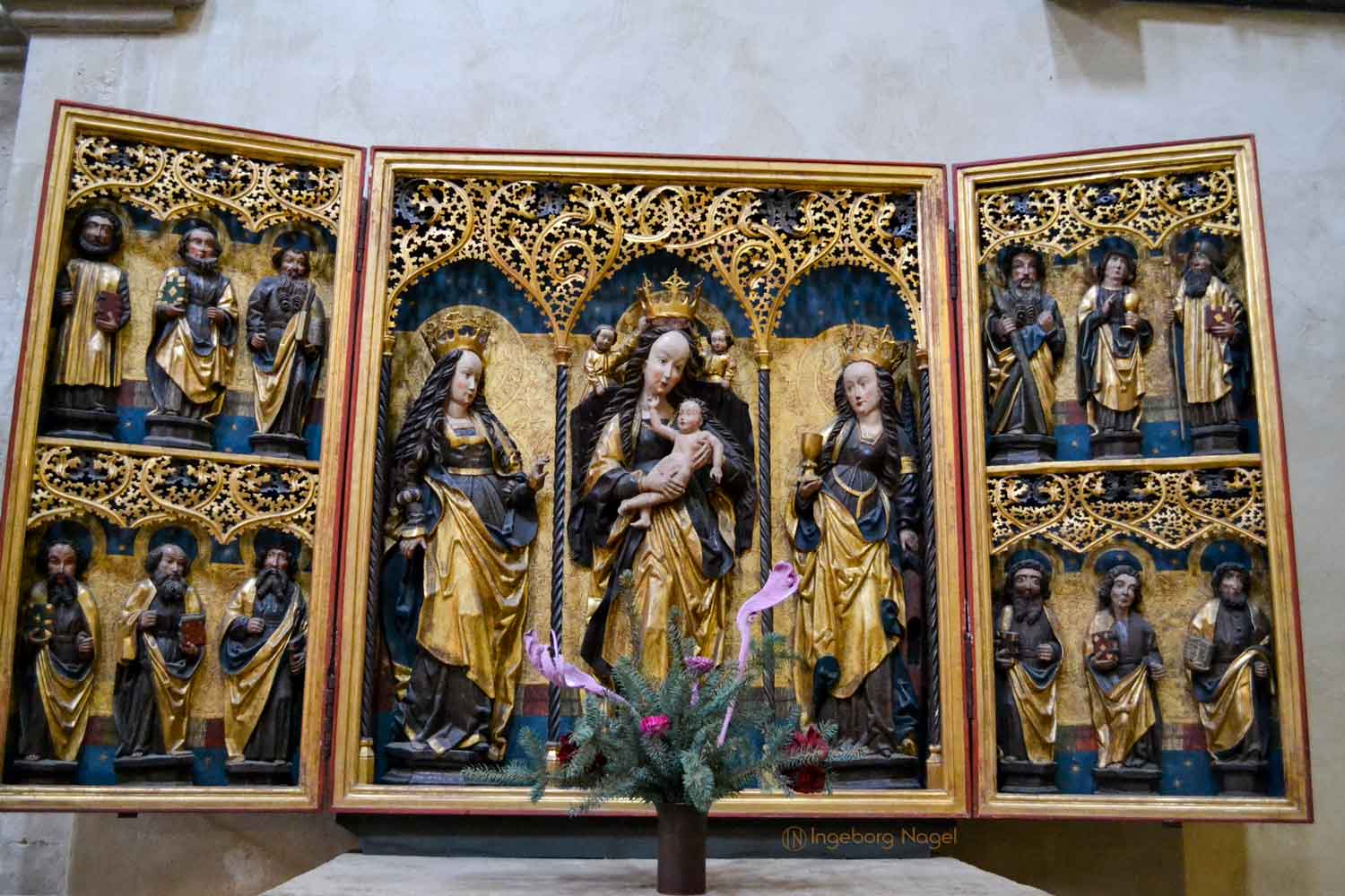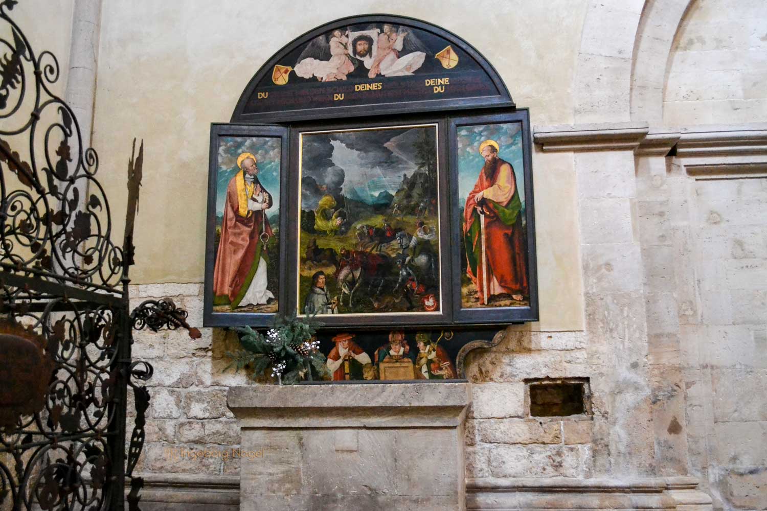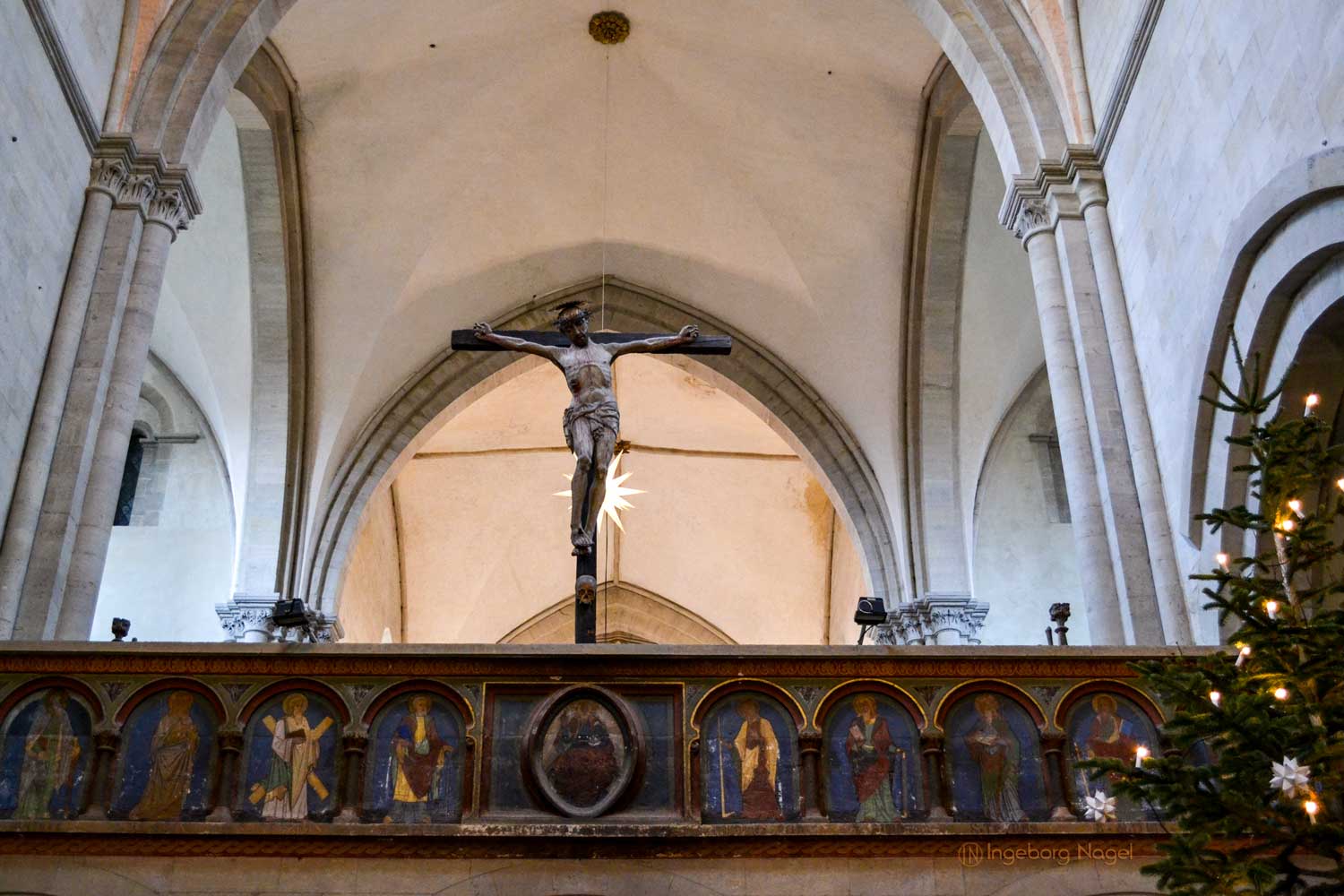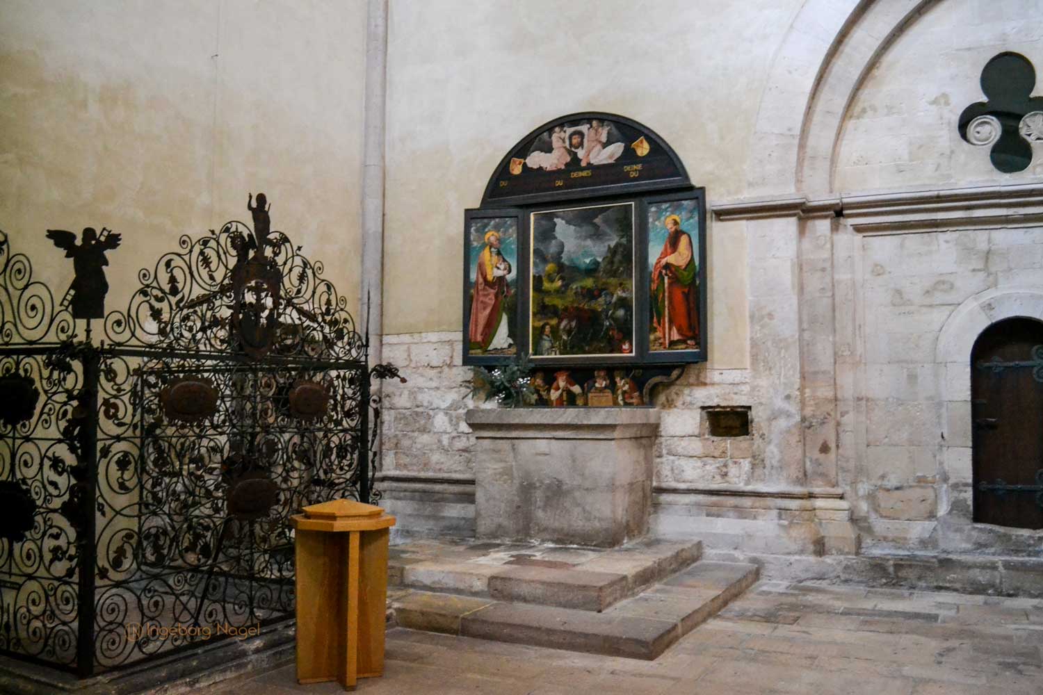 Der Ostlettner im Nauburger Dom ist der älteste deutsche Hallenlettner und entstand im 13. Jahrhundert. Es hat mir keine Ruhe gelassen, was es mit der Gestaltung der drei Joche auf sich hat, die sich doch komplett vom Westlettner unterscheiden. Im mittleren Joch ist ein Altar aus dem 19. Jh., in den beiden Seitenjochen wurden die hölzernen Türen um 1500 mit Malereien der Dompatrone Petrus und Paulus ergänzt. Die Bildfelder an der Lettnerbühne stellen Christus mit den zwölf Aposteln dar. Das Kruzifix auf der Lettnerbühne im spätgotischen Stil ersetzte im 15. Jh. ein älteres Kreuz.