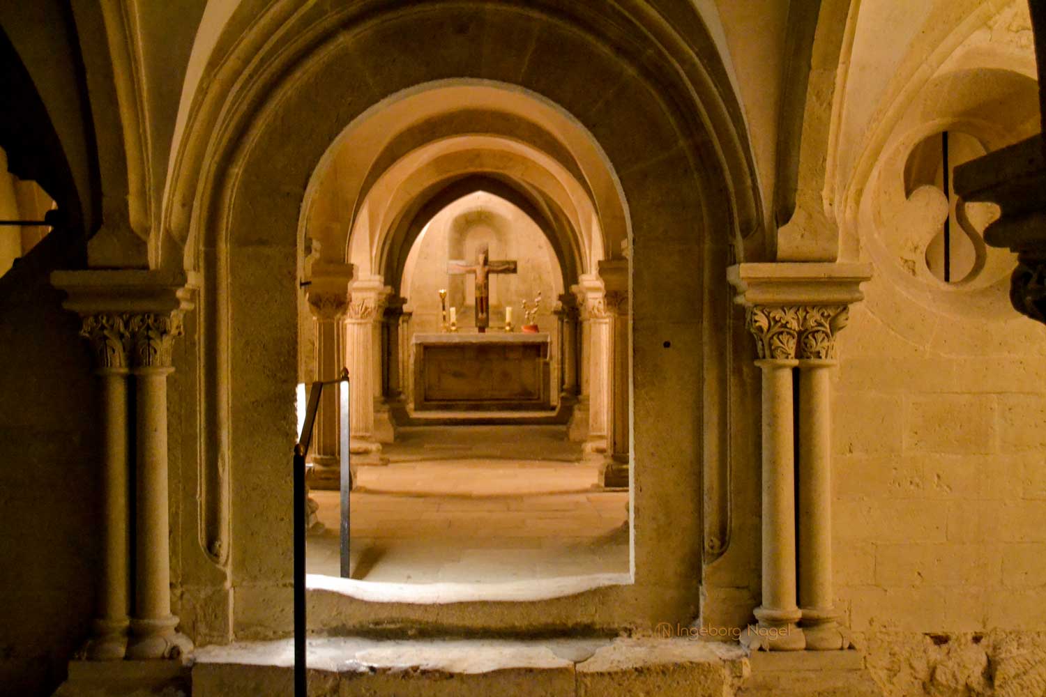 Direkt gegenüber dem Hauptportal führen steinerne Treppen hinunter in die Krypta, deren Geschichte wohl bis heute nicht vollständig klar ist. Durch eine Vorhalle gelangt man in die Krypta. Aufgrund der unterschiedlichen Gewölbe und der Gestaltung der Pfeiler und Säulen ist aber erkennbar, dass es verschiedene Bauzeiten der Krypta gegeben haben muss. Magisch zieht der Godehardaltar von ca. 1170 mit dem hochromanischen Kreuz an, das als einzig erhaltenes Ausstellungsstück aus dem Vorgängerbau stammt.
