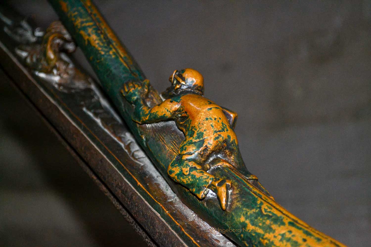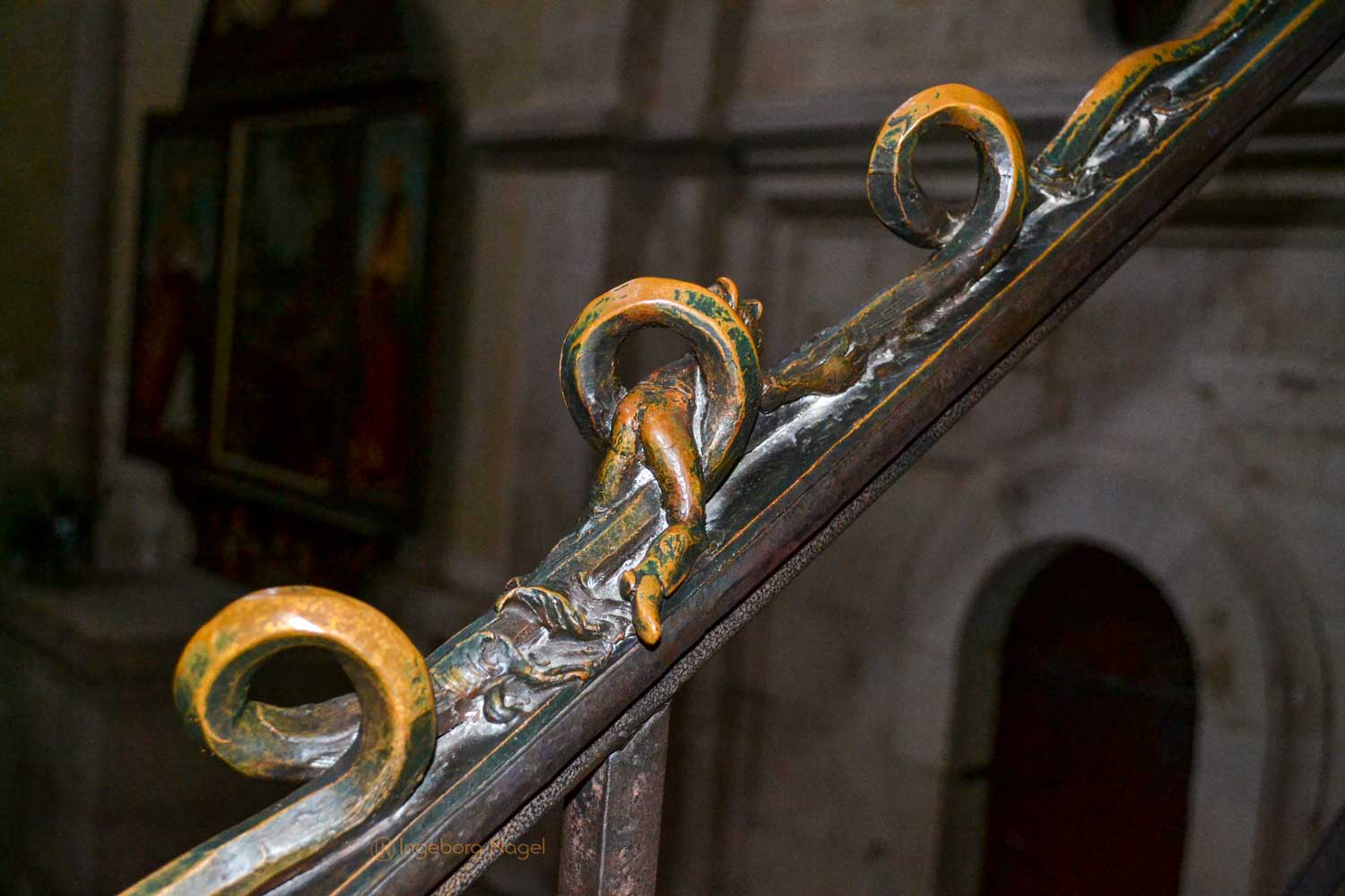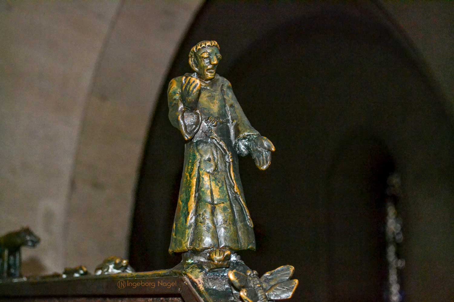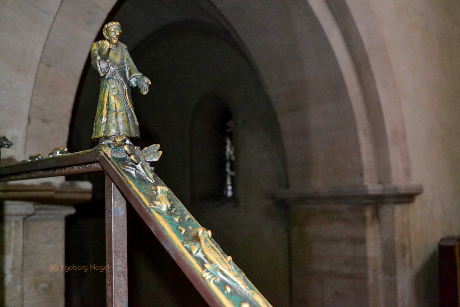 Von beiden Querhäusern geht der Blick nach oben in den Ostchor. Steinerne Stufen führen hinauf und ich war fasziniert über die beiden bronzenen Handläufe, die in den 70er und 80er Jahre von Heinrich Apel geschaffen wurden. Auf der Nordseite werden Szenen von "Der schmale Pfad ins Paradies" (teilweise auch ironisch dargestellt) gezeigt, auf der Südseite ist der "Hl. Franziskus der zu den Tieren predigt" dargestellt. Ich war begeistert ....