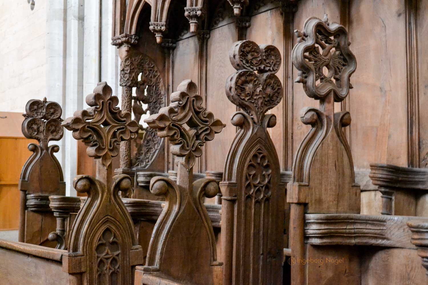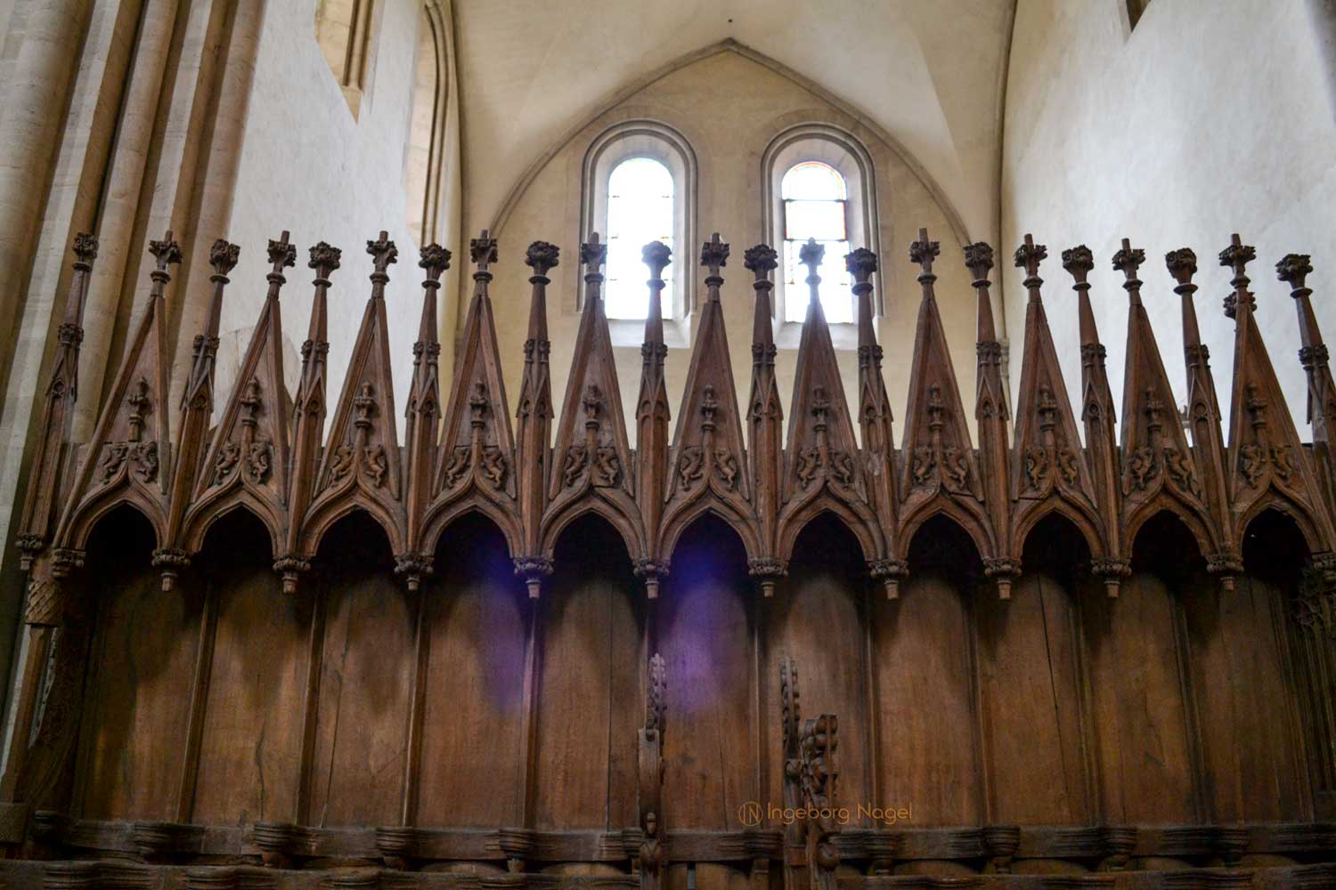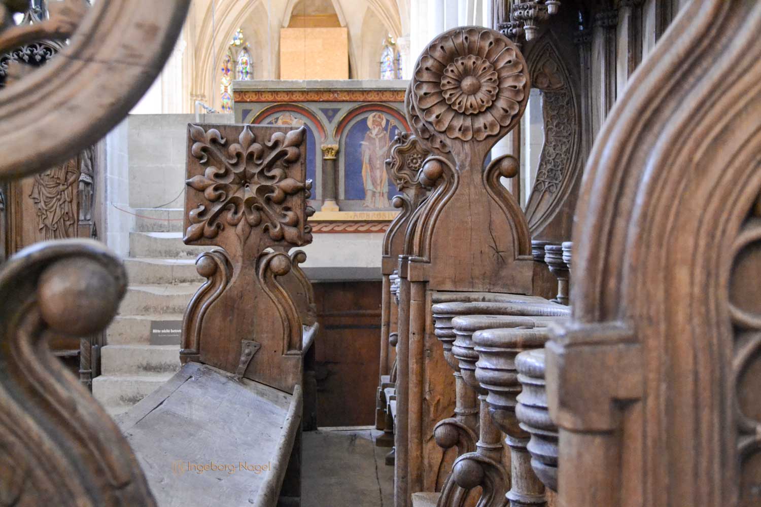 Beeindruckend finde ich das Chorgestühl des Ostchors. Aufgrund der Vergrößerung der Geistlichen wurde das anfänglich geschaffene Chorgestühl aus dem 13. Jahrhundert im 14. Jahrhundert umfangreich auf 42 Stallungen erweitert. Da der Ostchor ja das liturgische Zentrum des Dom war, trafen sich die Domherren und Vikare an oft bis zu acht Terminen am Tag und in der Nacht zu gemeinsamen Gebeten und Gesängen.