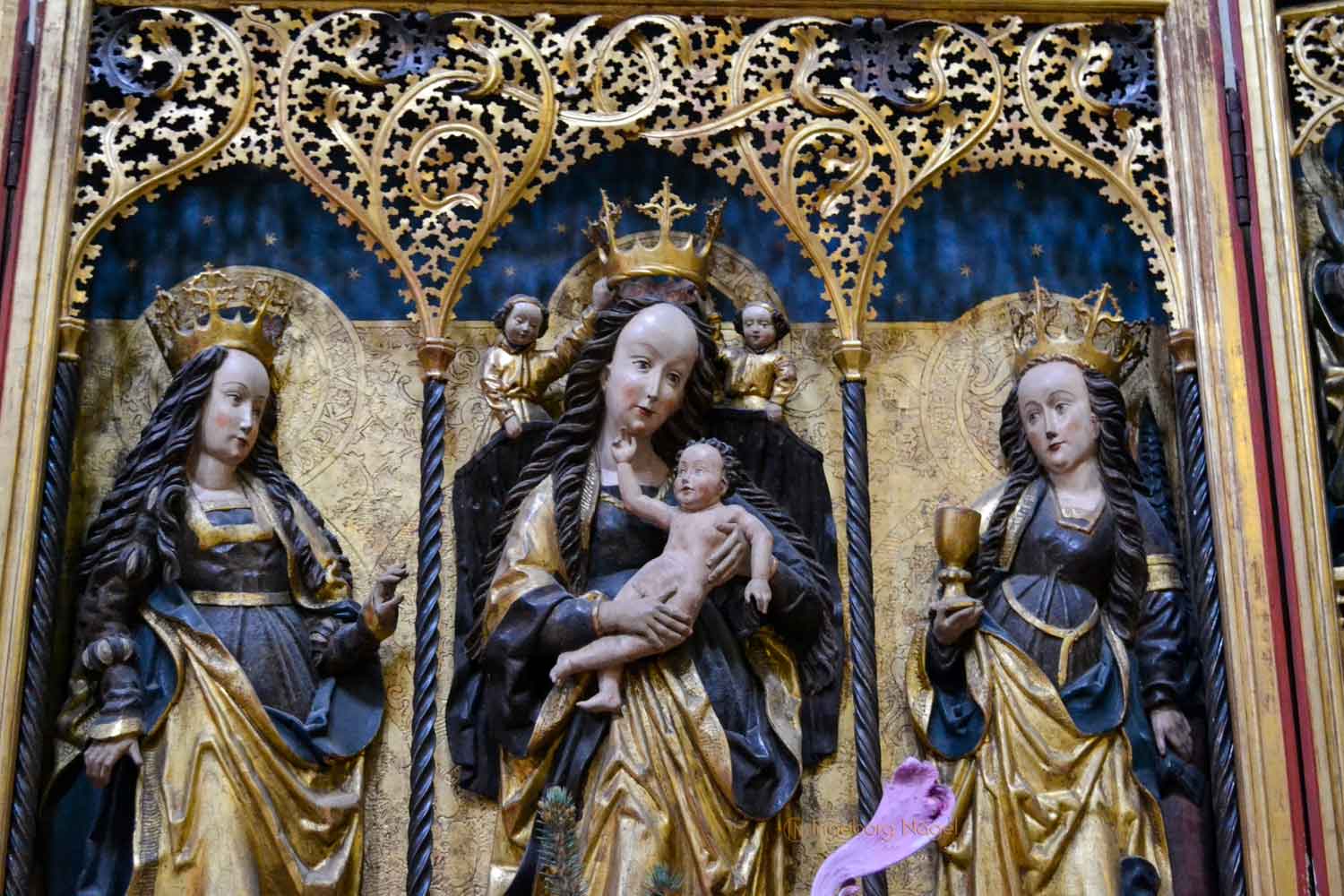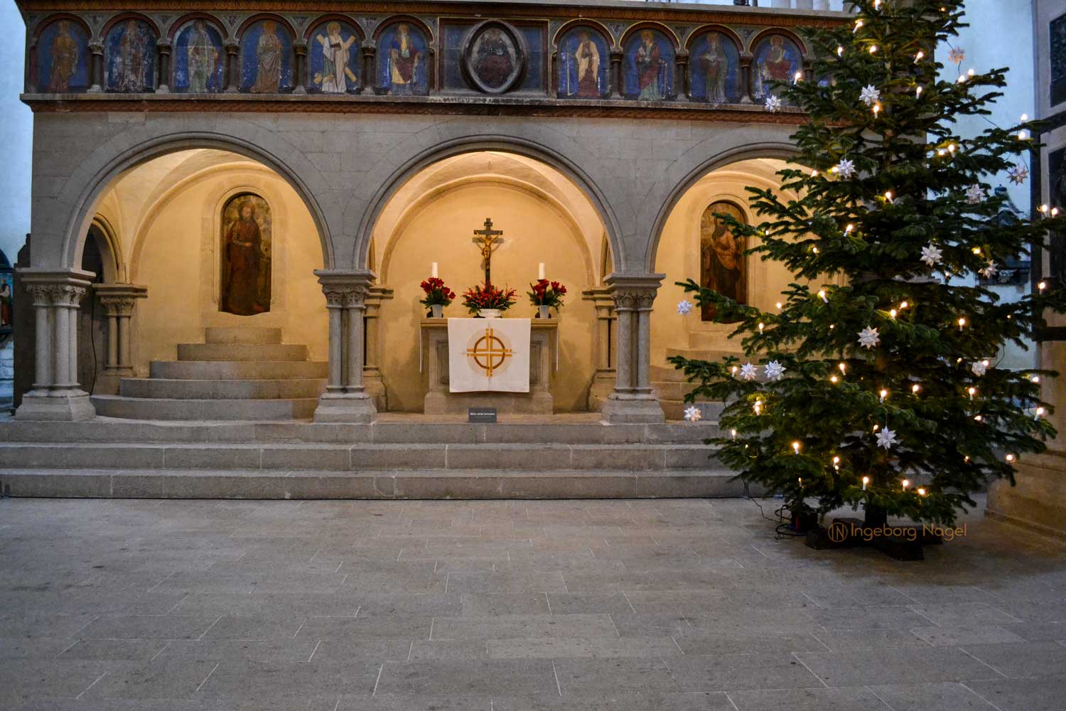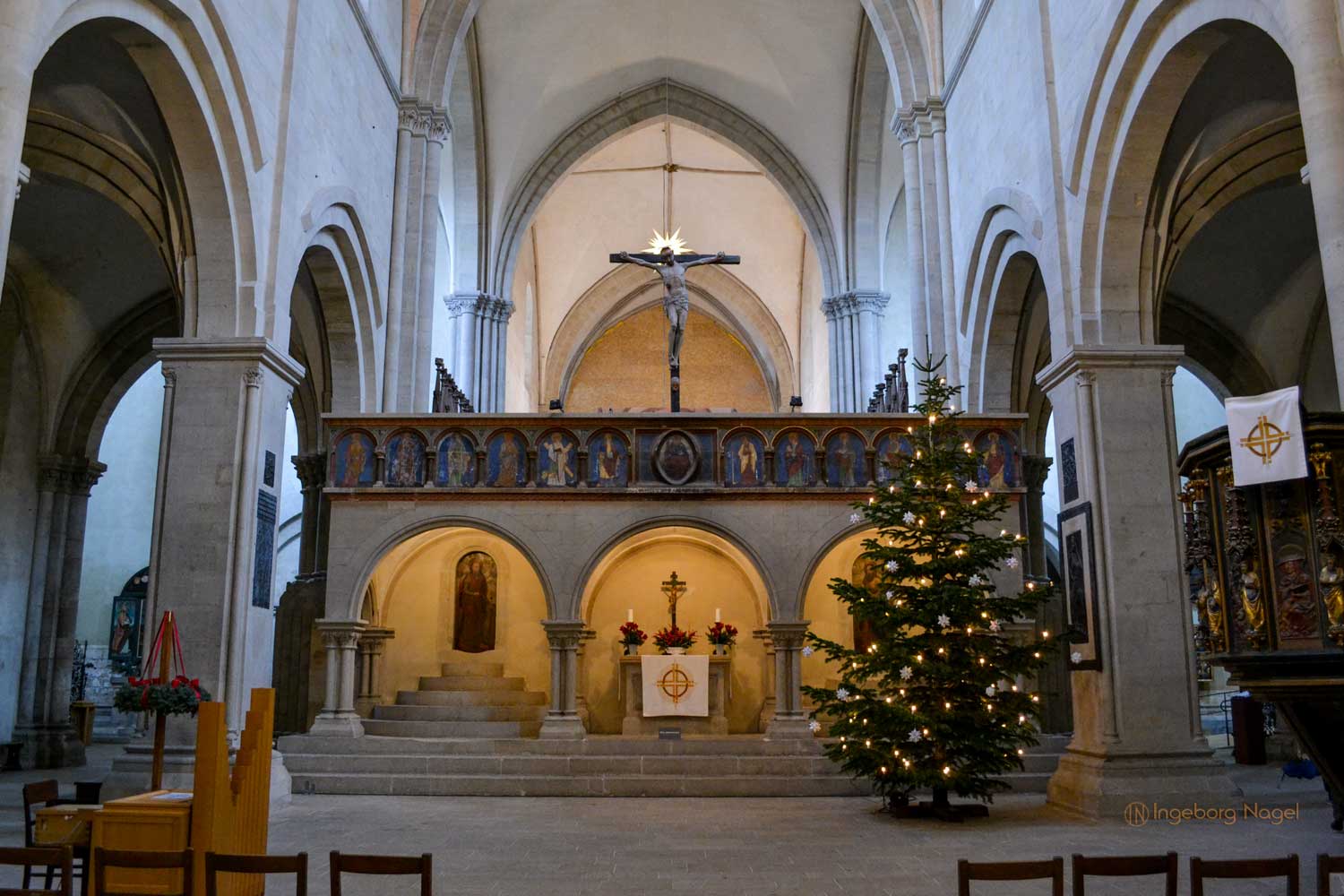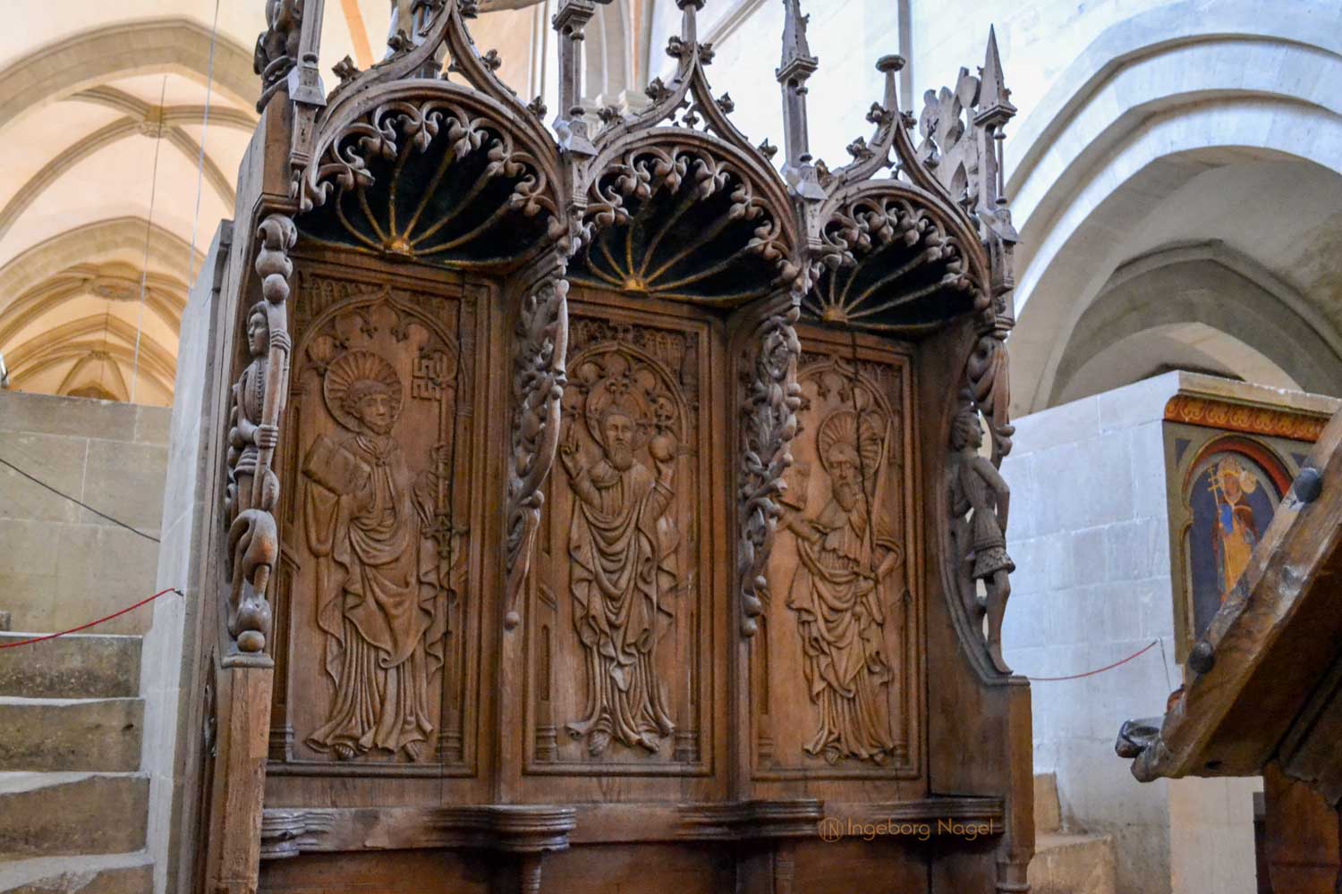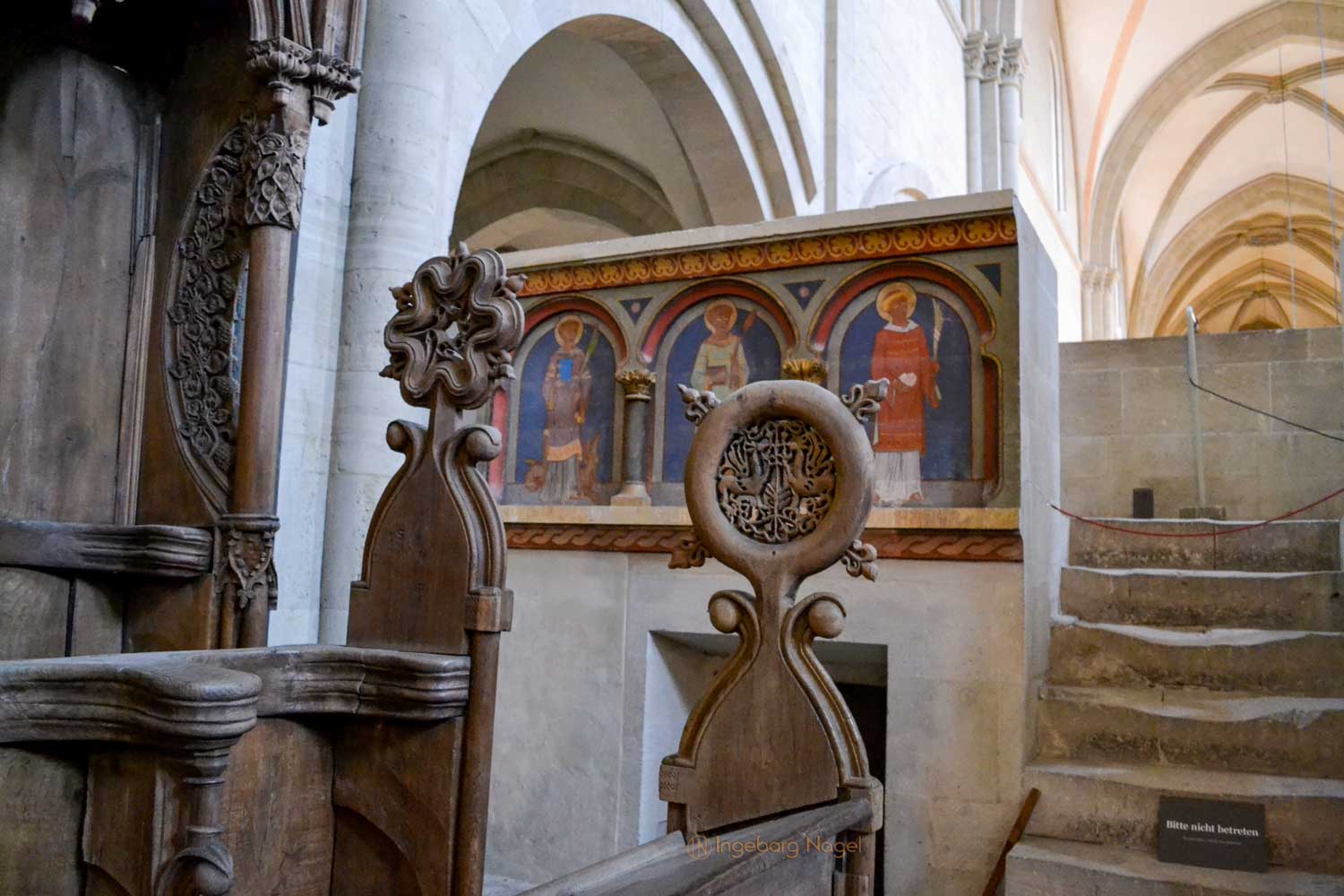 Oben im Ostchor angekommen geht mein Blick erst einmal ringsum. Zwei Stilrichtungen, Romanik und Gotik verbinden sich in diesem Zentrum der Liturgie. Leider war der Hauptaltar zu Restaurationszwecken abgebaut 🙁