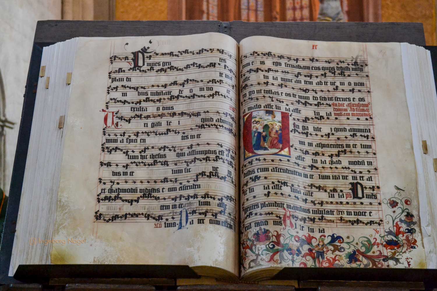 Dazu gehören auch die riesigen Lesepulte in Form von Taubenhäusern, auf denen einst die großen Chorbücher lagen. Die Handschrift die heute auf dem Pult liegt ist nur eine Nachbildung. Sie vermittelt aber anschaulich den Eindruck dieser Prachthandschriften, mit einem Gewicht von bis zu 45 kg, die zu den größten mittelalterlichen Büchern der Welt zählen.