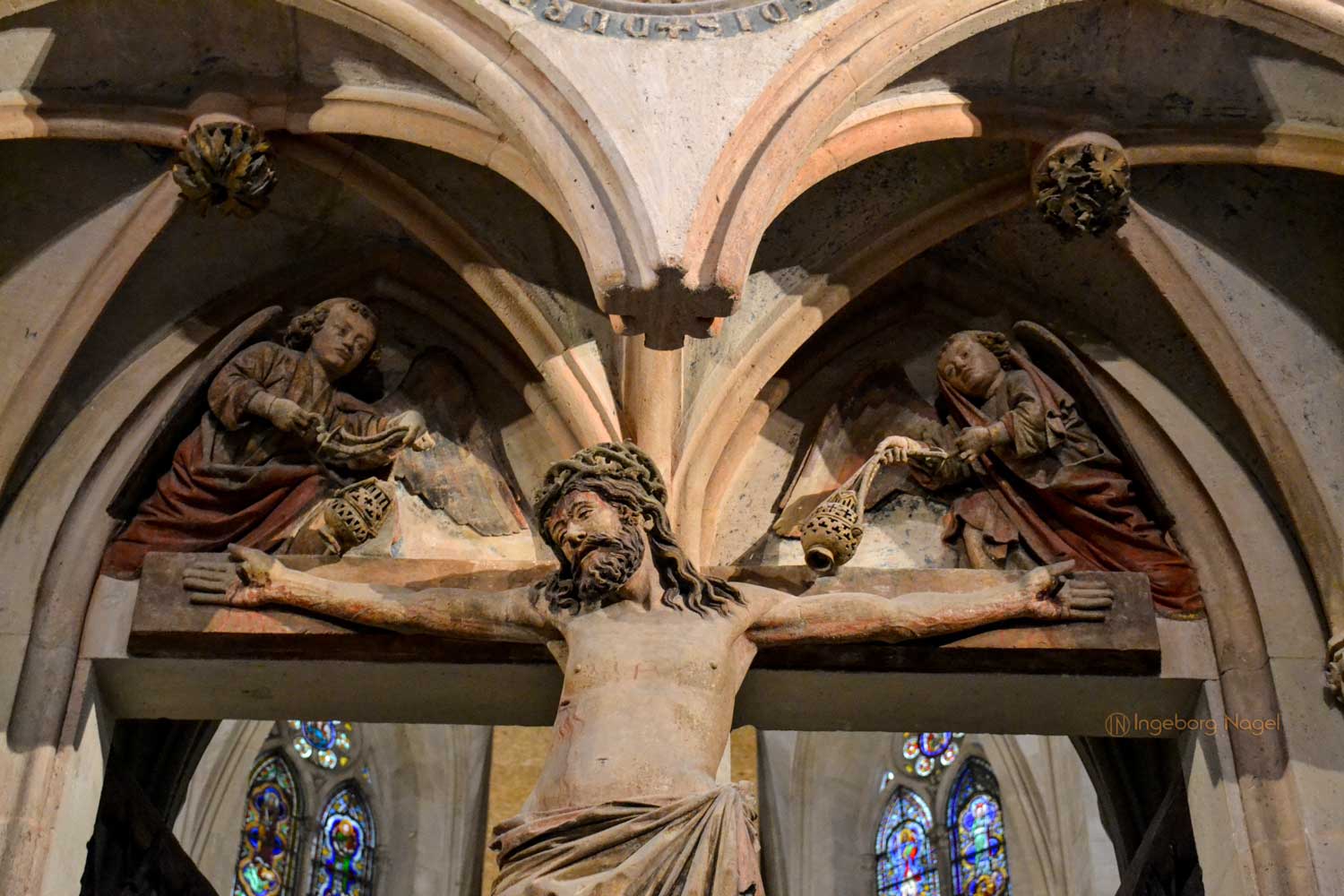 Die schmerzverzogenen Gesichter Marias und des Lieblingsjüngers Johannes, Christus selbst .... und die beiden Engel über ihm. Weihrauchschwenkend auf die Auferstehung verweisend.