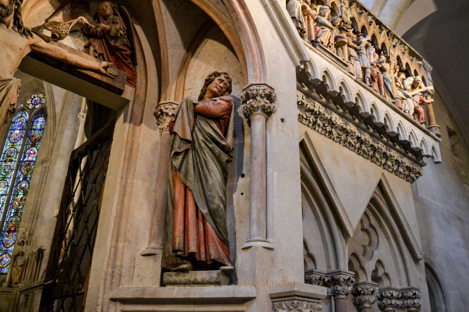 Jeder Besucher der weiter in den Westchor möchte, muss rechts oder links an dieser Kreuzigungszene vorbei. Jetzt stelle man sich hier die Menschen aus dem 13. Jh. vor, in ihrer Religiosität und mit dieser Darstellung?! Emotional wohl sehr bewegend. Auch wenn ich mich jetzt nicht als 'tiefgläubig' zähle (darüber könnte man mit mir sehr lange, oder auch nicht, diskutieren, wie meine Vorstellung von 'Glaube' ist) - es hat mich tief beeindruckt. Vor allem die Art und Weise der Darstellung, und wie dies zu dieser frühen Zeit so anschaulich umgesetzt wurde. Dieser Bildhauer verdient es wahrlich 'Meister' genannt zu werden.