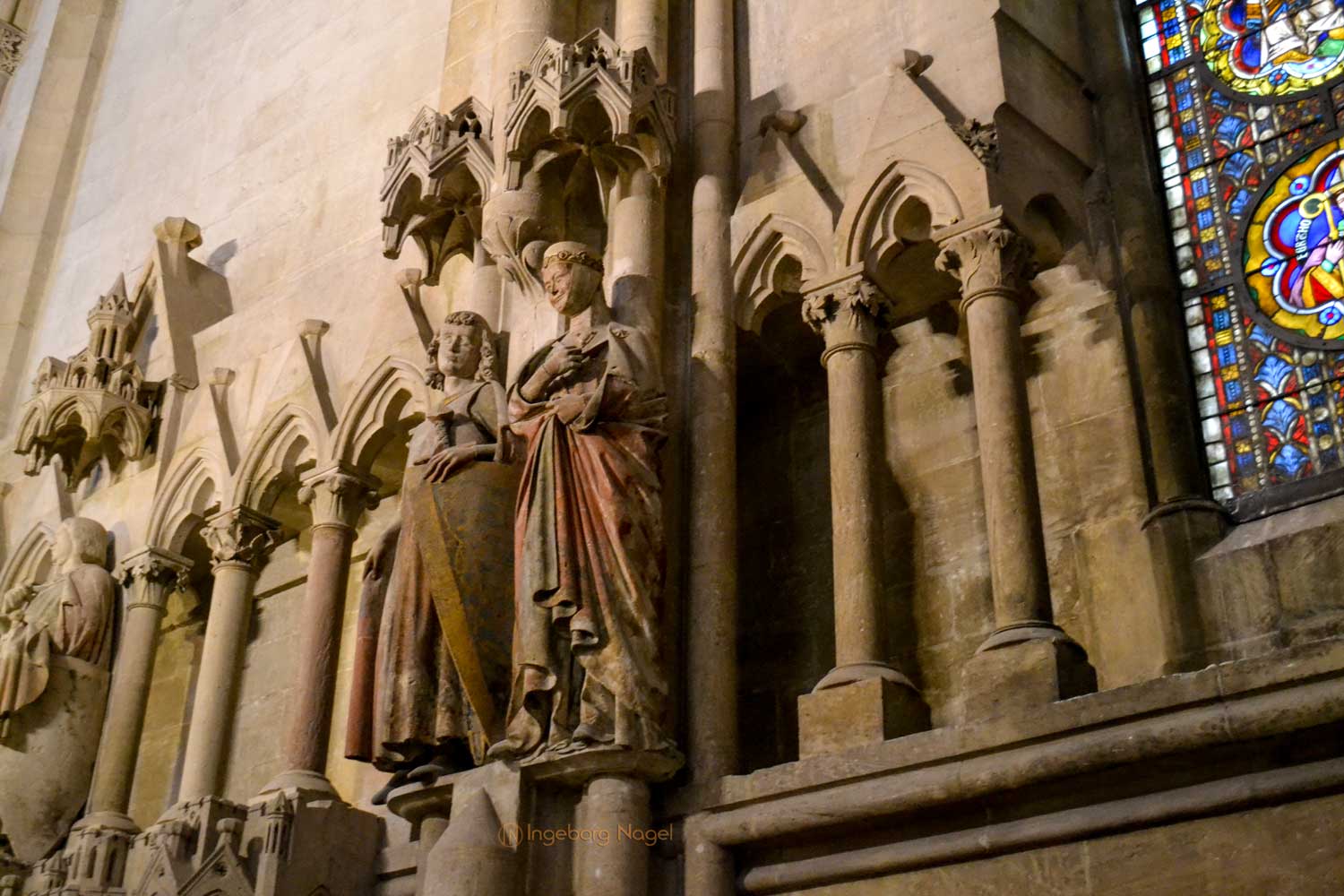 Jetzt kommt das weitere 'Highlight' im Westchor - die 12 Stifterfiguren. Es sind die wohl bekanntesten Statuen der deutschen Gotik. Aus einer Urkunde von 1249 geht hervor, dass sie die Stifter der rersten Naumburger Bischofskirche waren. Eine Gruppe prominenter Adeliger, acht Männer und vier Frauen, die in der ersten Hälfte des 11. Jahrhunderts durch umfangreiche Schenkunden so zum Bau der ersten Naumburger Kathedrale beigetragen haben. Wer jetzt glaubt, dass sie dem Bildhauer Model gestanden haben, täuscht sich. Nur anhand von historisch belegten Details wurden sie vom Bildhauer erschaffen.