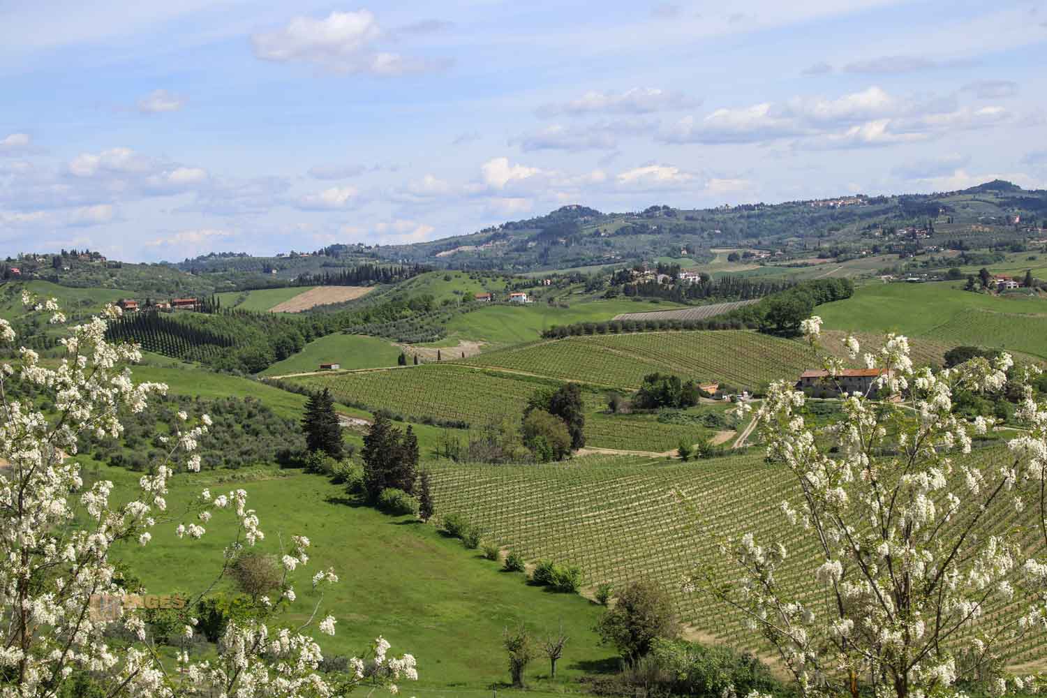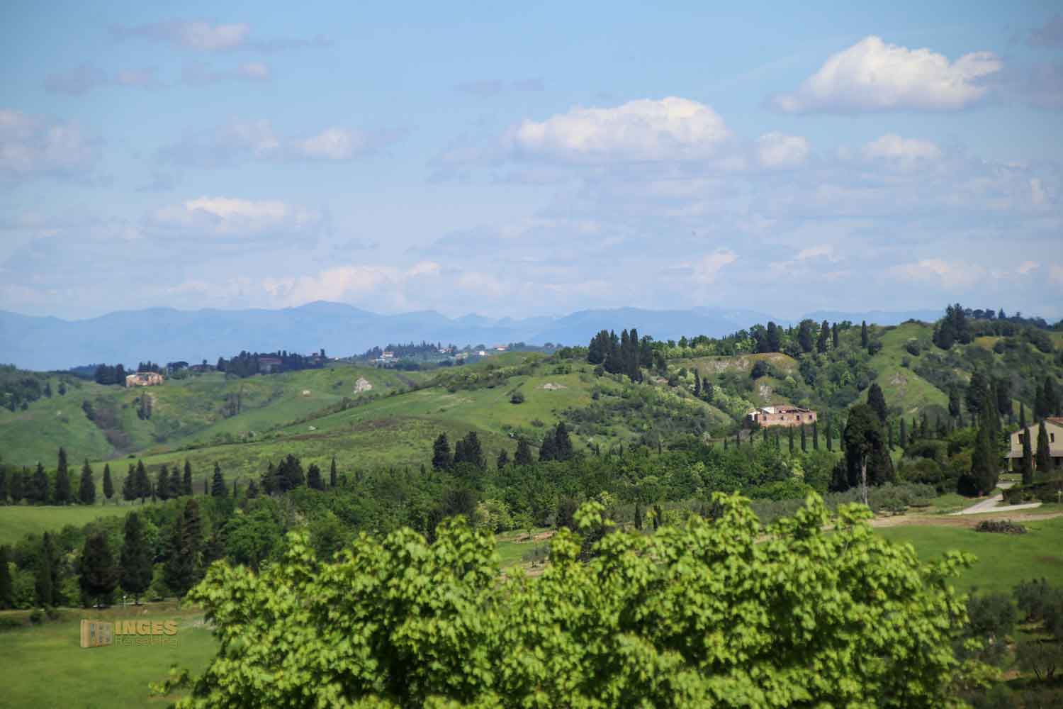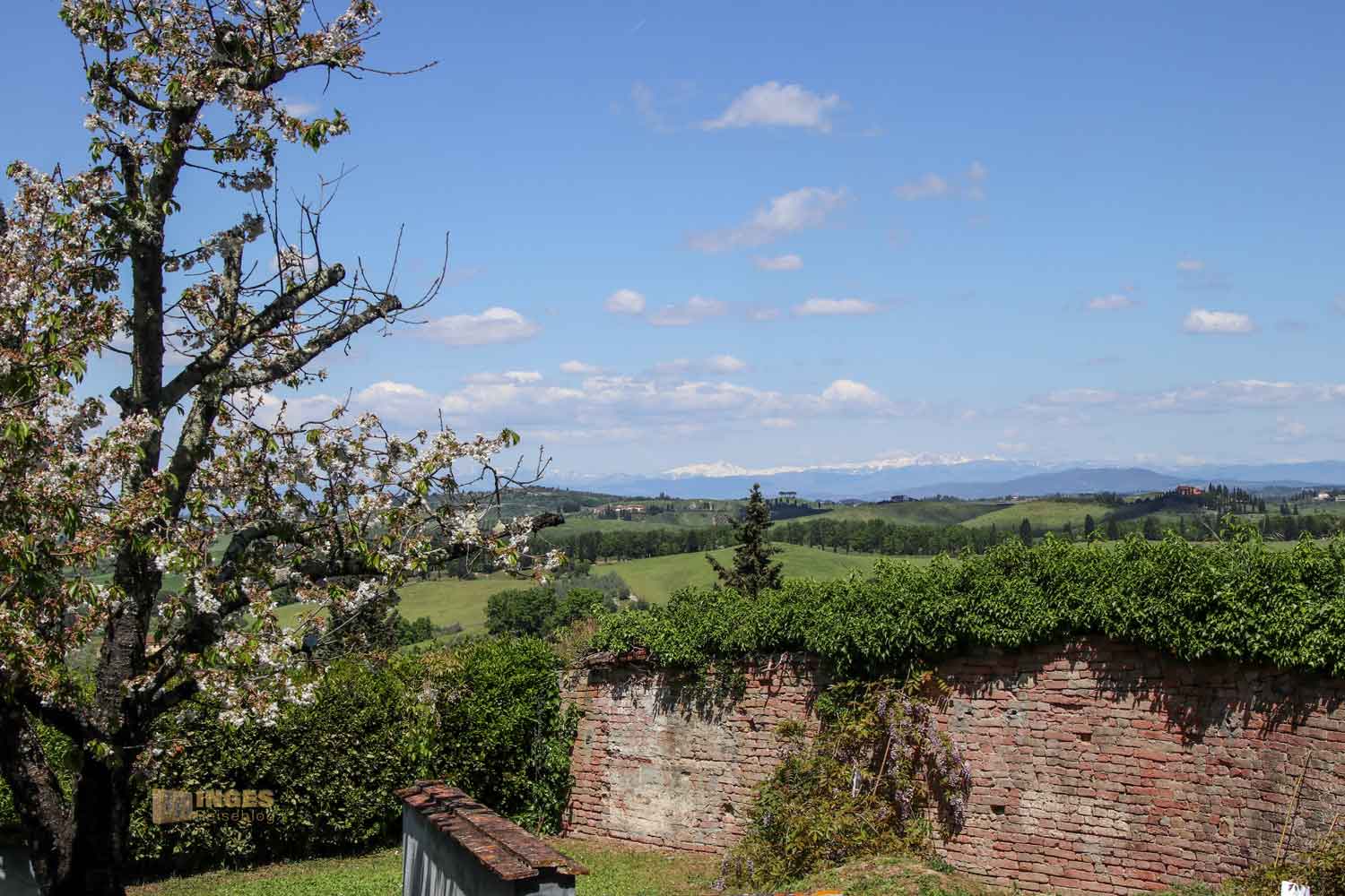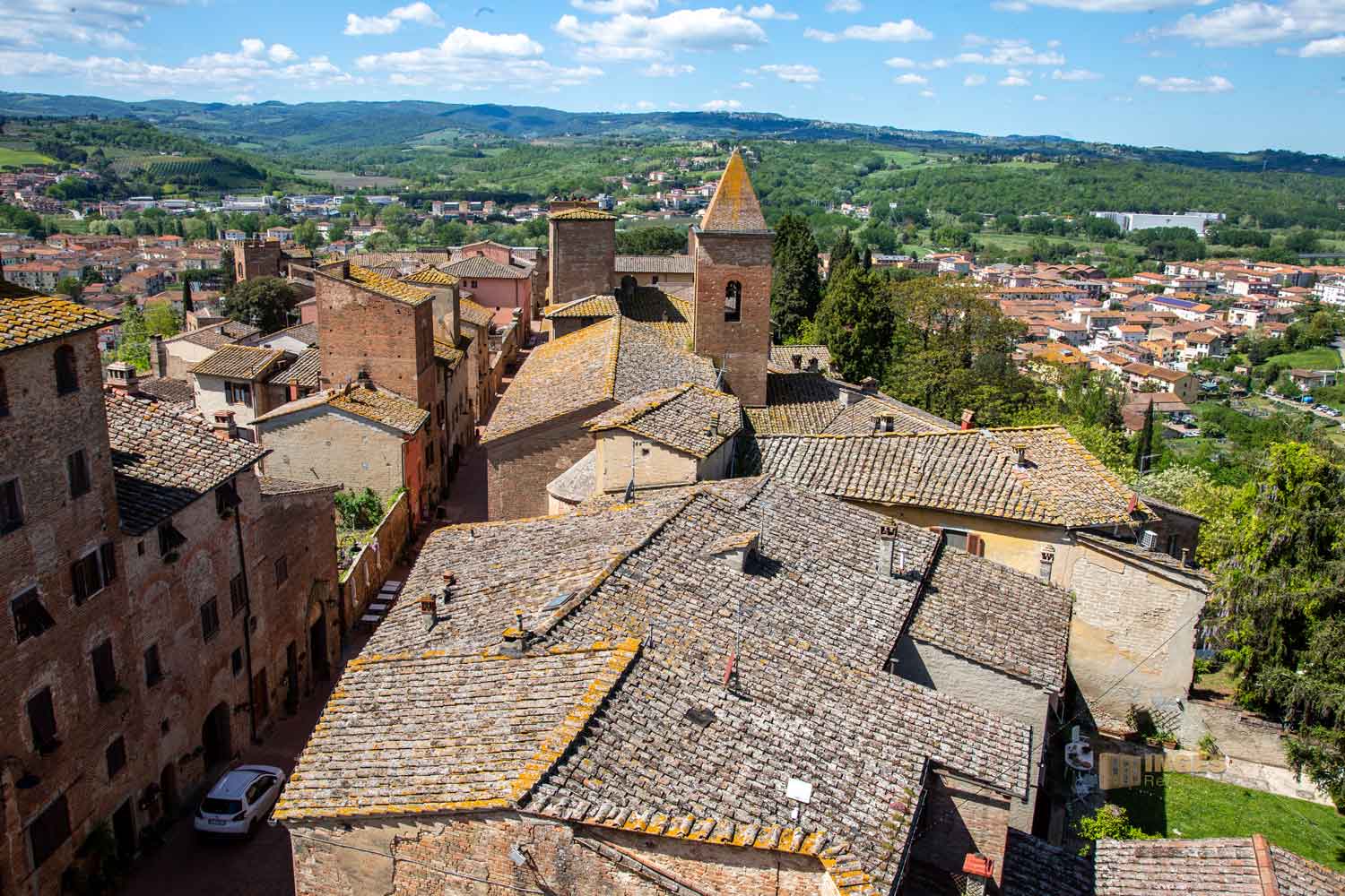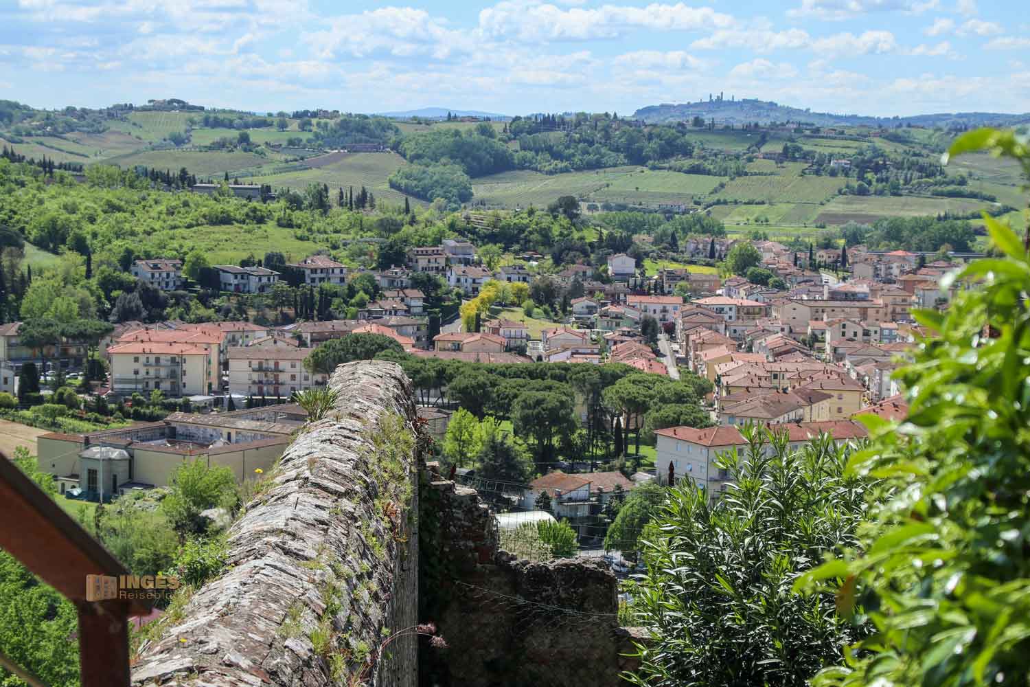 die nicht nur die abwechslungsreiche Landschaft im Val d'Elsa zeigen. Ein Blick geht über die Stadt hinüber zu San Gimignano, ganz unverkennbar an den vielen Geschlechtertürmen zu erkennen. Ein Blick geht nach Norden, weit hinter Pisa und Lucca, wo man die Berge des Apennin erkennen kann.