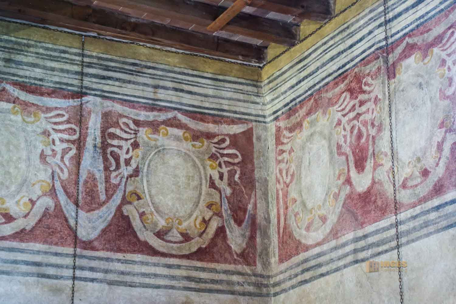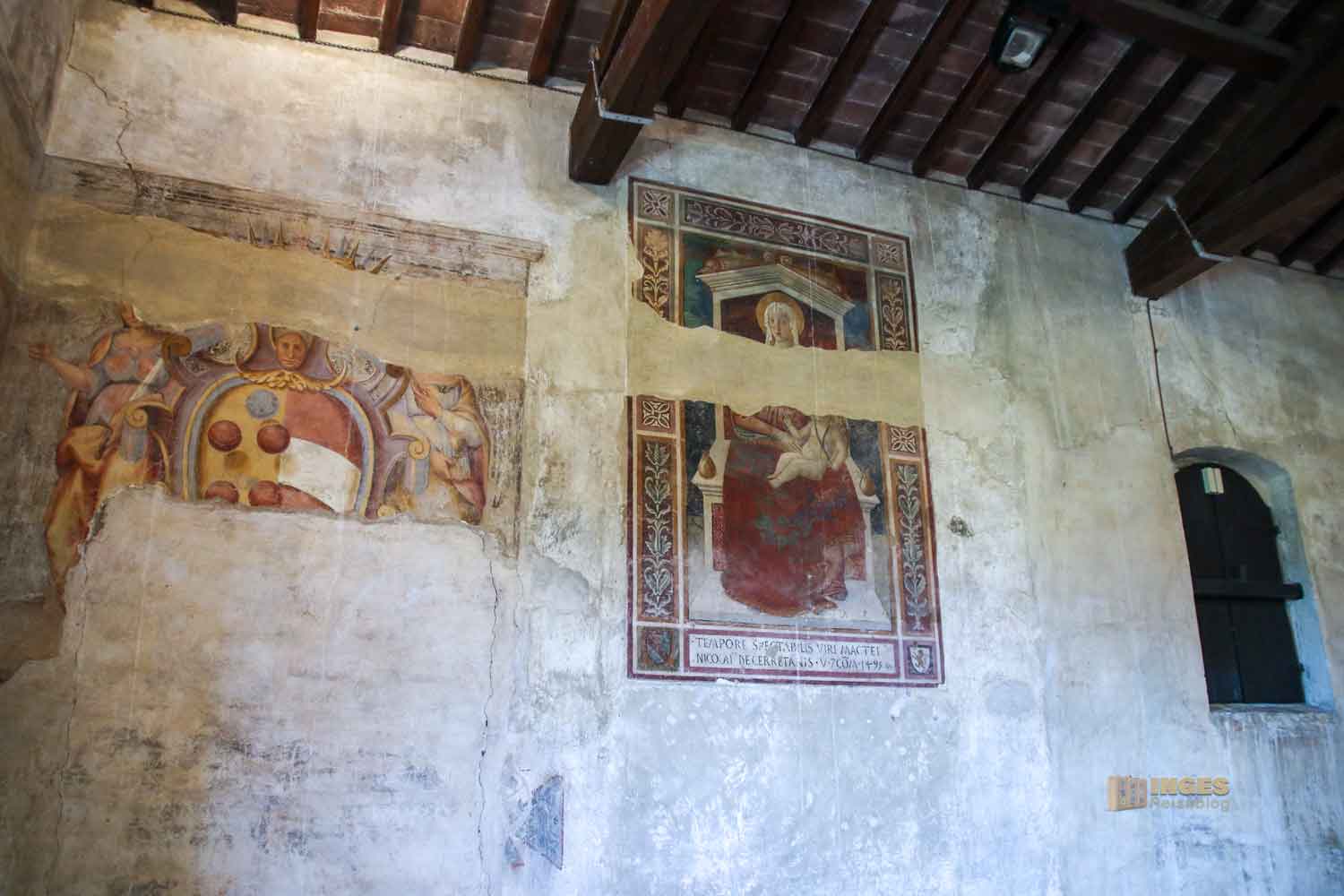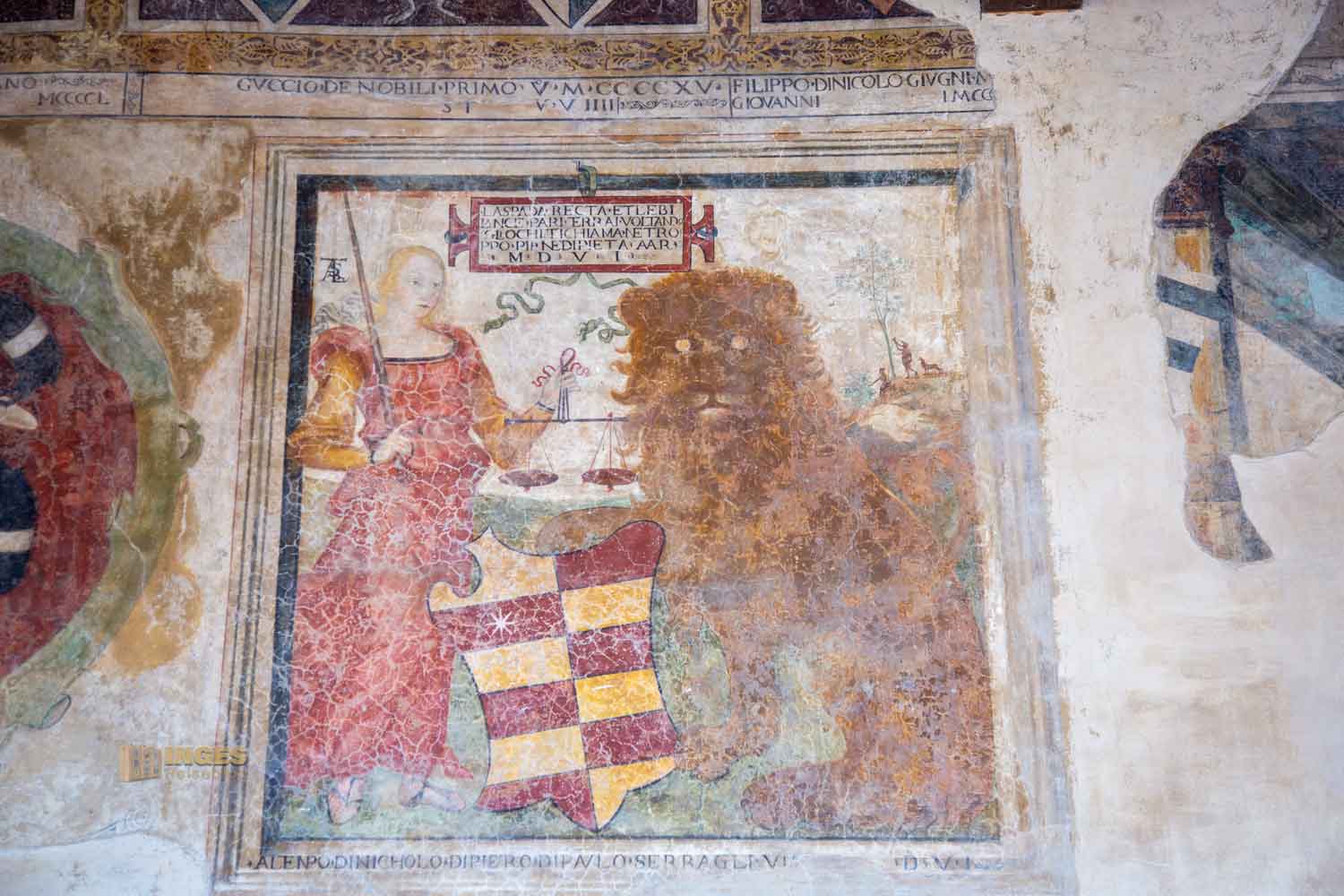 Die Wandfresken stammen aus Ende des 15. Jahrhunderts. Allesamt sollen sie die Tugenden eines Pfarrers symbolisieren, die der für eine gute Führung seiner Schäfchen benötigt: Schutz, Nächstenliebe und Gerechtigkeit. Auch der Schutzpatron der Hauptstadt Florenz ist hier symbolisiert, schließlich untersteht der Vikar, wie auch Certaldo unter deren Herrschaft.