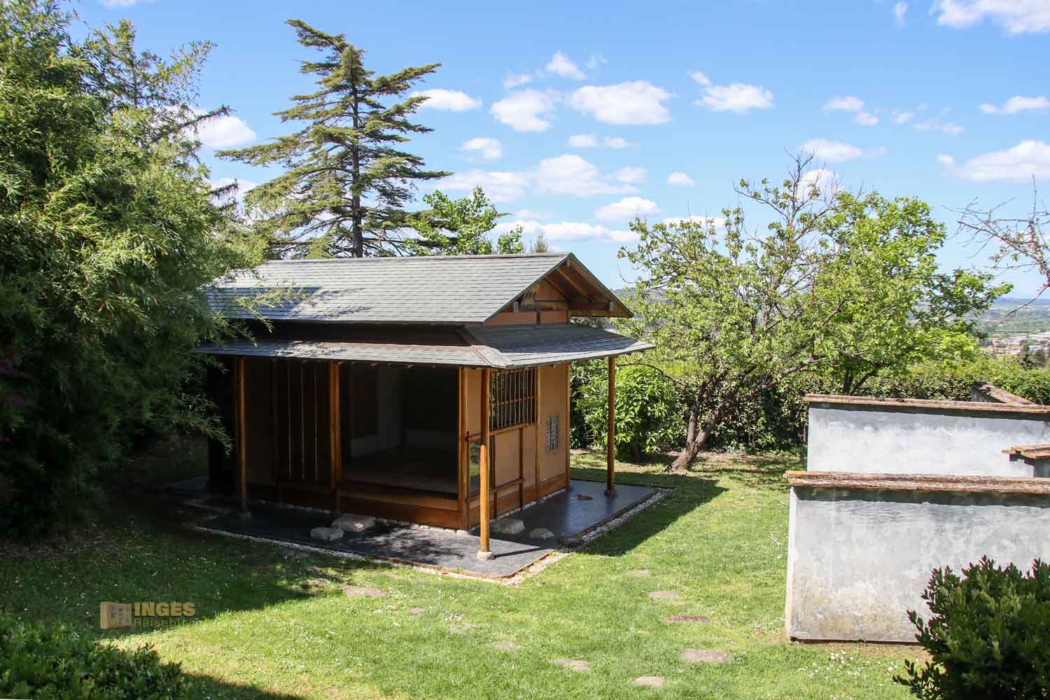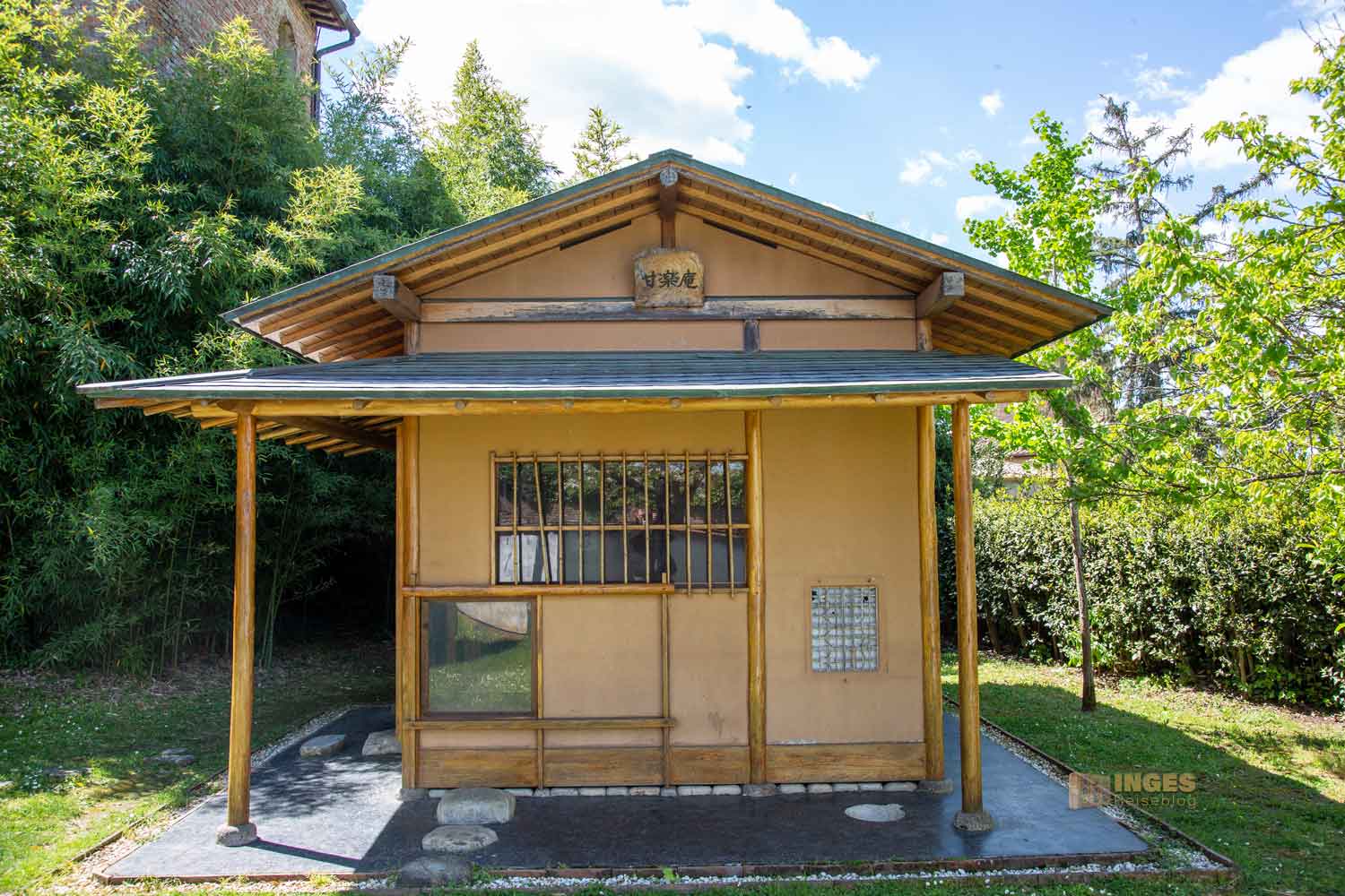 Fragend warf ich meinem Mann einen Blick zu. Was tut ein japanisches Teehaus in so einem mittelalterlichen Gemäuer? Eine Tafel erklärt es: 1993 wurde Certaldo von der Partnerstadt Kanramachi in Japan das Teehaus gespendet. Wo sonst im Ort hätte man es einfügen sollen? Also fand es seinen Platz in dem kleinen Garten.