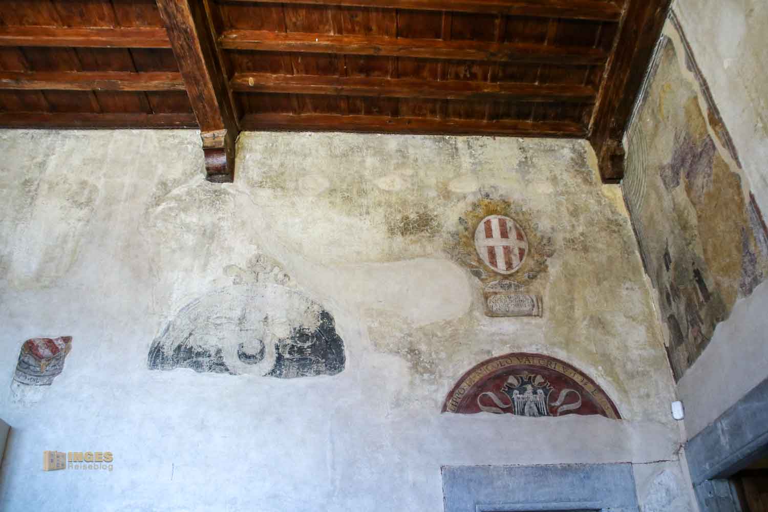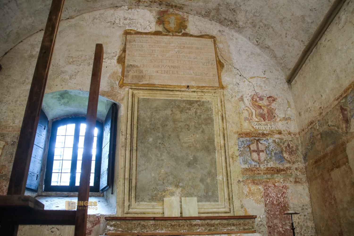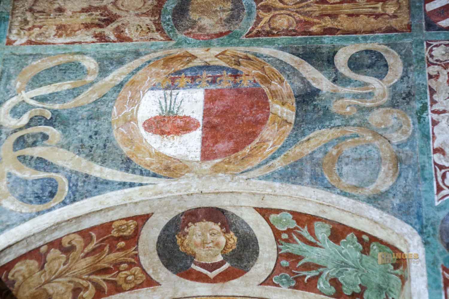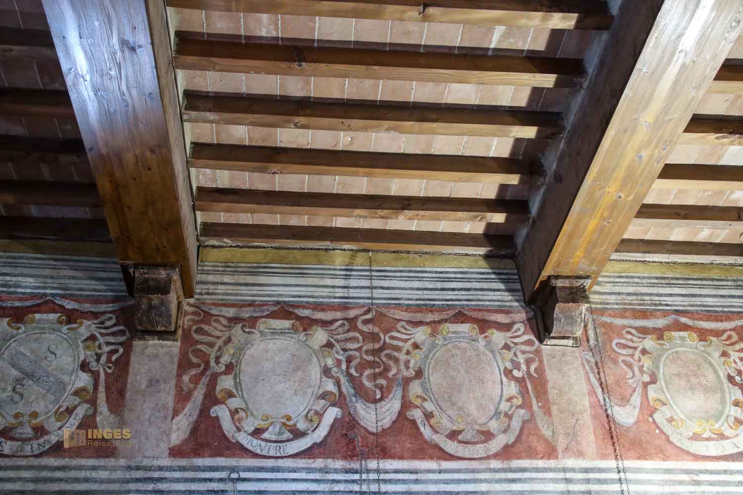 Kein Anfangsbau ist für die Ewigkeit, auch eine Burg oder ein Palazzo nicht. Anfang des 15. Jahrhunderts wurde hier großzügig erweitert, und der Vikar bekam seine private Kapelle. Die nützte er aber nicht für das Gebet, sondern auch um sich mit den Bürgermeistern seines Vikariats zu treffen. Die Wappen an den Wänden verdeutlichen, wer dazu gehörte.