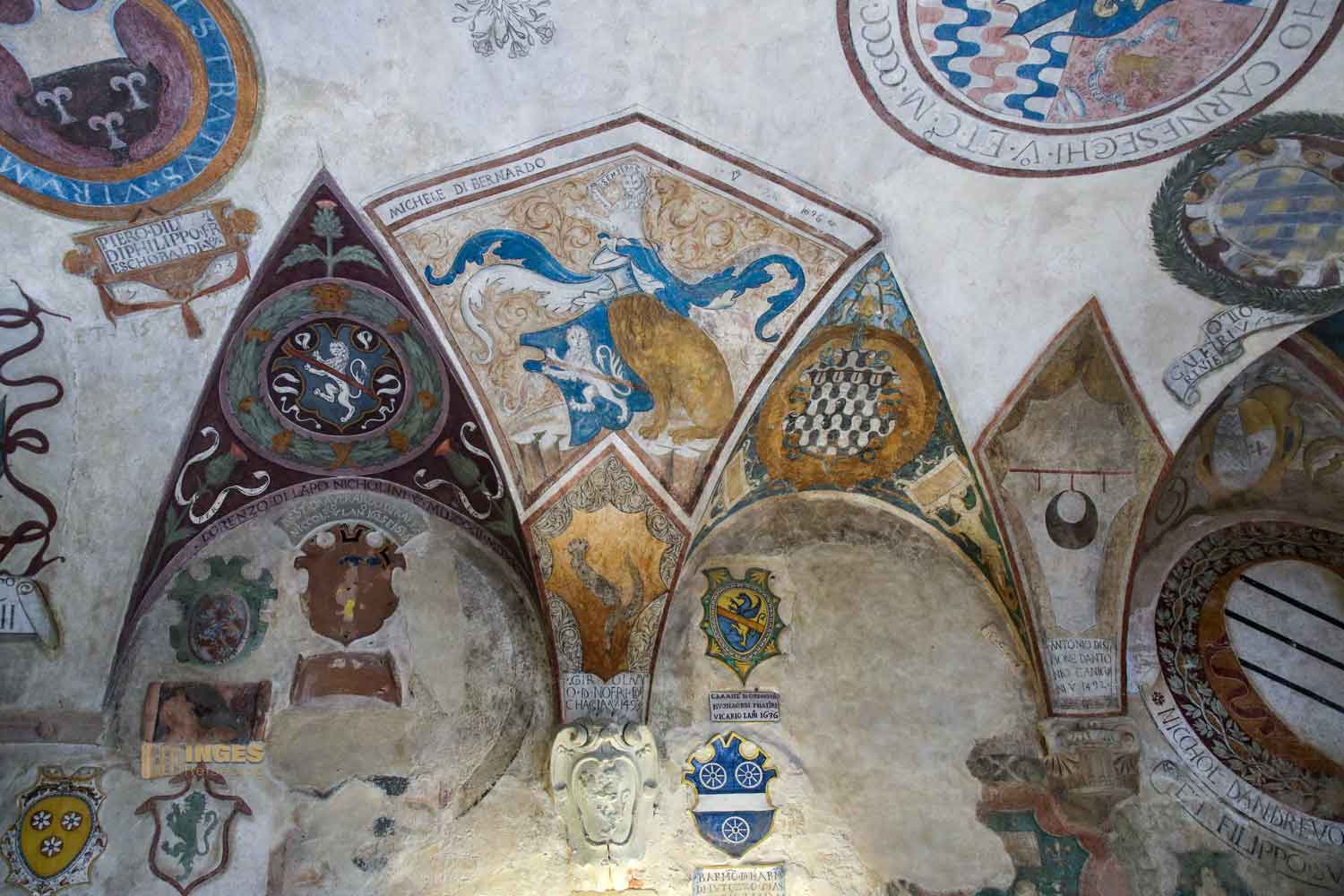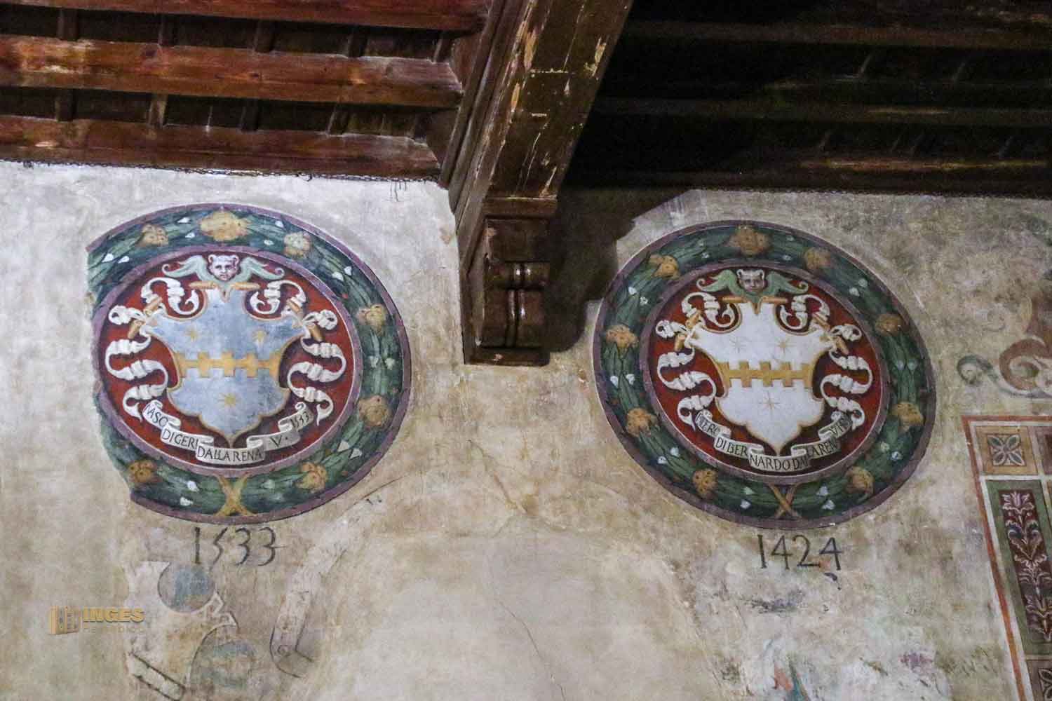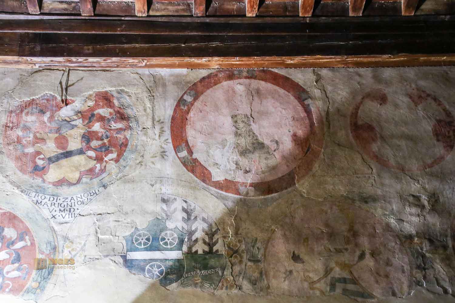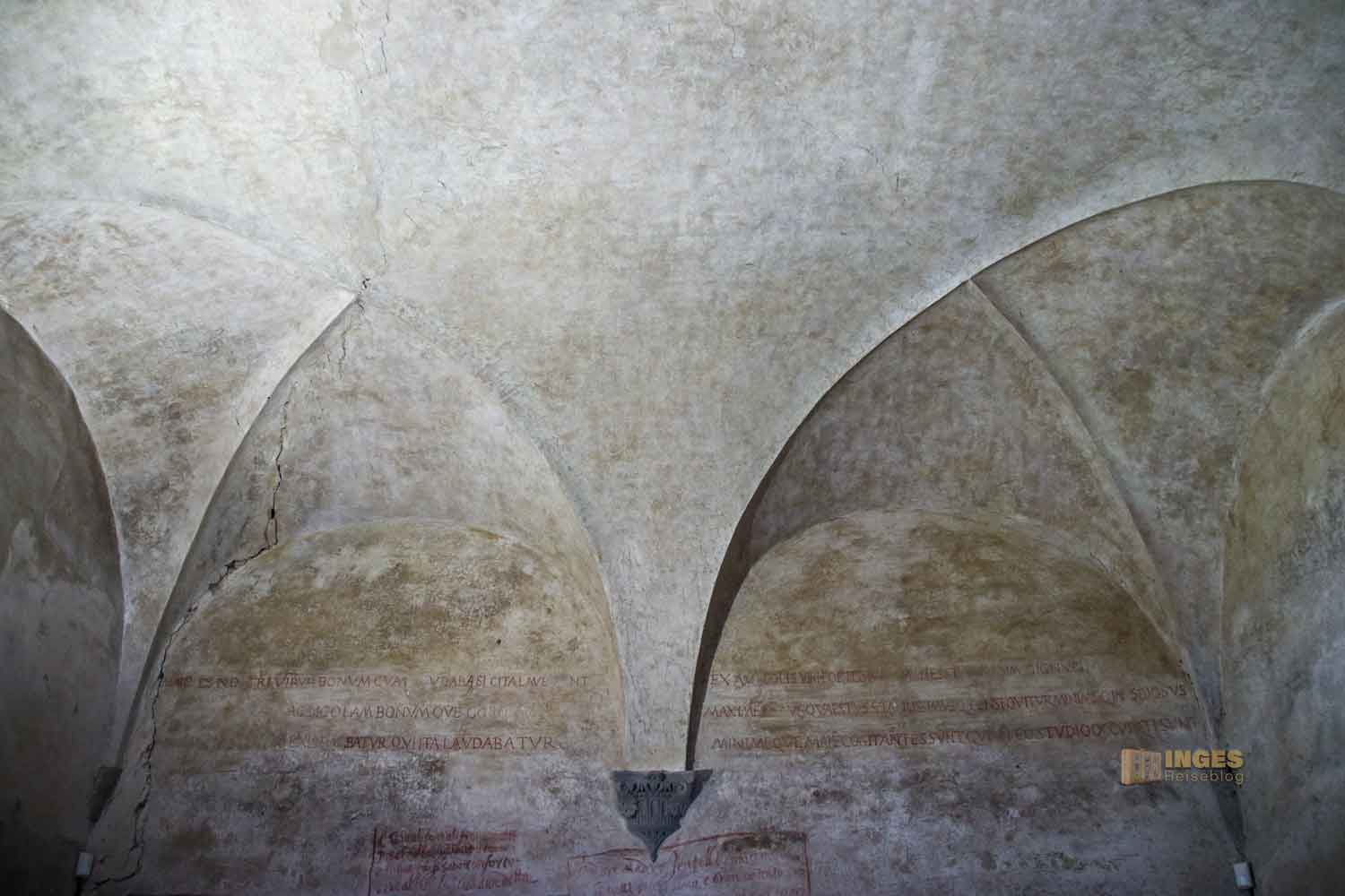 Kein Anfangsbau ist für die Ewigkeit, auch eine Burg oder ein Palazzo nicht. Anfang des 15. Jahrhunderts wurde hier großzügig erweitert, und der Vikar bekam seine private Kapelle. Die nützte er aber nicht für das Gebet, sondern auch um sich mit den Bürgermeistern seines Vikariats zu treffen. Die Wappen an den Wänden verdeutlichen, wer dazu gehörte.