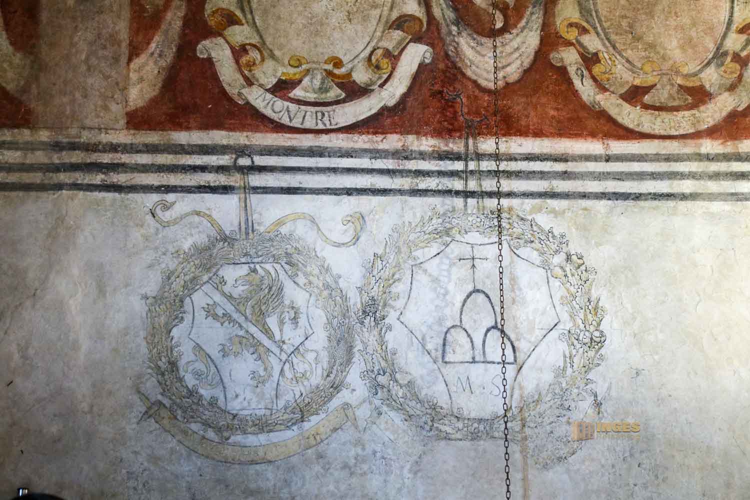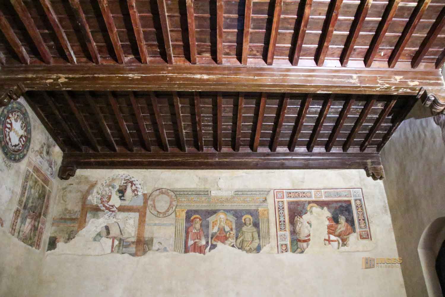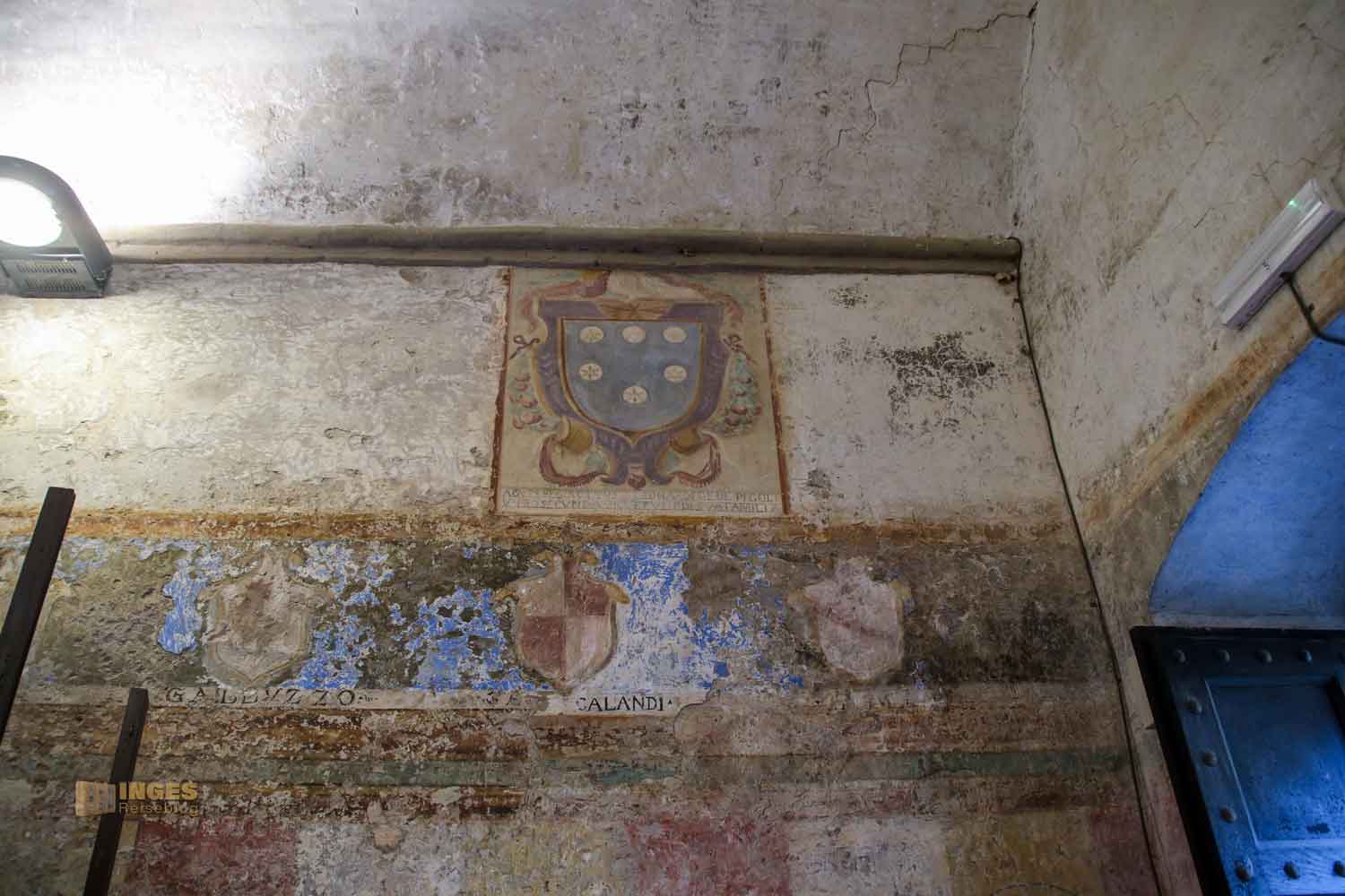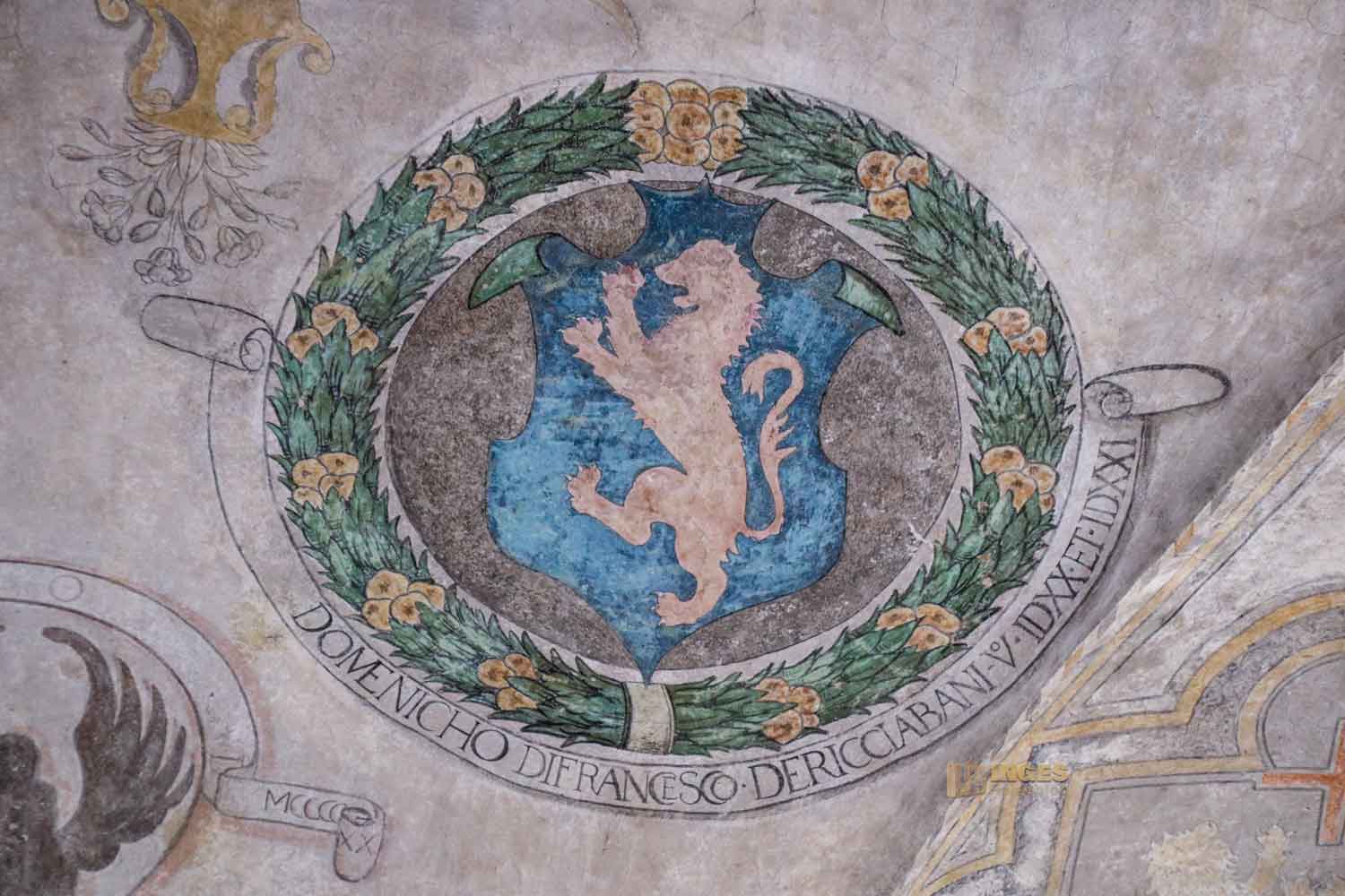 Kein Anfangsbau ist für die Ewigkeit, auch eine Burg oder ein Palazzo nicht. Anfang des 15. Jahrhunderts wurde hier großzügig erweitert, und der Vikar bekam seine private Kapelle. Die nützte er aber nicht für das Gebet, sondern auch um sich mit den Bürgermeistern seines Vikariats zu treffen. Die Wappen an den Wänden verdeutlichen, wer dazu gehörte.