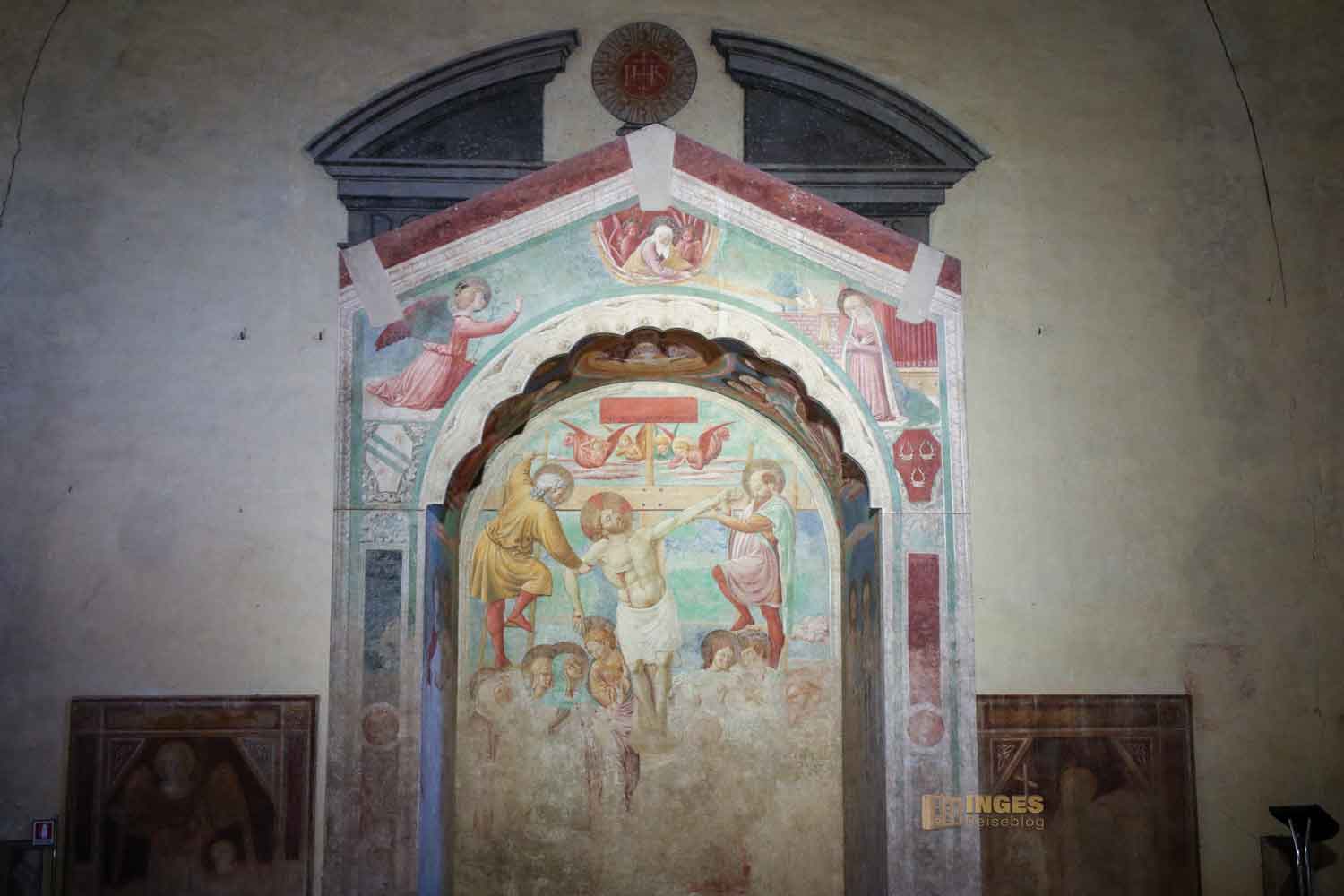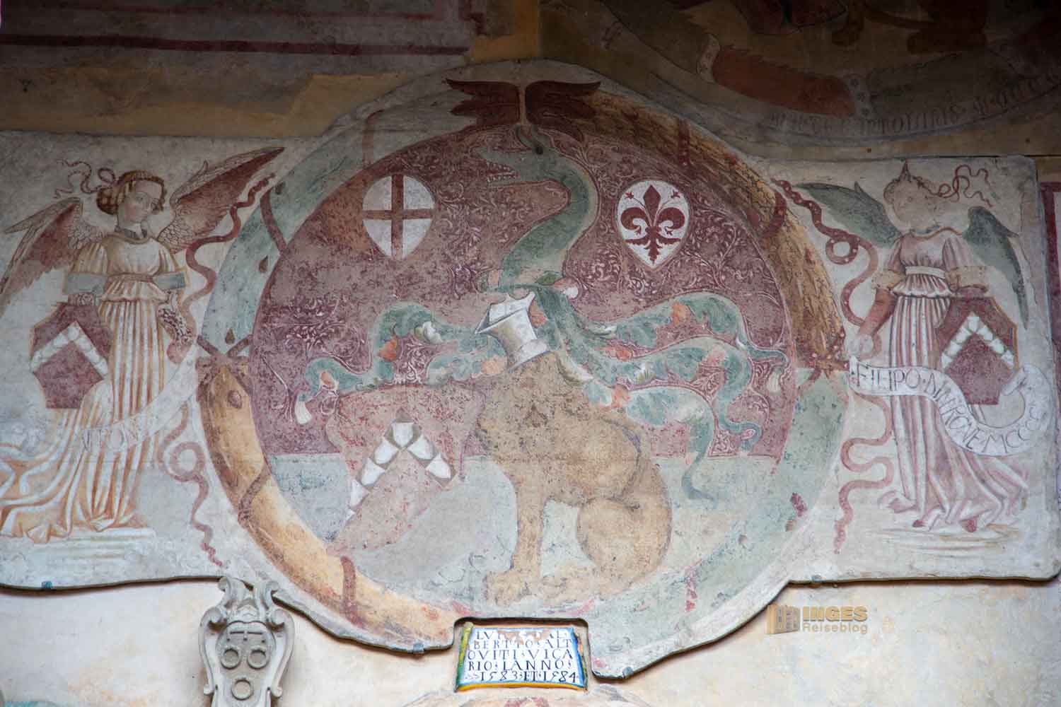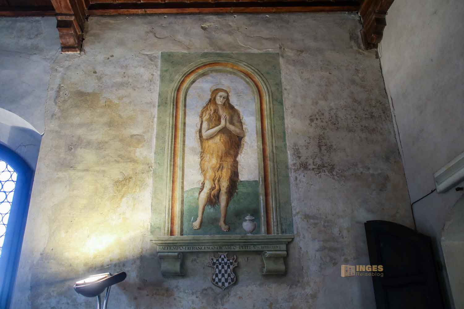 Eine Freskenmalerei, wie ich so noch nie gesehen habe, zeigt "die Madonna mit dem Kind auf dem Thron". 1495 wurde sie gemalt und zeigt oben an der Rückenlehne Delfine. Schaut mal genau auf meinem Foto. Das nicht mehr vollständige Wappen deutet auf die Zeit der Medici und die Zeit Habsburg-Lothringen.