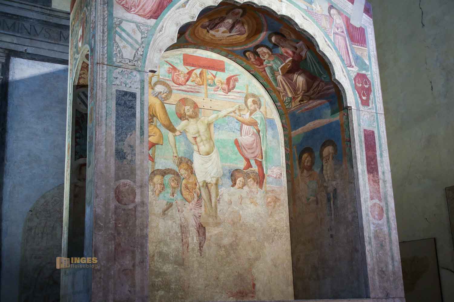 Benezzo Gozzoli hat sich ab 1464 den Fresken angenommen, die heute aufwändig restauriert zu sehen sind. Das Thema seiner Gemälde geht von der Verkündigung bis zur Kreuzabnahme, und wie über alles in unserem Leben der hl. Vater segnend seine Hände hält.
