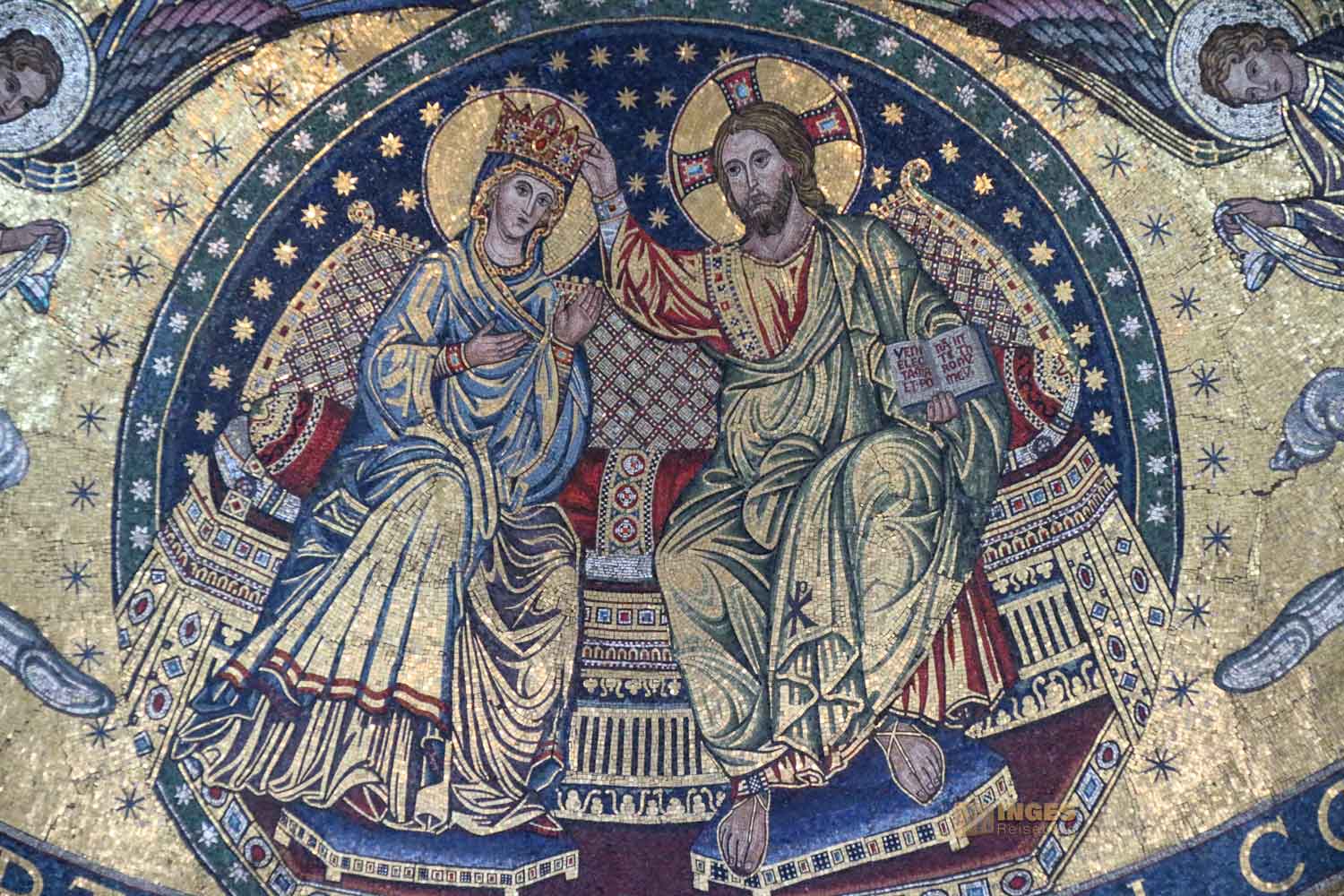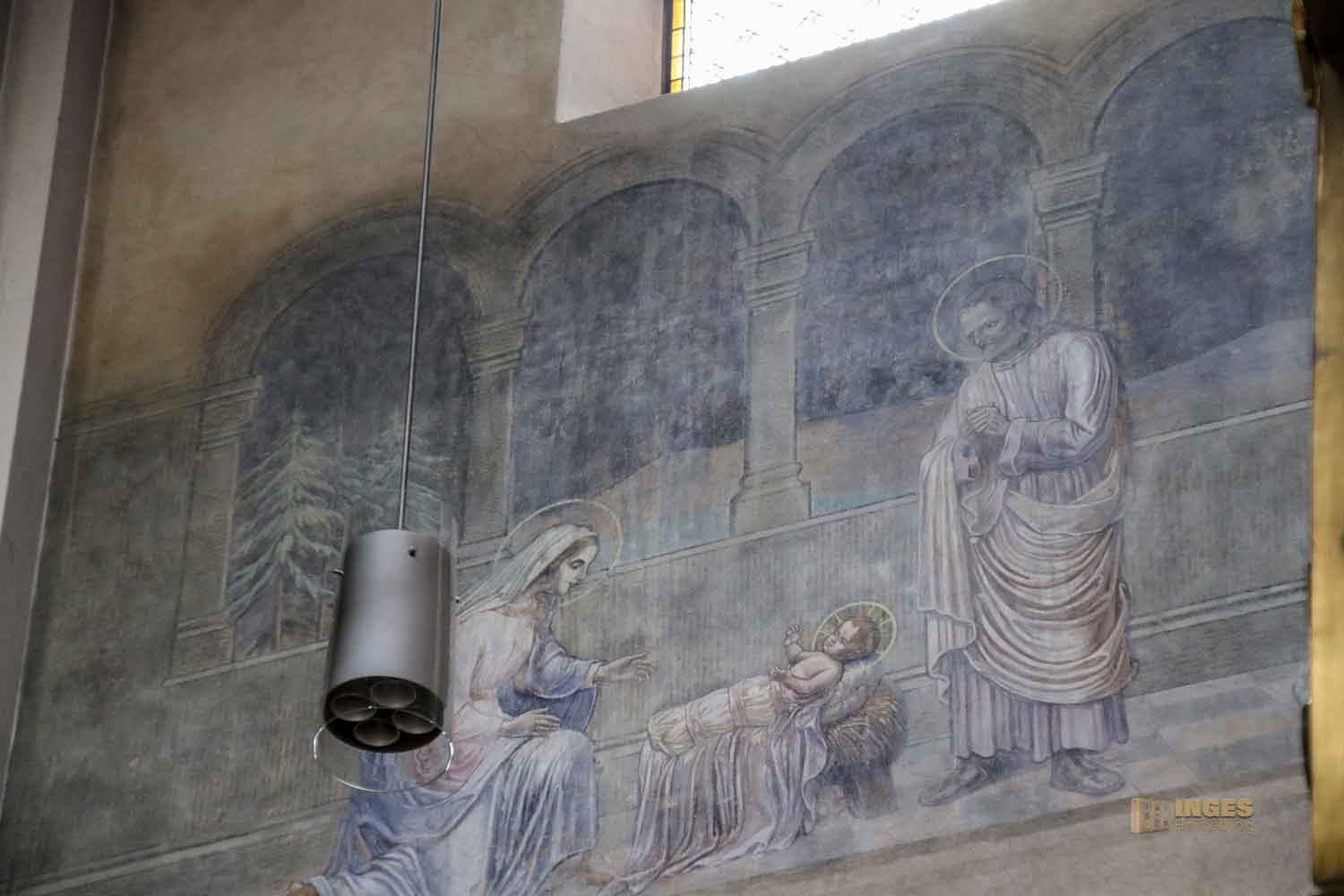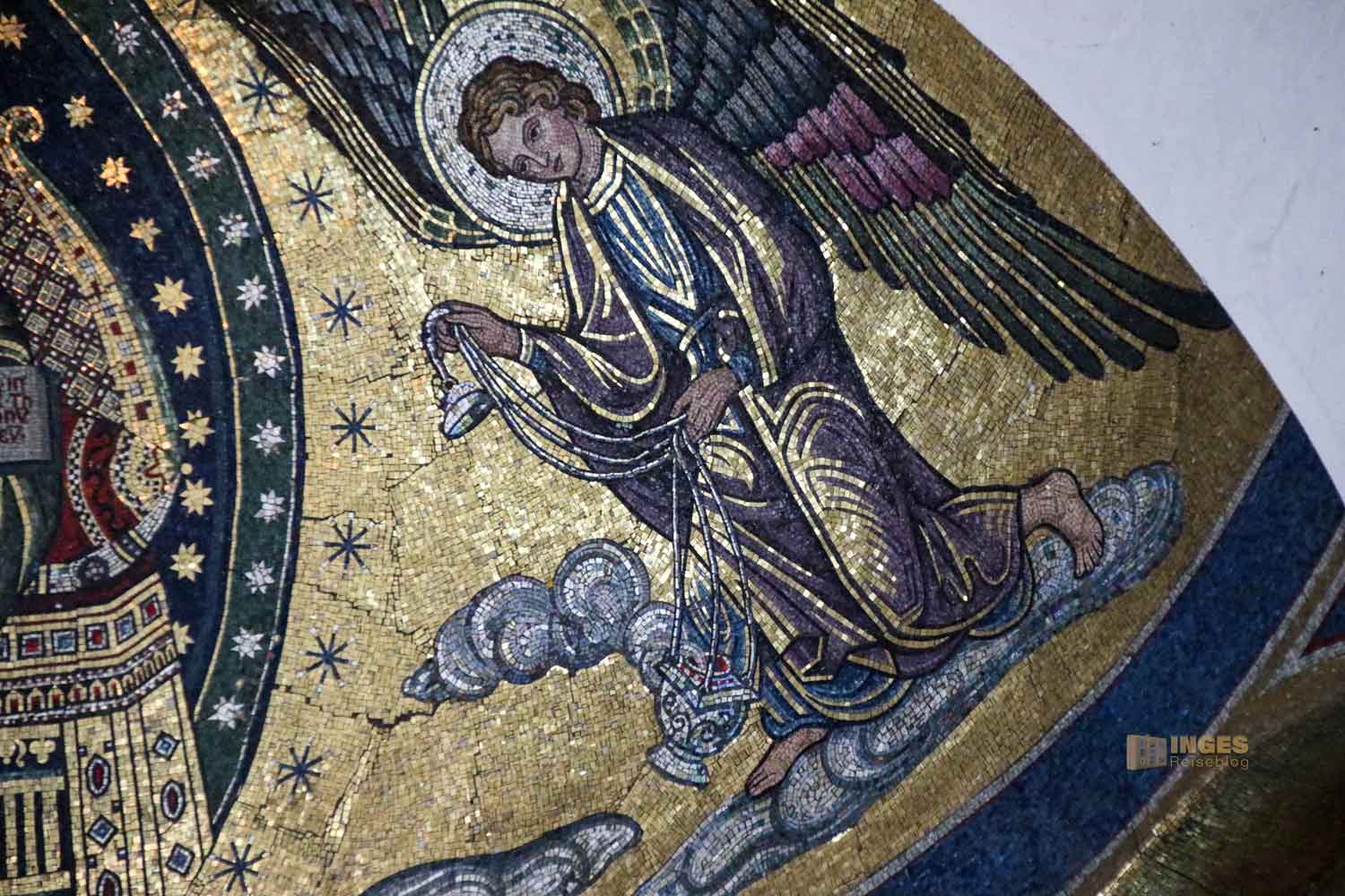 bilden den Abschluss meiner Entdeckungstour im Chorraum. Fast könnte man sie übersehen, so zart sind sie teilweise nur zu erkennen. 1927 malte der Künster Eduard Goldkuhle, der auch für das Bild vor dem Mosaikbild in der Apsis verantwortlich zeichnet, vier wunderschöne große Wandbilder. Die Verkündigung Mariens und die Geburt Christi sind im Chorraum, die Flucht nach Ägypten und die Abnahme vom Kreuz in den Seitenschiffen.
