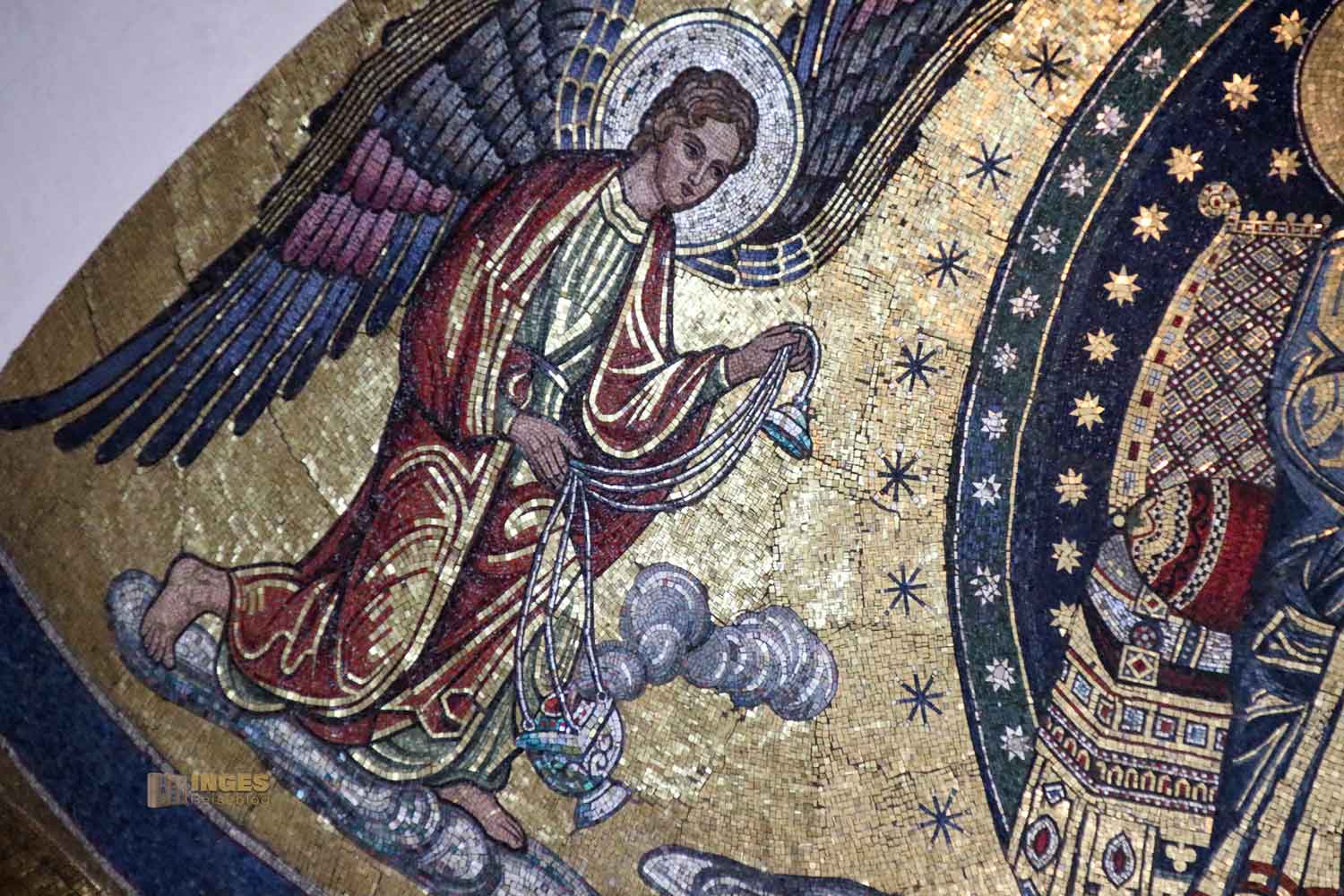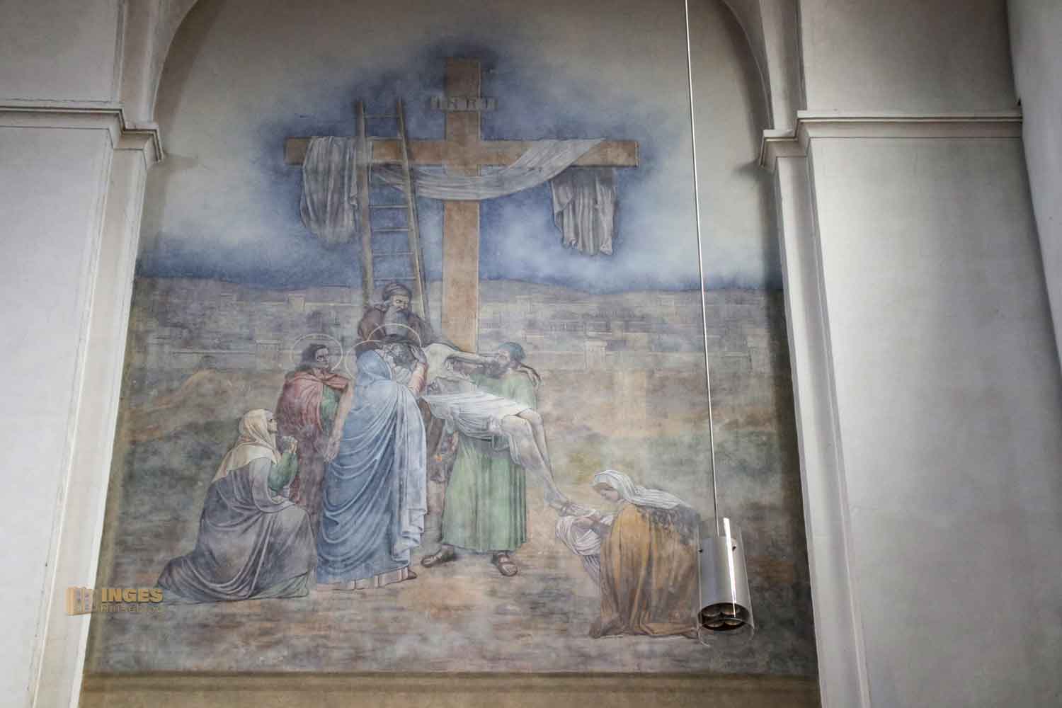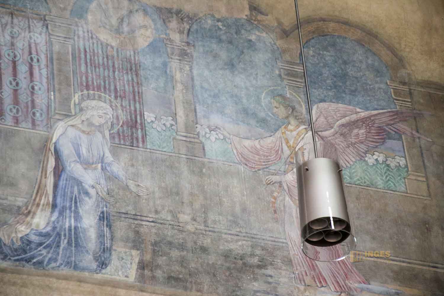 bilden den Abschluss meiner Entdeckungstour im Chorraum. Fast könnte man sie übersehen, so zart sind sie teilweise nur zu erkennen. 1927 malte der Künster Eduard Goldkuhle, der auch für das Bild vor dem Mosaikbild in der Apsis verantwortlich zeichnet, vier wunderschöne große Wandbilder. Die Verkündigung Mariens und die Geburt Christi sind im Chorraum, die Flucht nach Ägypten und die Abnahme vom Kreuz in den Seitenschiffen.
