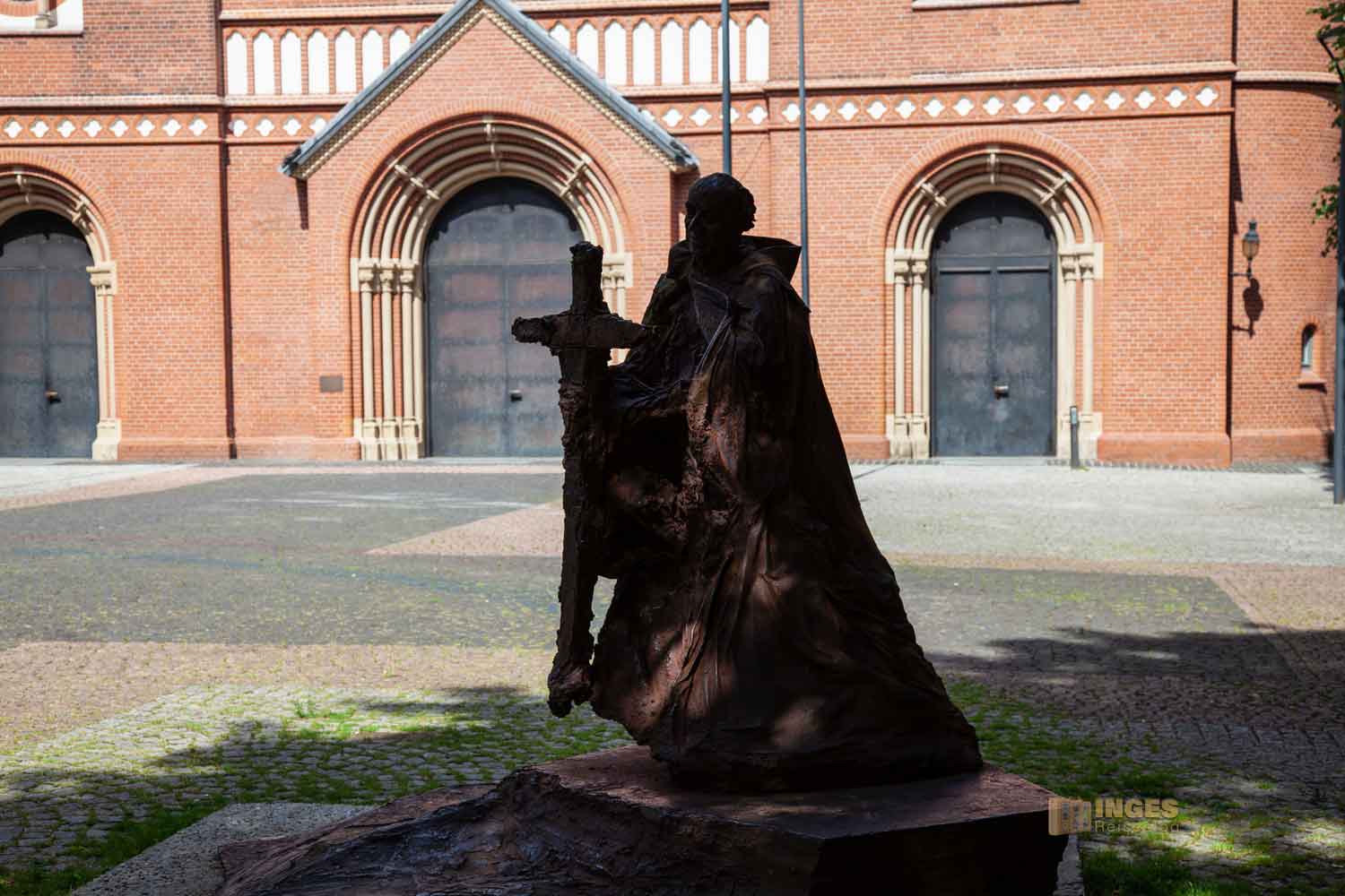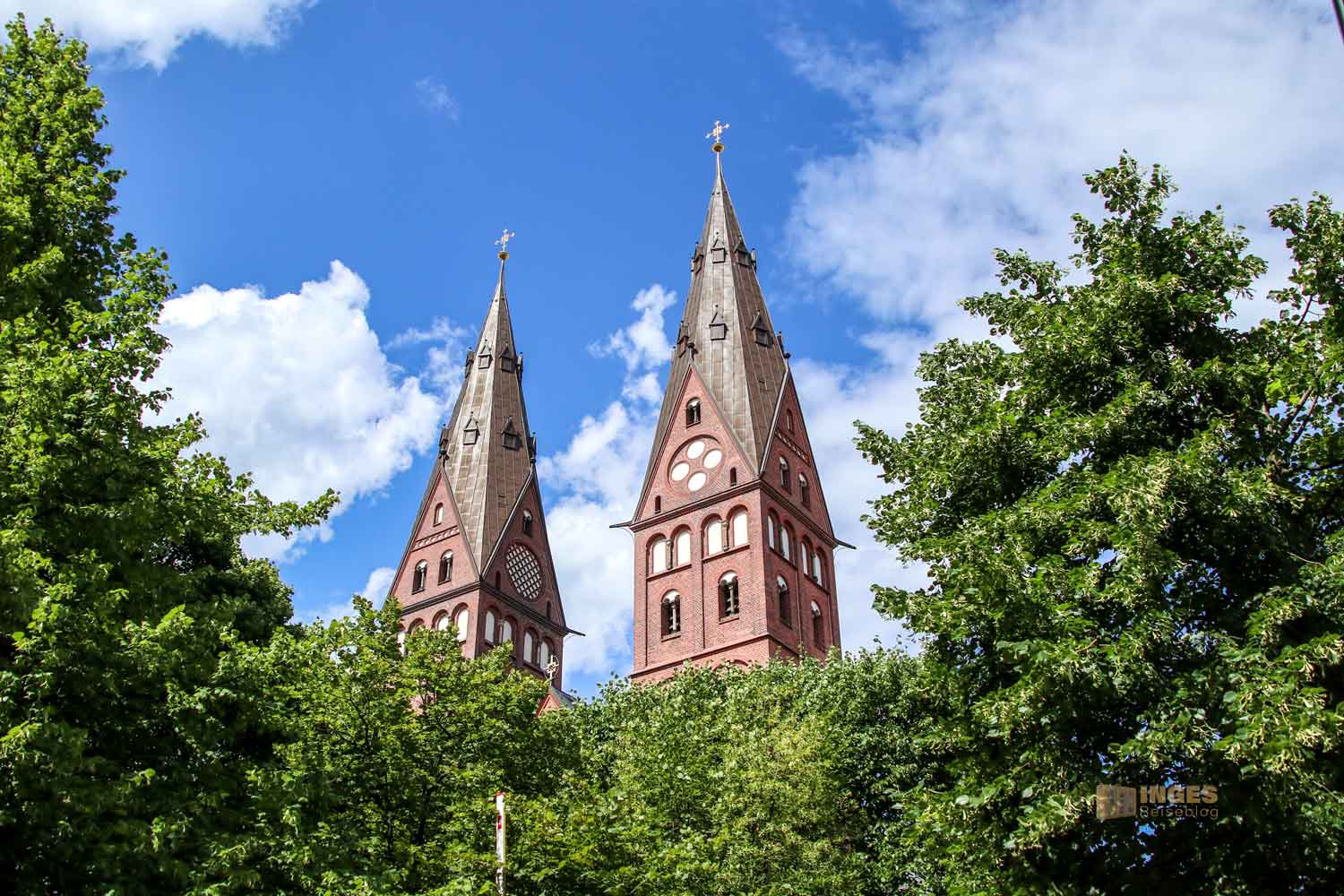 der Kirche, die erst 1995 zum Dom wurde und in einer ruhigen Seitenstraße seine zwei Kirchtürme so 64 Meter hoch in den Himmel streckt. Außer der Turmfront ist vom Domplatz nicht viel von der Kirche zu sehen. Man hätte vielleicht großflächig die Kirche umrunden können .... können, aber ich hatte keine Lust auf langwierige Diskussionen mit meinen Füßen (beim Schwabe ist alles von der Hüfte abwärts Fuß 😉 ), denn irgendwie mussten wir ja auch wieder zurück, zumindest in die Nähe einer S-Bahn.