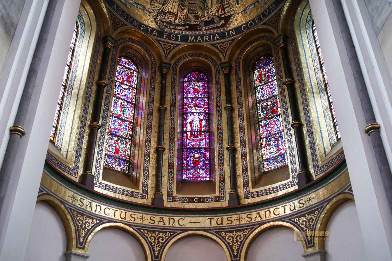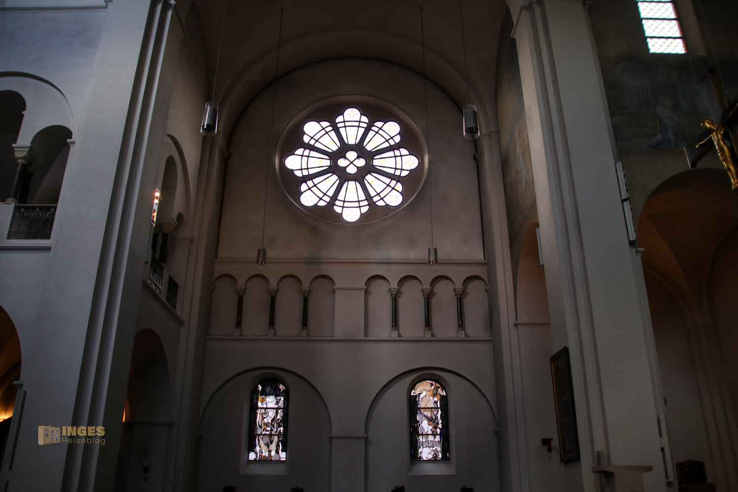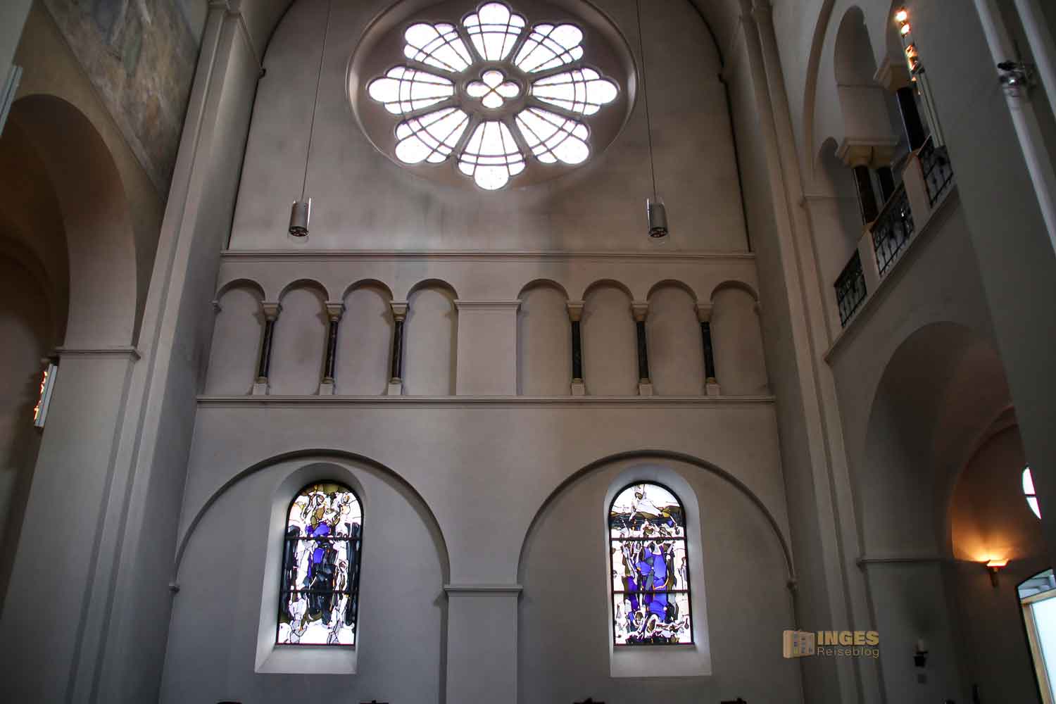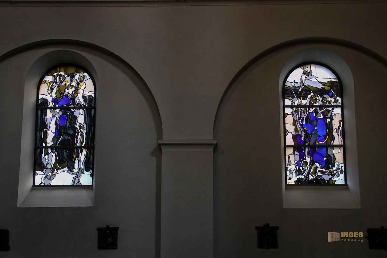 sind sehr modern interpretiert und man hat schon etwas Mühe aus den elf Rundbogenfenster in den Seitenschiffen die Szenen aus dem Leben des Prohepten Jesaja zu erkennen. Vielleicht war die klare Erkennung vom Künstler auch gar nicht gewollt? Sich mit etwas auseinanderzusetzen, kann auch wie eine Art der Meditation sein. Das was ich in einem Bild erkenne, müsst ihr noch lange nicht. Dafür entdeckt ihr vielleicht etwas anderes, was ich wiederum nicht gesehen habe.