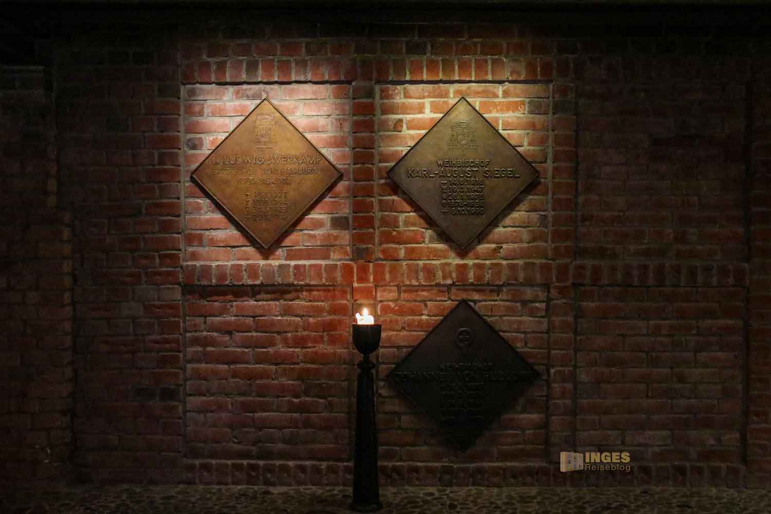 Ja, tatsächlich gibt es unter diesem neuen Bauwerk auch eine Krypta, nicht nur im Michel, wo sie ja eine der größten Krypten in Europa ist. Die hier im Dom ist deutlich kleiner, aber ein sehr würdevoller Platz für die bisherigen drei Hamburger Bischöfe, die dort ihre letzte Ruhe gefunden haben.