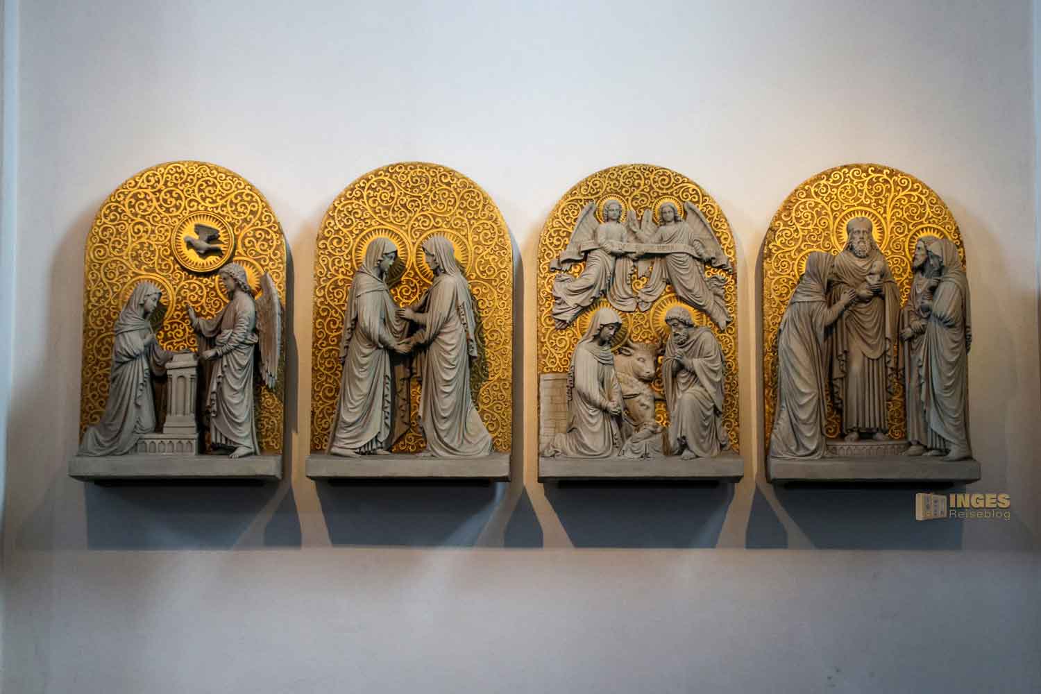 gezeigt. Ihr kennt die vier Szenen bestimmt - die Verkündung des Erzengel Gabriels, der Besuch von Elisabeth, Maria und Josef mit dem Jesuskind im Stall von Bethlehem und die Szene im Tempel mit Simeon. Ihr wisst ja sicher, nach 40 Tagen brachte Maria das neugeborene Kind in den Tempel, wo ihn Simeon als den verheißenden Messias preist.