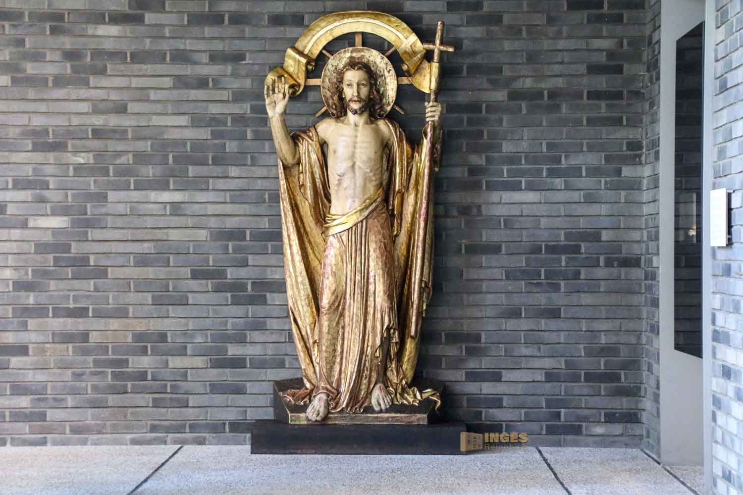 birgt alt und neu. Es hielt 1993 zur 100-Jahr-Feier Einzug im Dom. Neu die moderne Darstellung Christi, alt ist dabei das Kreuz auf dem der Corpus befestigt ist. 4000 Jahre alt ist die Mooreiche, die für das Kreuz verwendet wurde. Vermutlich wird es keiner von uns zu Gesicht bekommen, denn der Blick auf die Rückseite des Kreuzes ist der Geistlichkeit im Dom vorbehalten. Dort befinden sich nämlich neben dem Lamm Gottes auch Medaillons aus versteinertem Holz, die bis zu 30 Millionen Jahre alt sein sollen.