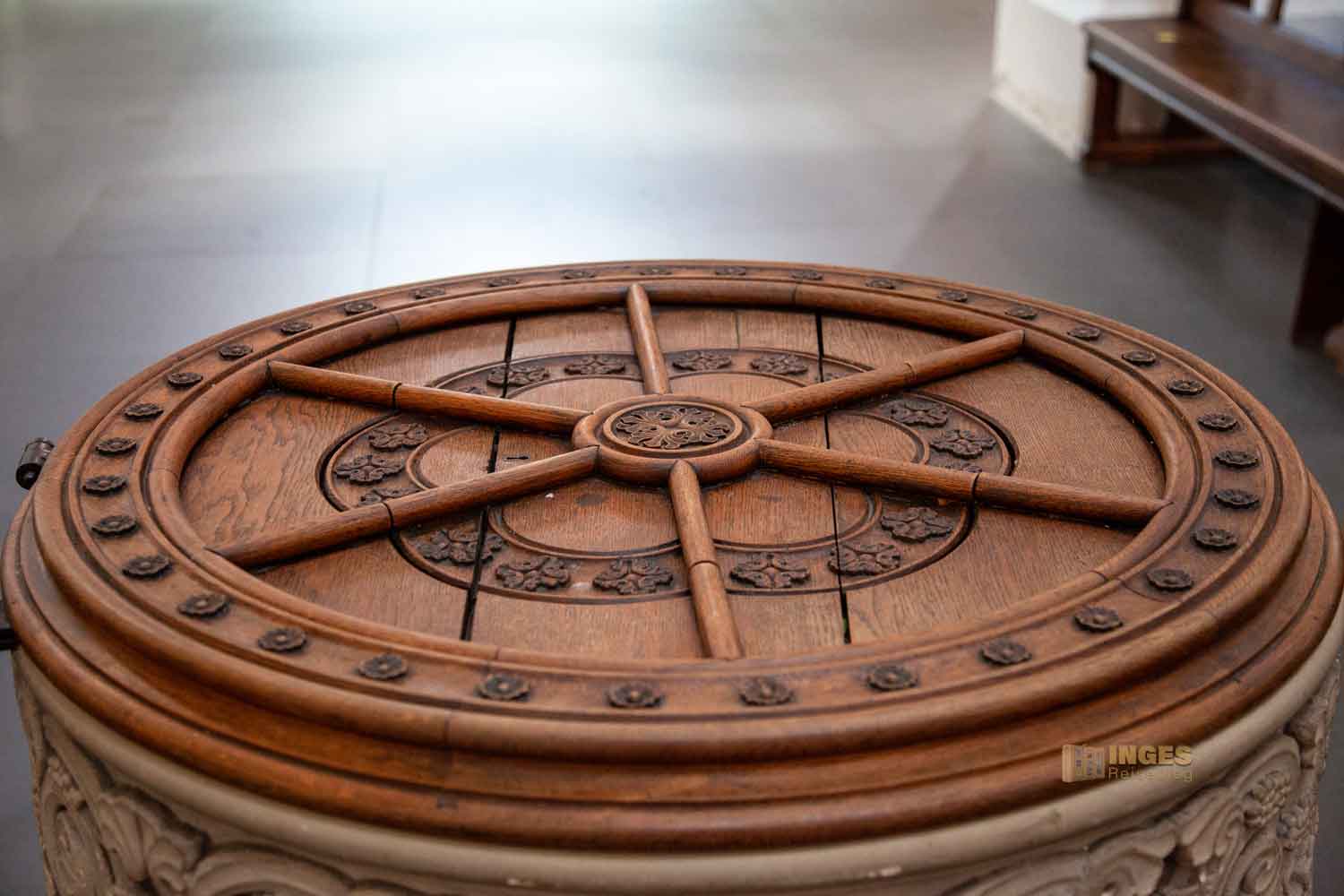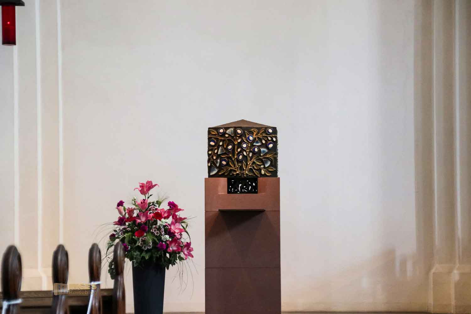 glänzt im Seitenschiff. Da würde alles daneben nur stören. 1963 wurde er gefertigt und zeigt den Lebensbaum.