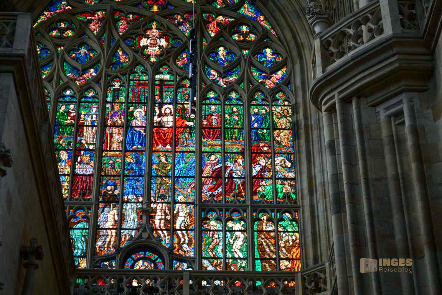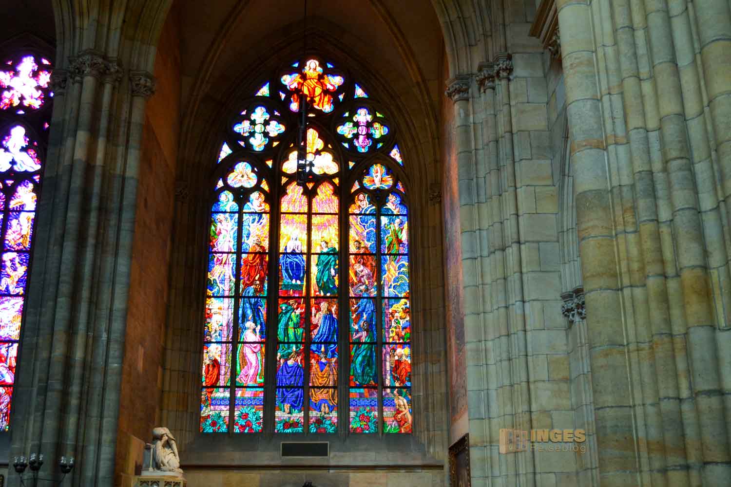 Herausragend sind die Fenster von Max Švabinský, 1873 geboren. Er schuf mehrere dieser schönen Fenster. Švabinský gilt als einer der Begründer der modernen tschechischen Kunst, und mir ist er außer im Veitsdom mit zwei Gemälden auch im Rieger-Saal im Gemeindehaus beim Pulverturm aufgefallen.