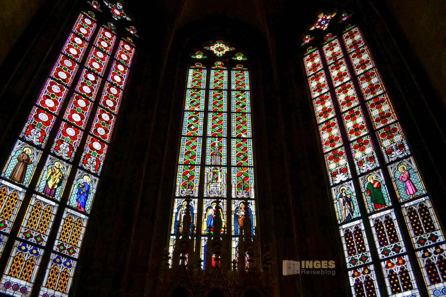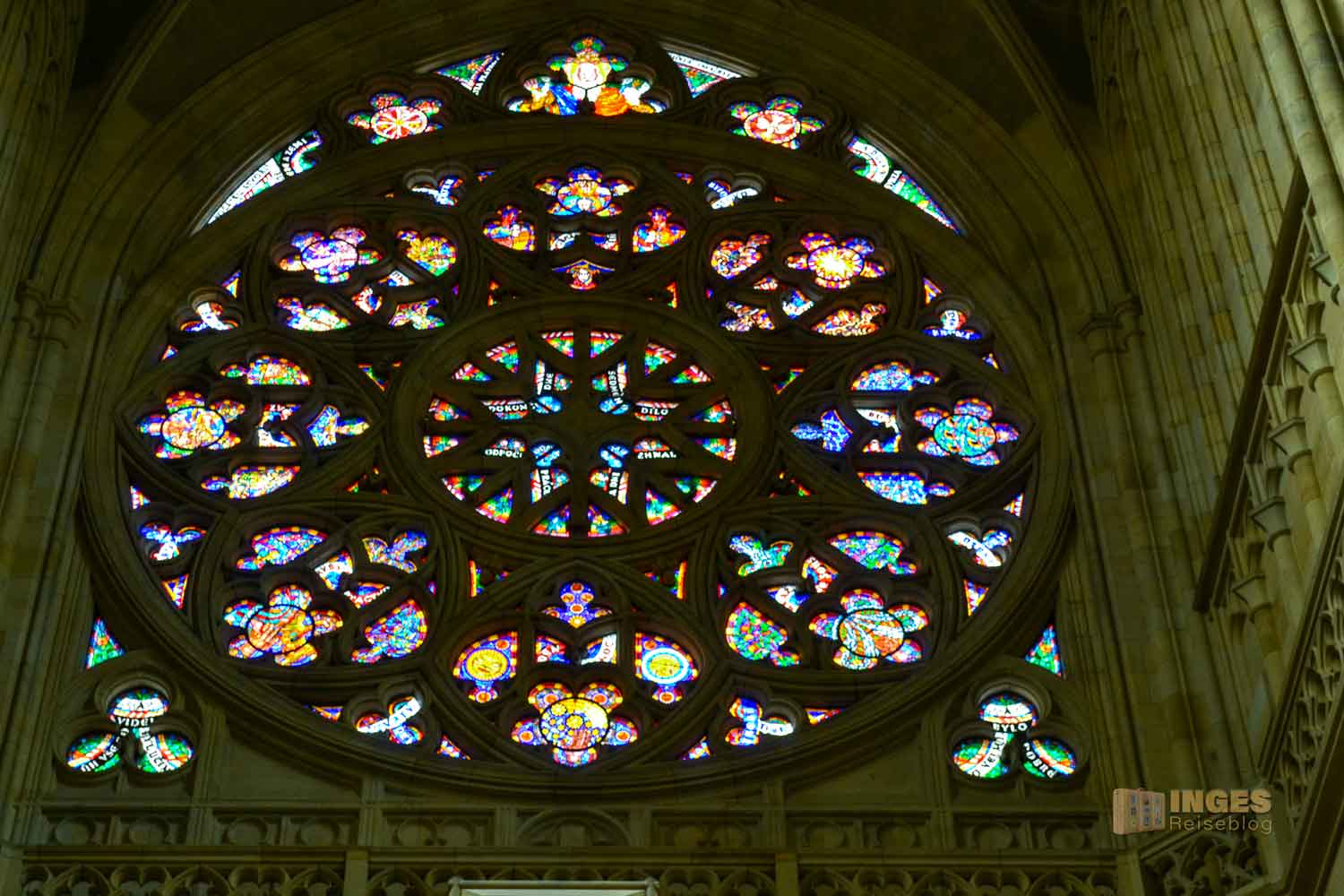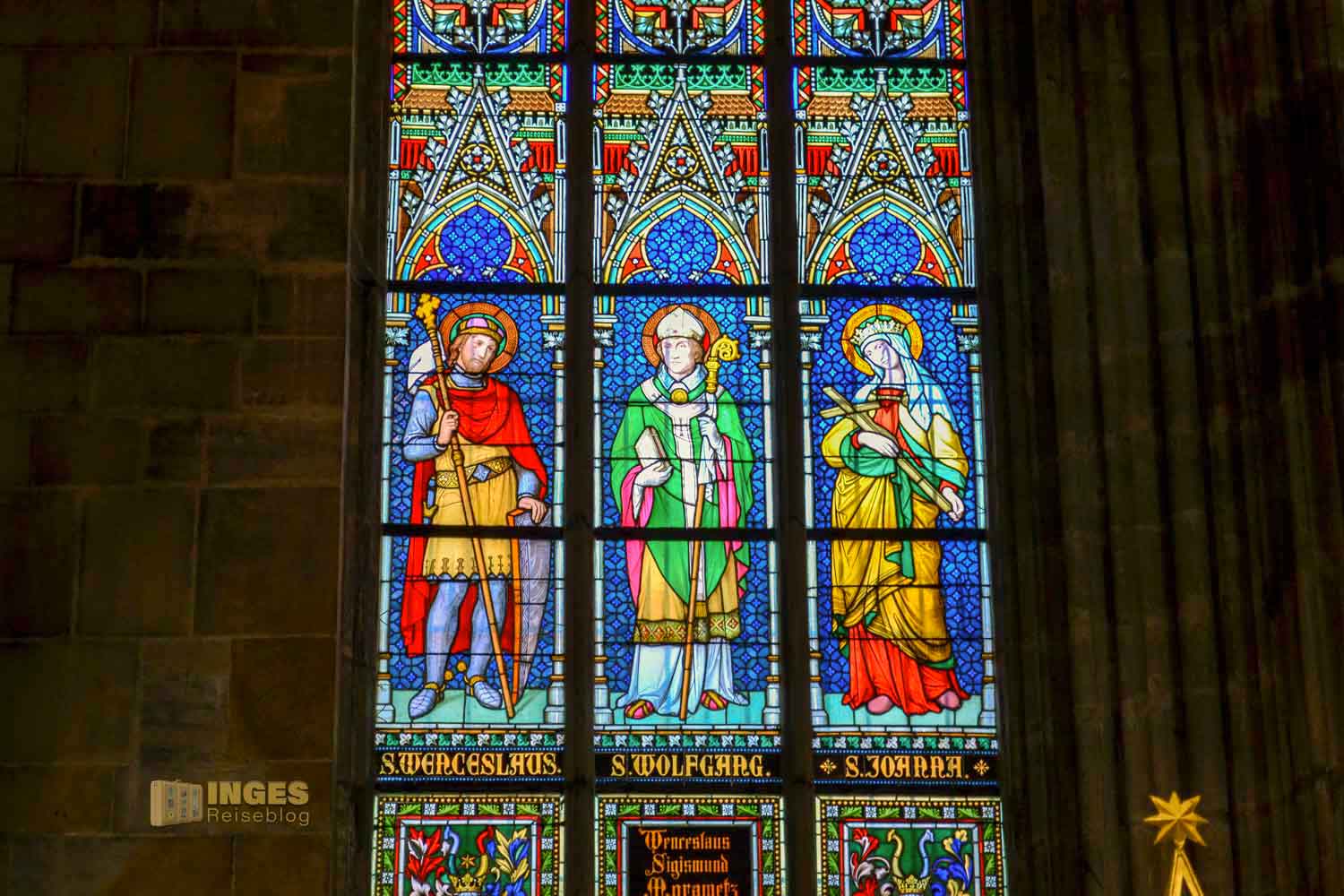 Auch die Fenster von Alfons Mucha fallen euch im Dom gleich auf. Am 1860 ist er in Mähren geboren und seine künstlerische Laufbahn begann eher weniger gut. Von der Prager Kunsthochschule wurde er abgelehnt, was ihn aber nicht davon abgehalten hat, sich die künstlerischen Fähigkeiten selber beizubringen. An der staatlichen Akademie in Münschen absolvierte er dann aber doch ein Studium. Er zählte zu den größten Künstler des Jugendstils und verstarb im Juli 1939.