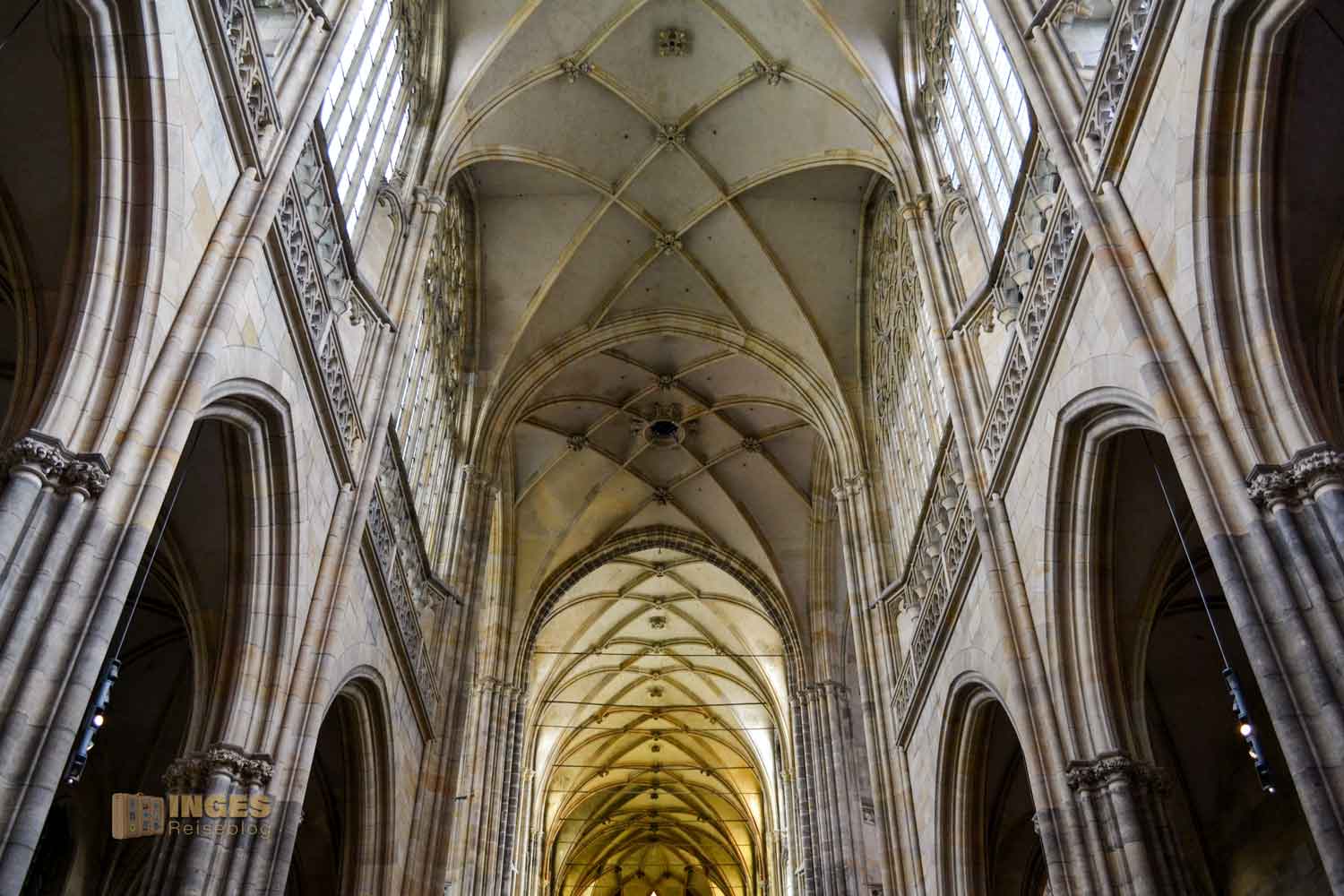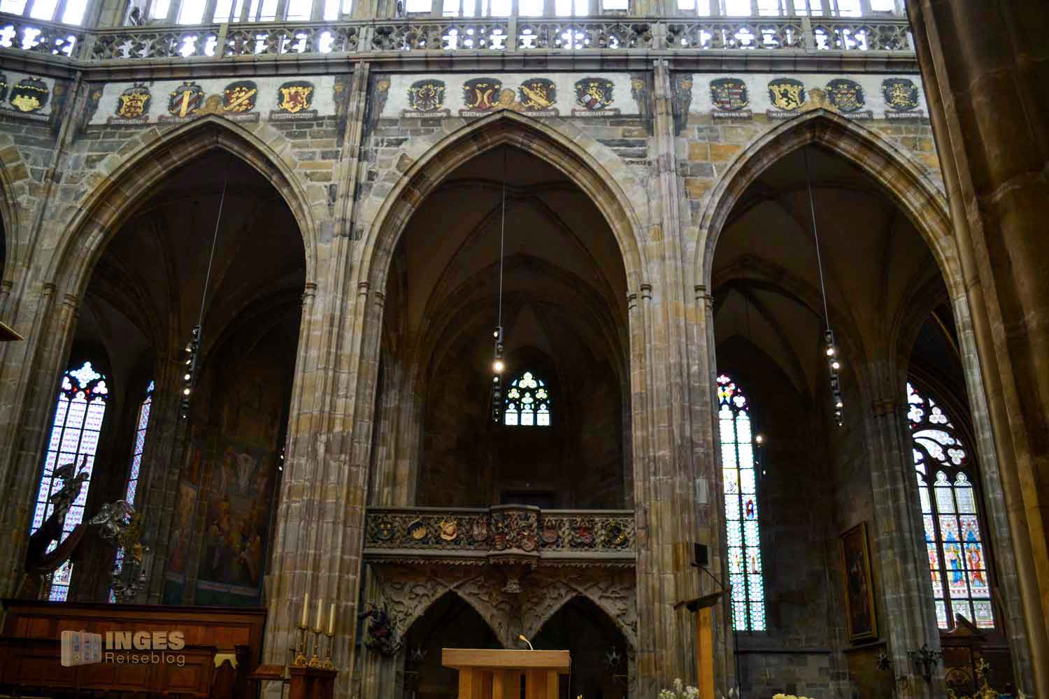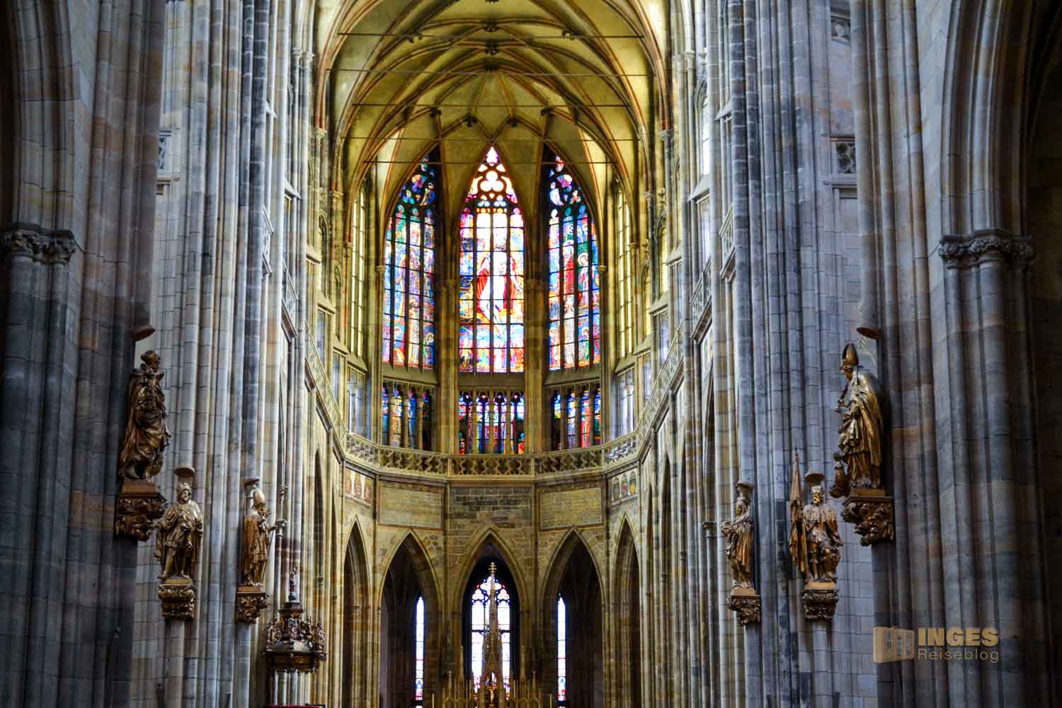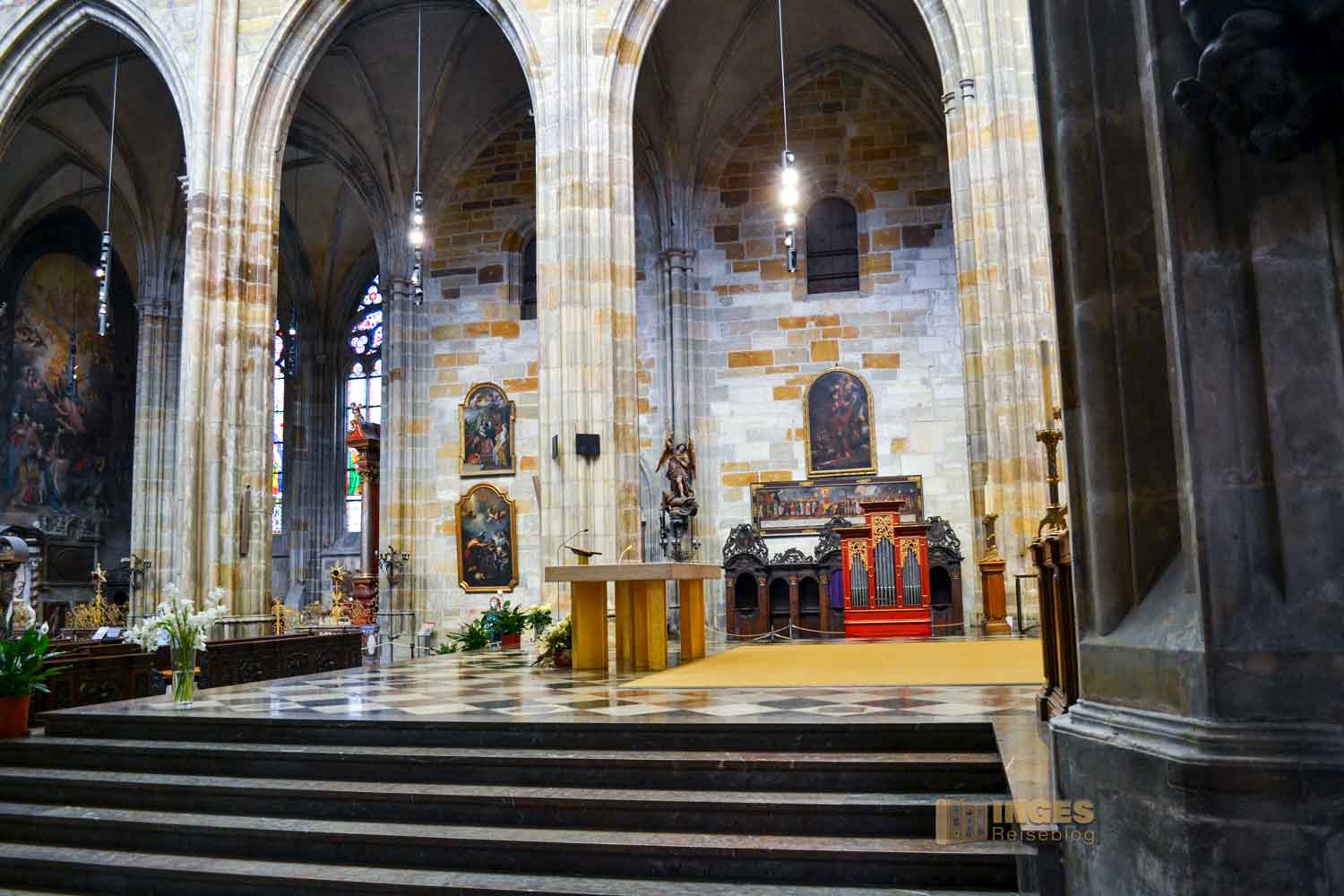 Die Maße des Doms sind schon Wahnsinn. Kein Wunder, es ist die größte Kathedrale in Tschechien. 124 Meter misst das Hauptschiff in der Länge und ist 60 Meter breit. 99 Meter geht der Hauptturm in die Höhe.