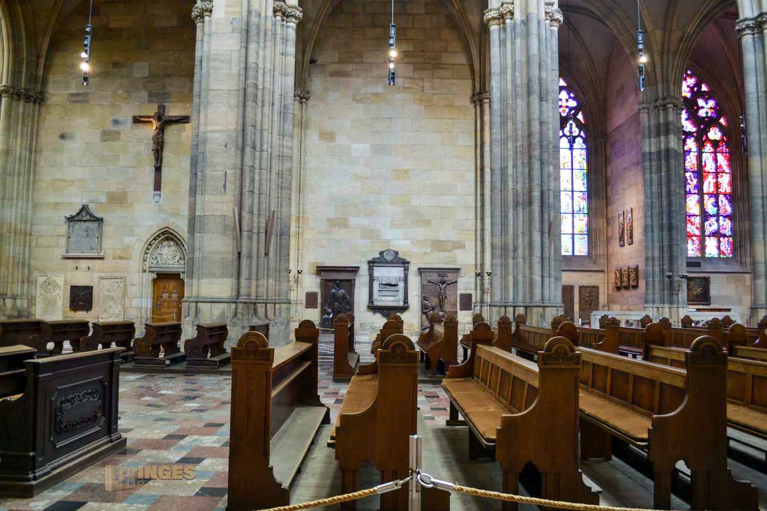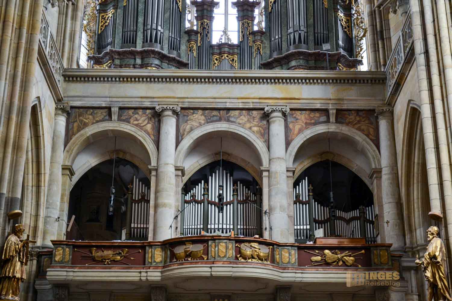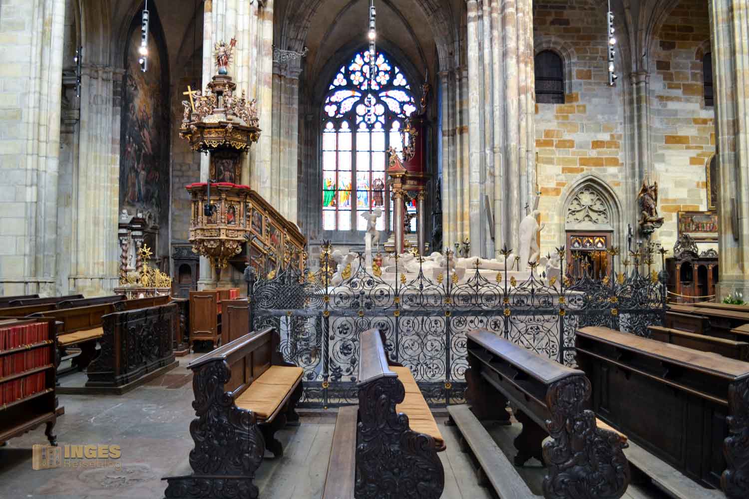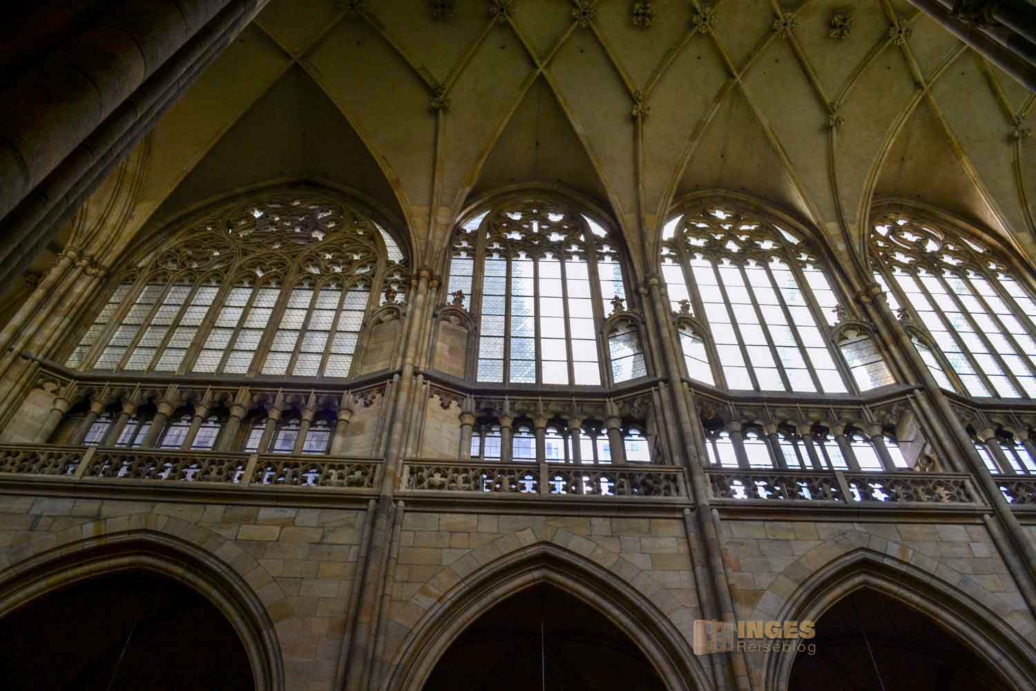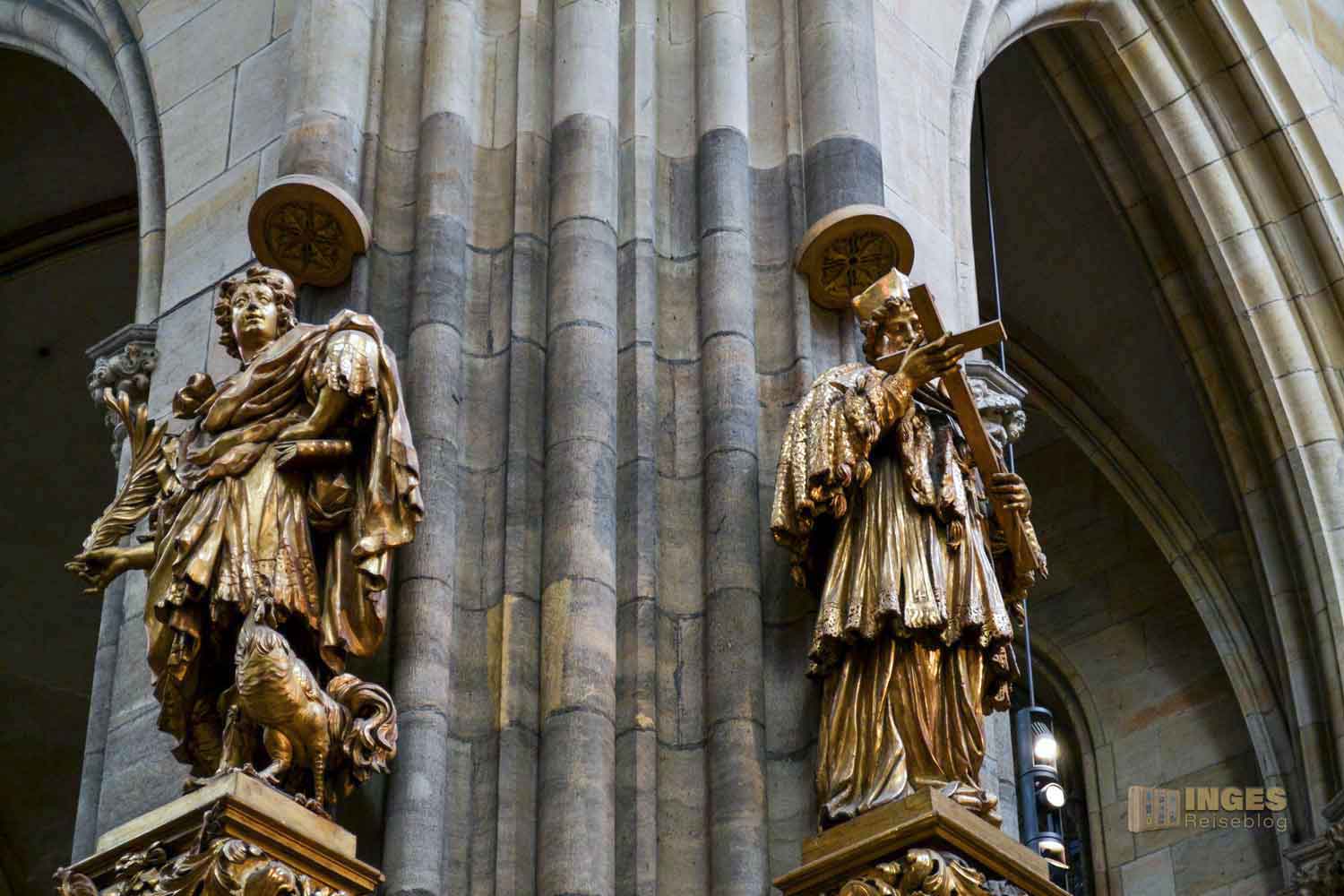 Die Maße des Doms sind schon Wahnsinn. Kein Wunder, es ist die größte Kathedrale in Tschechien. 124 Meter misst das Hauptschiff in der Länge und ist 60 Meter breit. 99 Meter geht der Hauptturm in die Höhe.