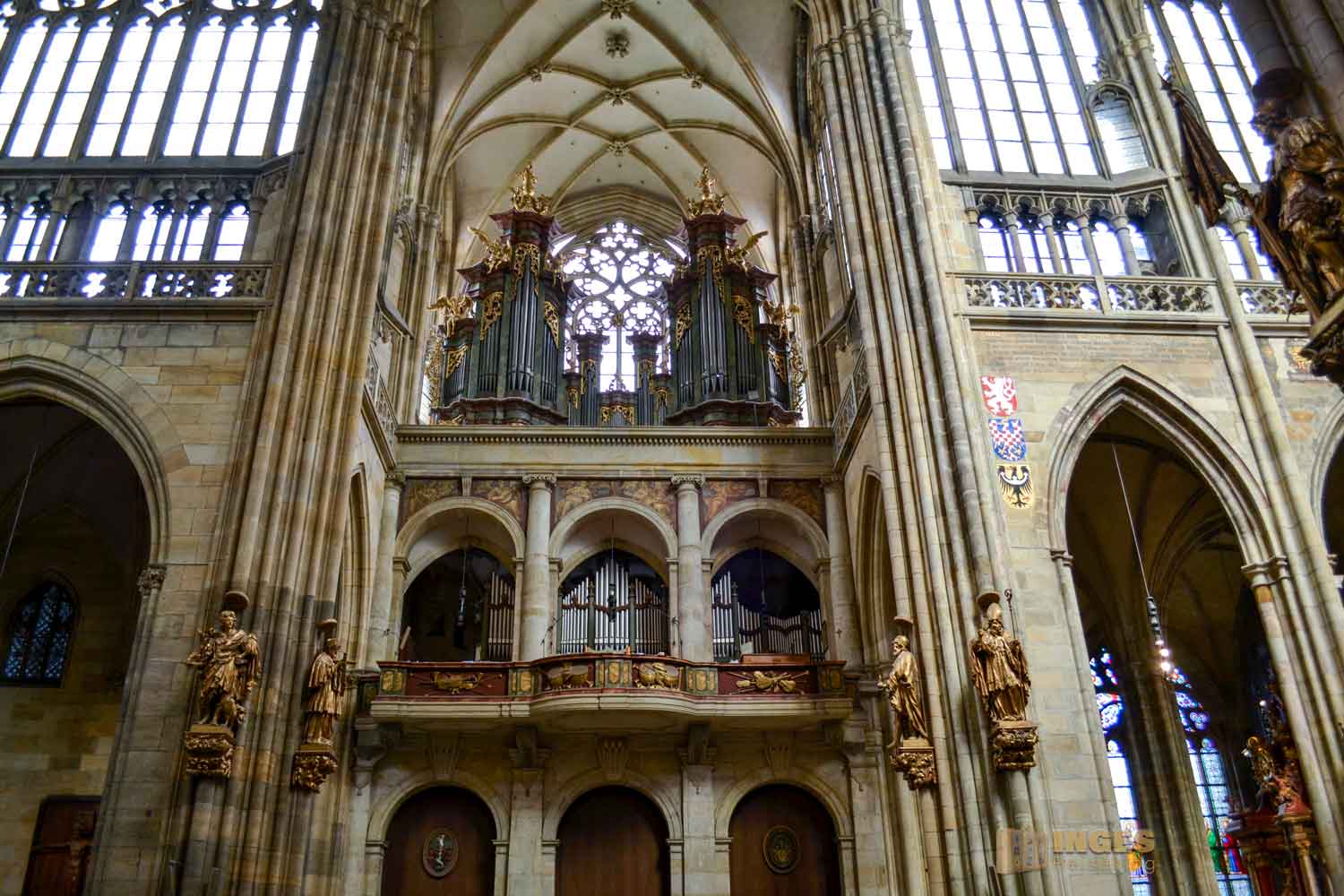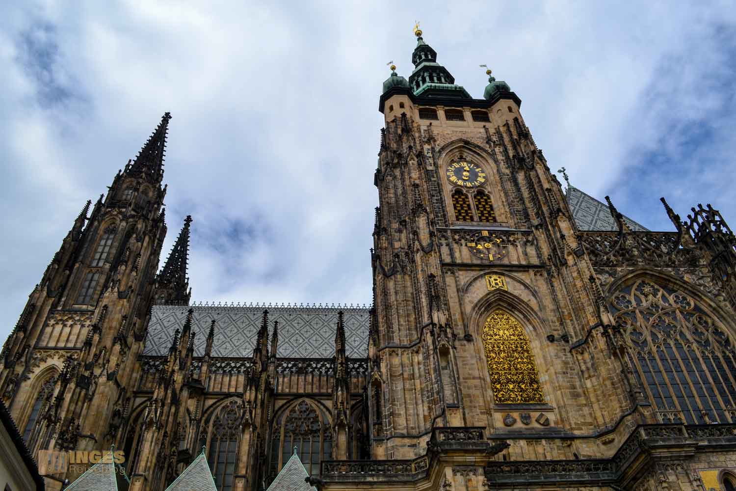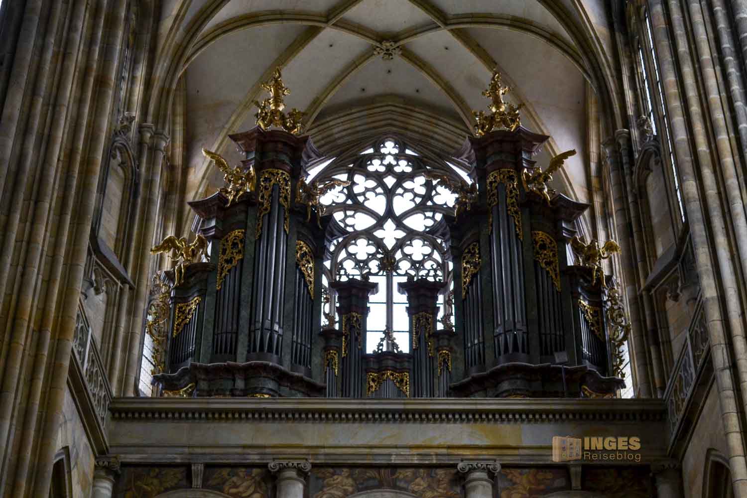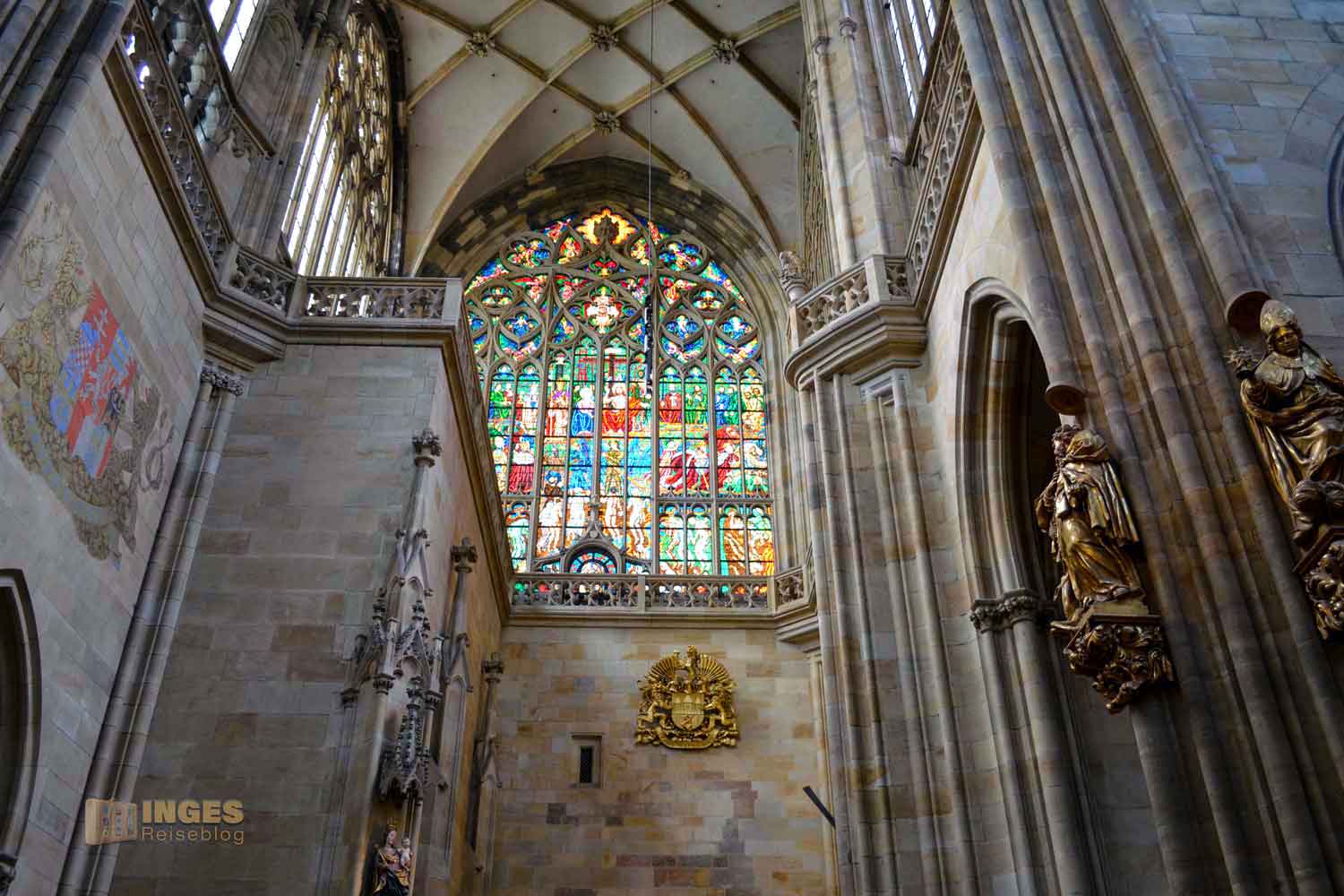 Die Maße des Doms sind schon Wahnsinn. Kein Wunder, es ist die größte Kathedrale in Tschechien. 124 Meter misst das Hauptschiff in der Länge und ist 60 Meter breit. 99 Meter geht der Hauptturm in die Höhe.