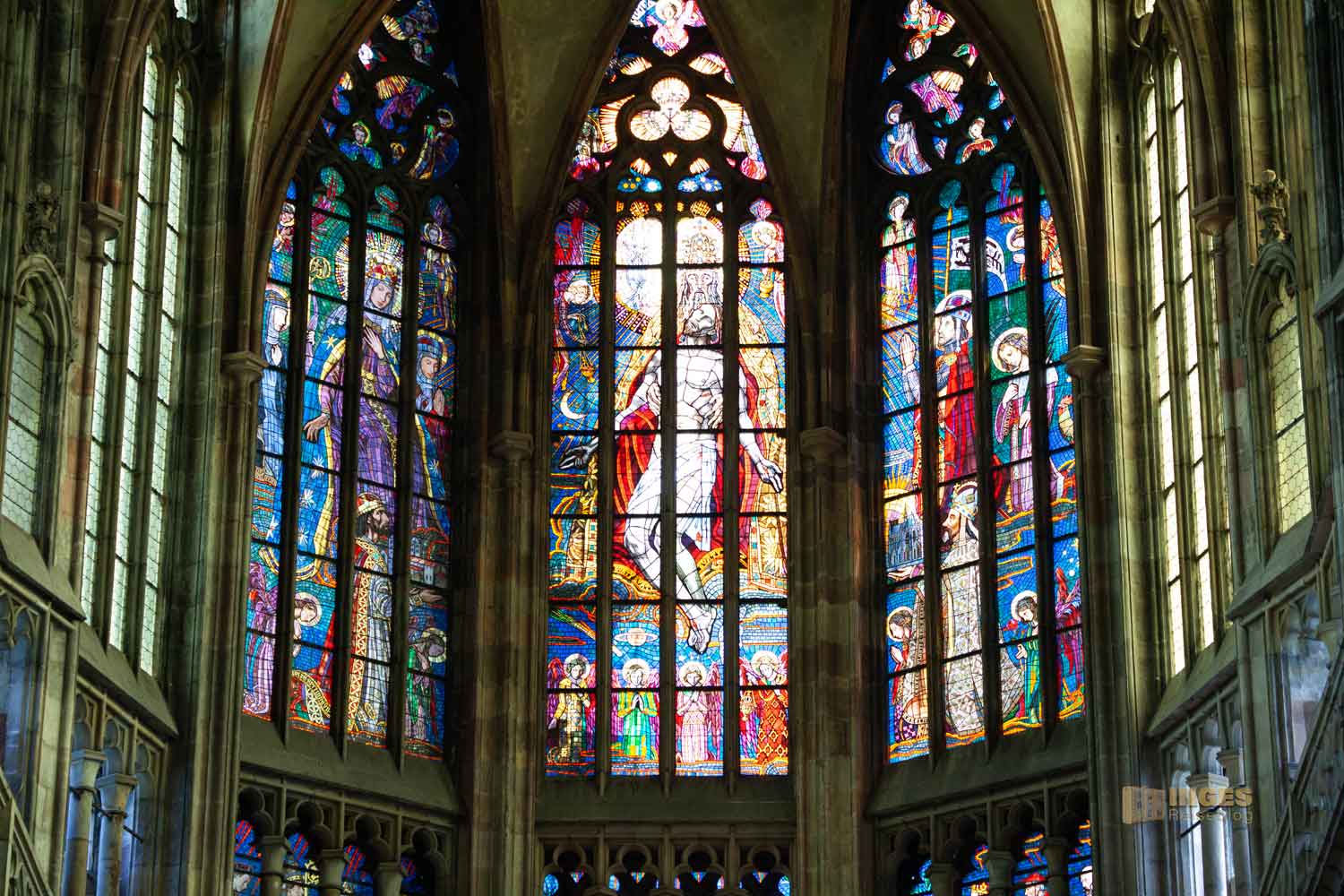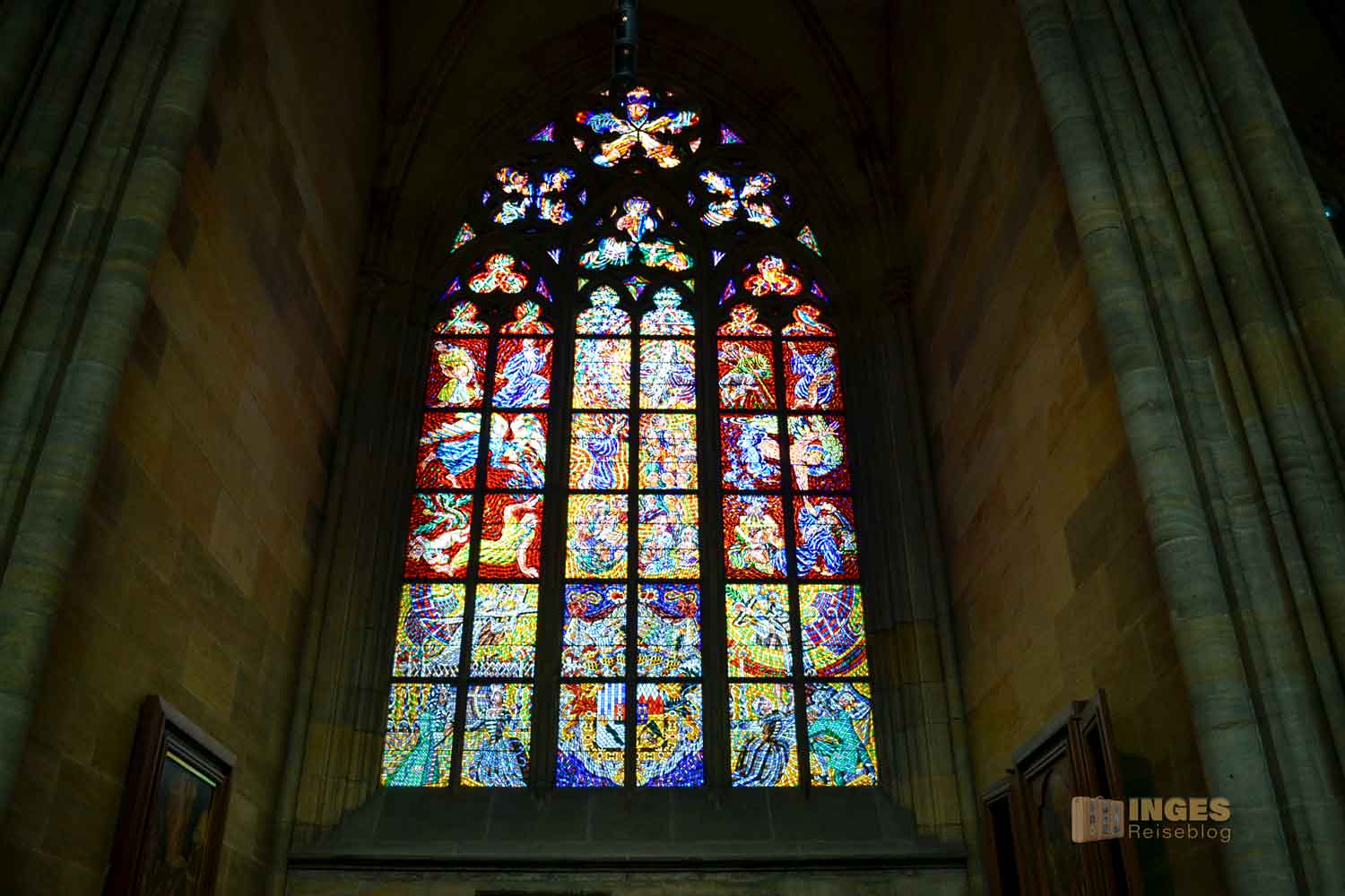 Im Veitsdom findet ihr ihn gleich an einem der ersten Seitenkapellen mit dem Glasfenster, das die "Ausgießung des Hl. Geistes" zeigt, in den drei Fenstern im Chor zeigt er die "Hl. Dreifaltigkeit" und im Flügel neben der Wenzelskapelle stellt er übergroß das "Jüngste Gericht" dar.