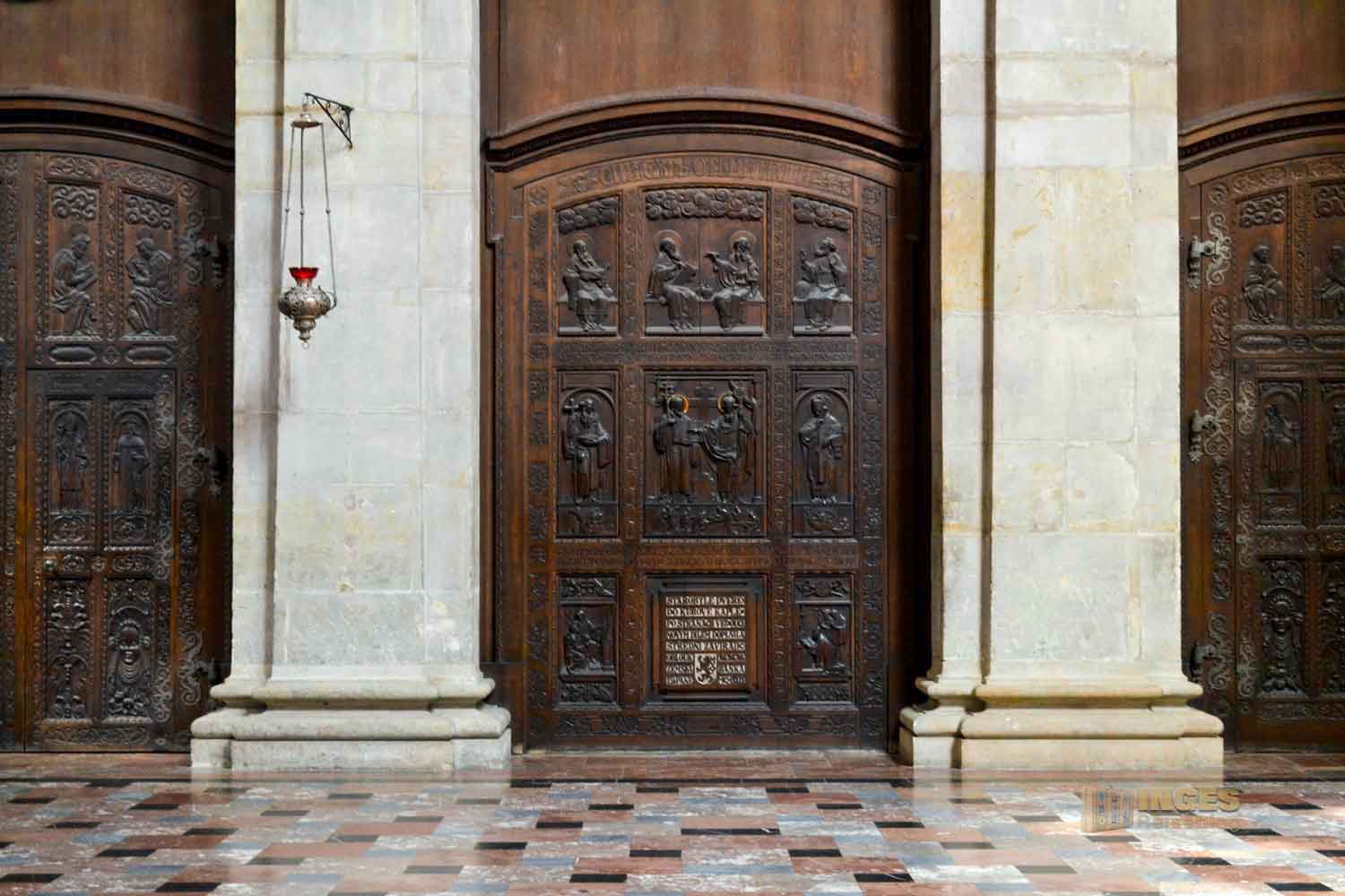 Über dem Bronzetor wird im oberen Teil die Kreuzigung Jesus dargestellt. Das Tor selber zeigt in den Reliefs Szenen aus dem Dombau.