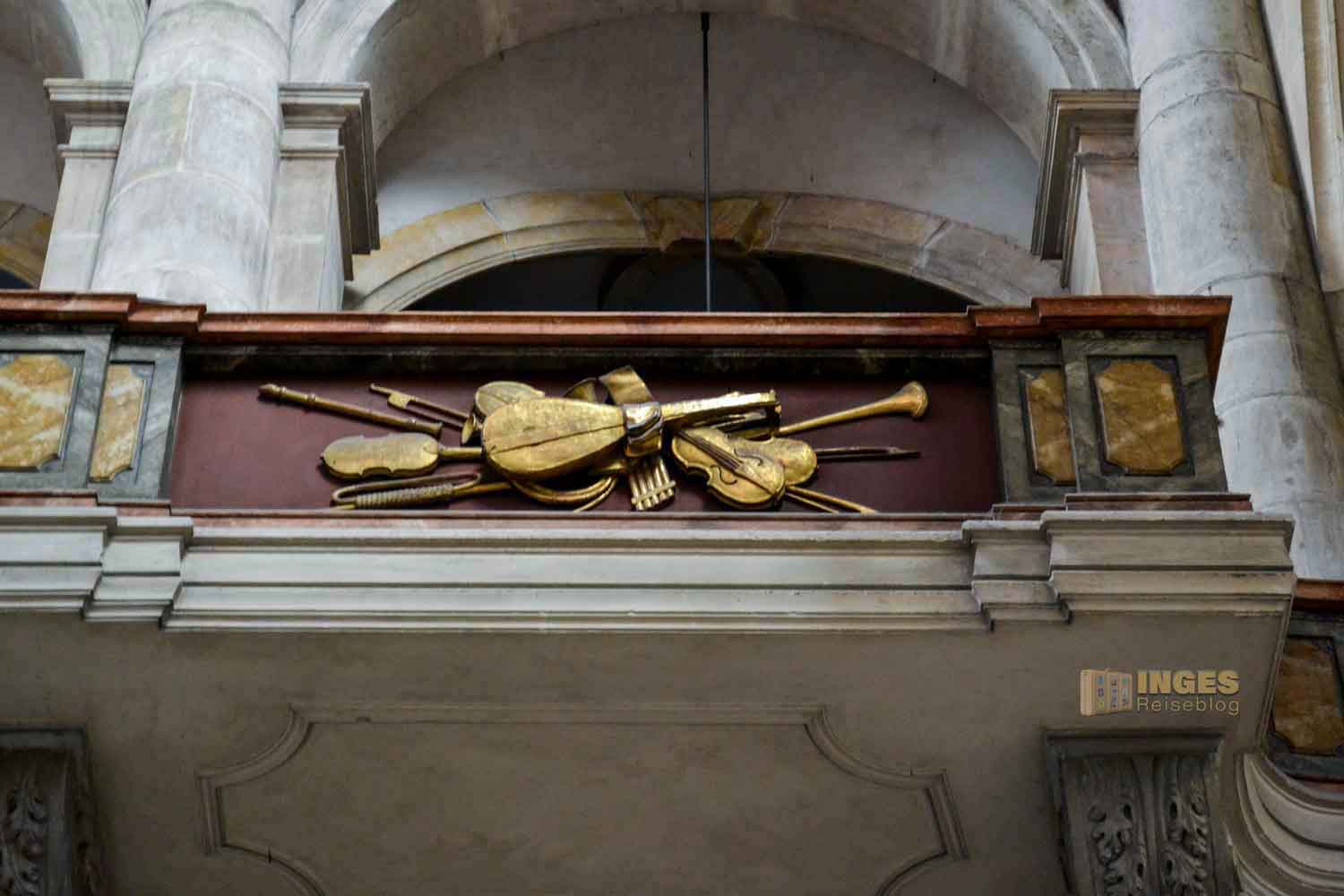 Ihr seht sie im nördlichen Seitenschiff auf zwei Emporen. Eigentlich, ja, eigentlich wäre in dem oberen Gehäuse eine Barockorgel von 1765. Nachdem das Orgelwerk aber 1909 bei einem Abtransport (warum auch immer?) verloren ging, ist das Gehäuse jetzt nur Deko. Aber eine schöne, wie ich finde.