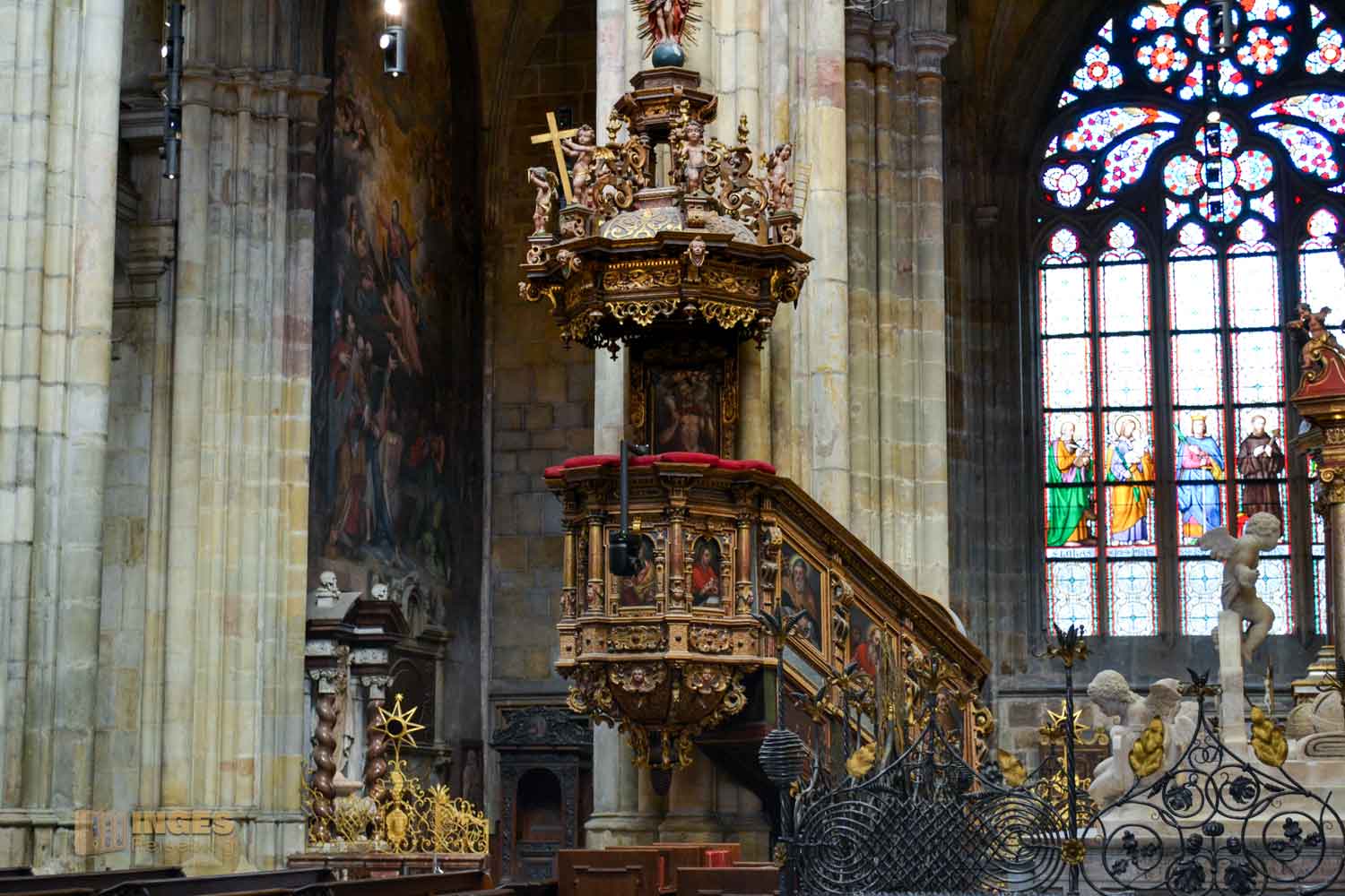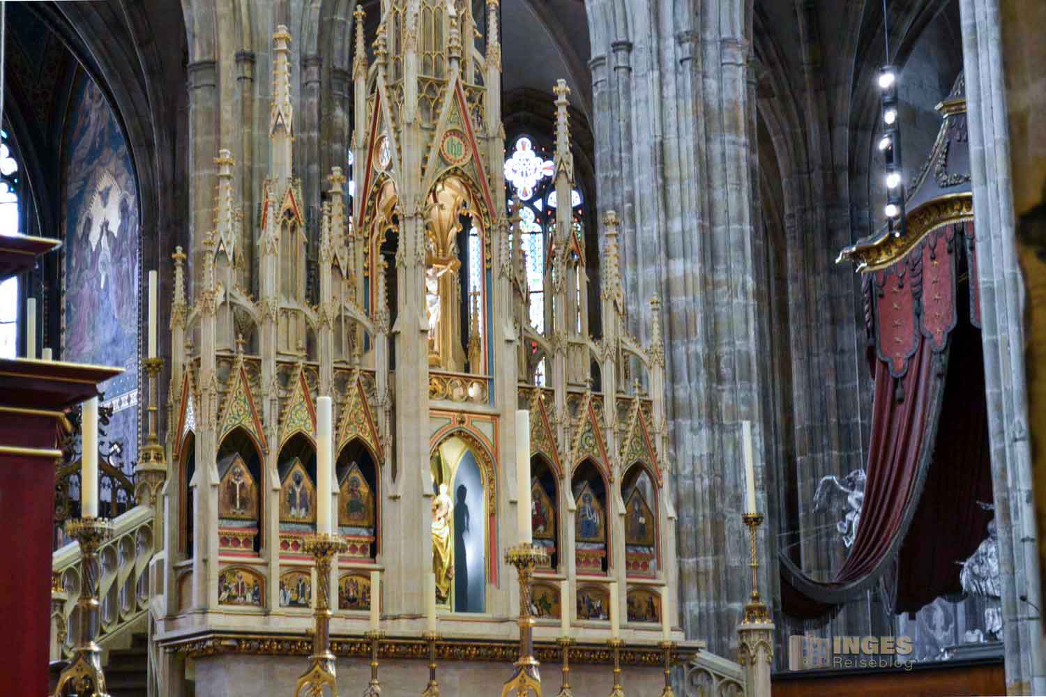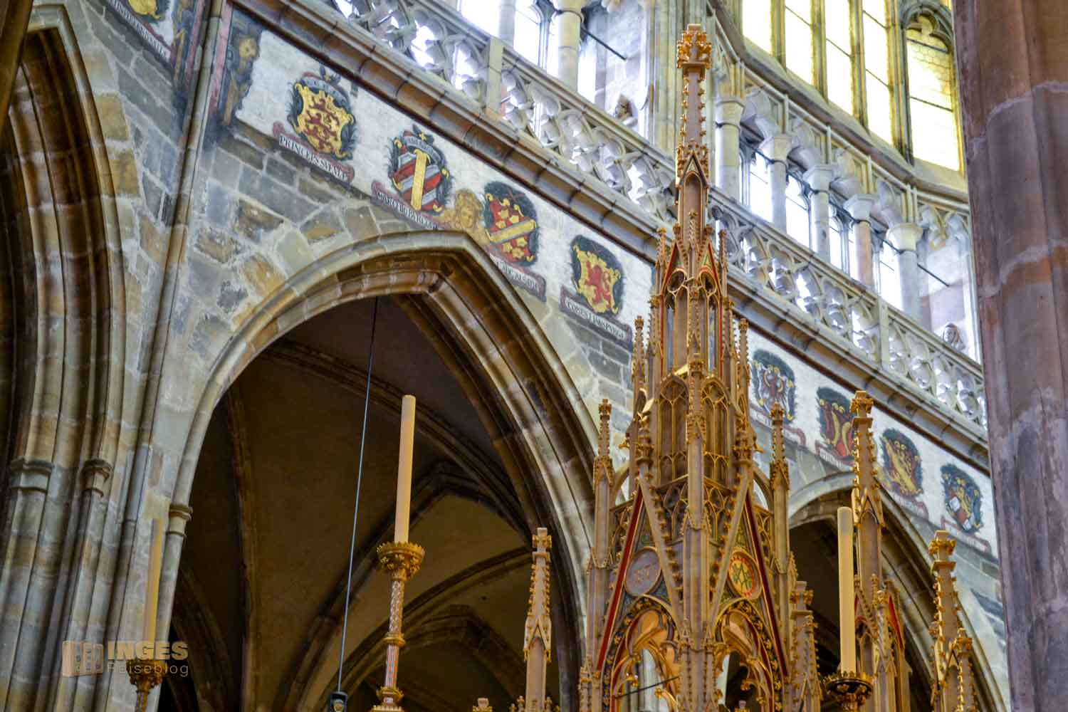 Ich war ja schon in sehr vielen großen Kirchen und habe dort auch viele Königslogen gesehen. Aber sooooo prachtvoll wie hier im Veitsdom war noch keine. Direkt vom Königspalast konnten die Hoheiten über einen überdachten Gang (den seht ihr noch in den Außenfotos) in den Veitsdom zur Messe gehen. Irgendwie hebt sich diese Königsloge von der anderen Ausschmückung des Doms ab.