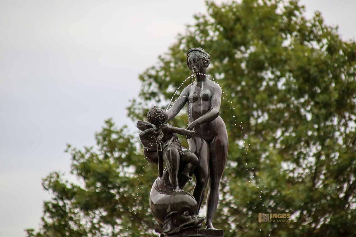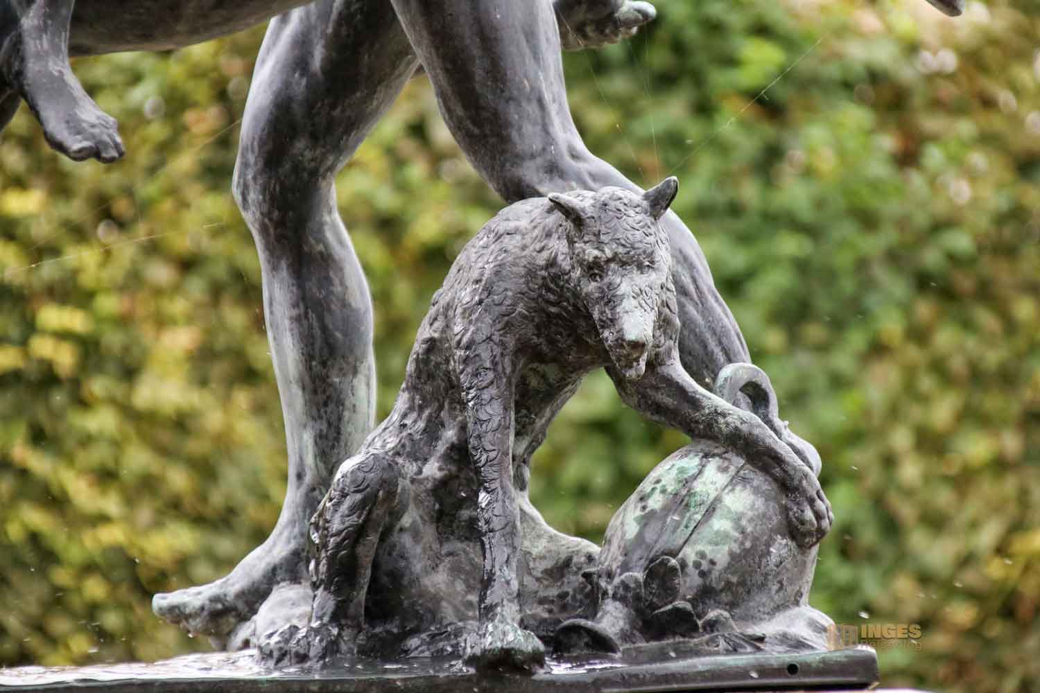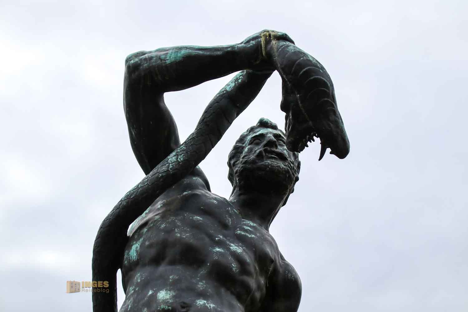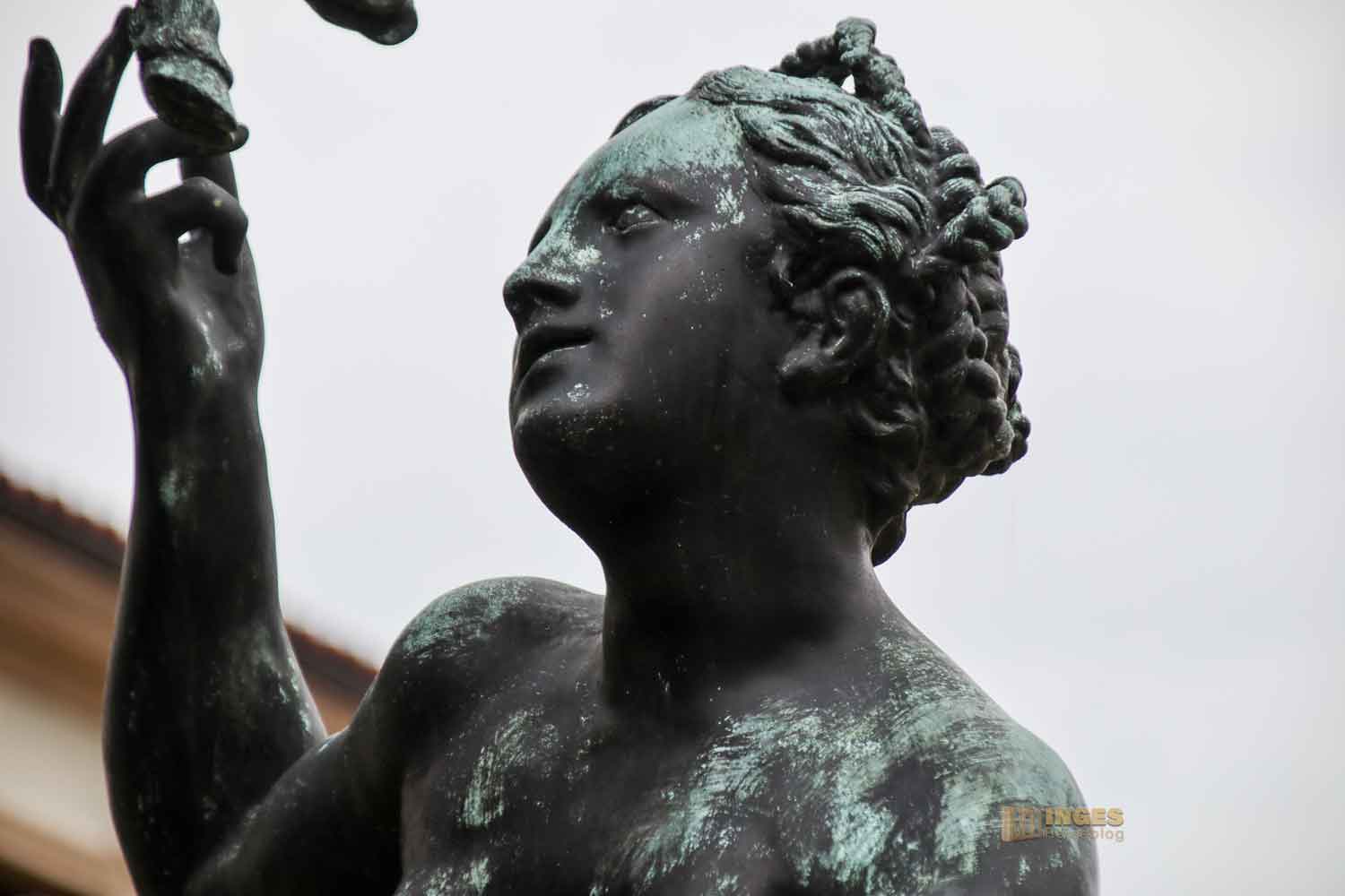 Mitten im Teich kämpft er mit Ladon, dem Drache. Rings um den Brunnen sitzen Najaden, also Nymphen aus der griechischen Mythologie. Sie hatten die Aufgabe über die Gewässer zu wachen. Ließen sie eines austrocknen, mussten sie sterben. Eine der zwölf Aufgaben von Herkules war, goldene Äpfel von einem Baum zu pflücken. Doof nur, dass der Drache genau diesen Baum bewachte.