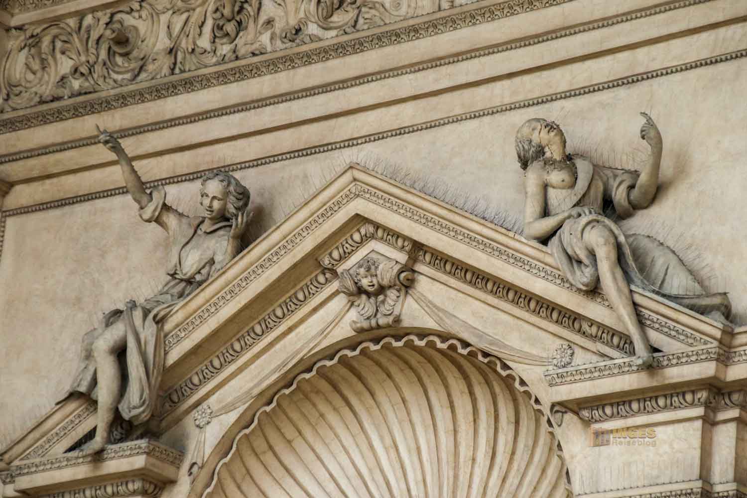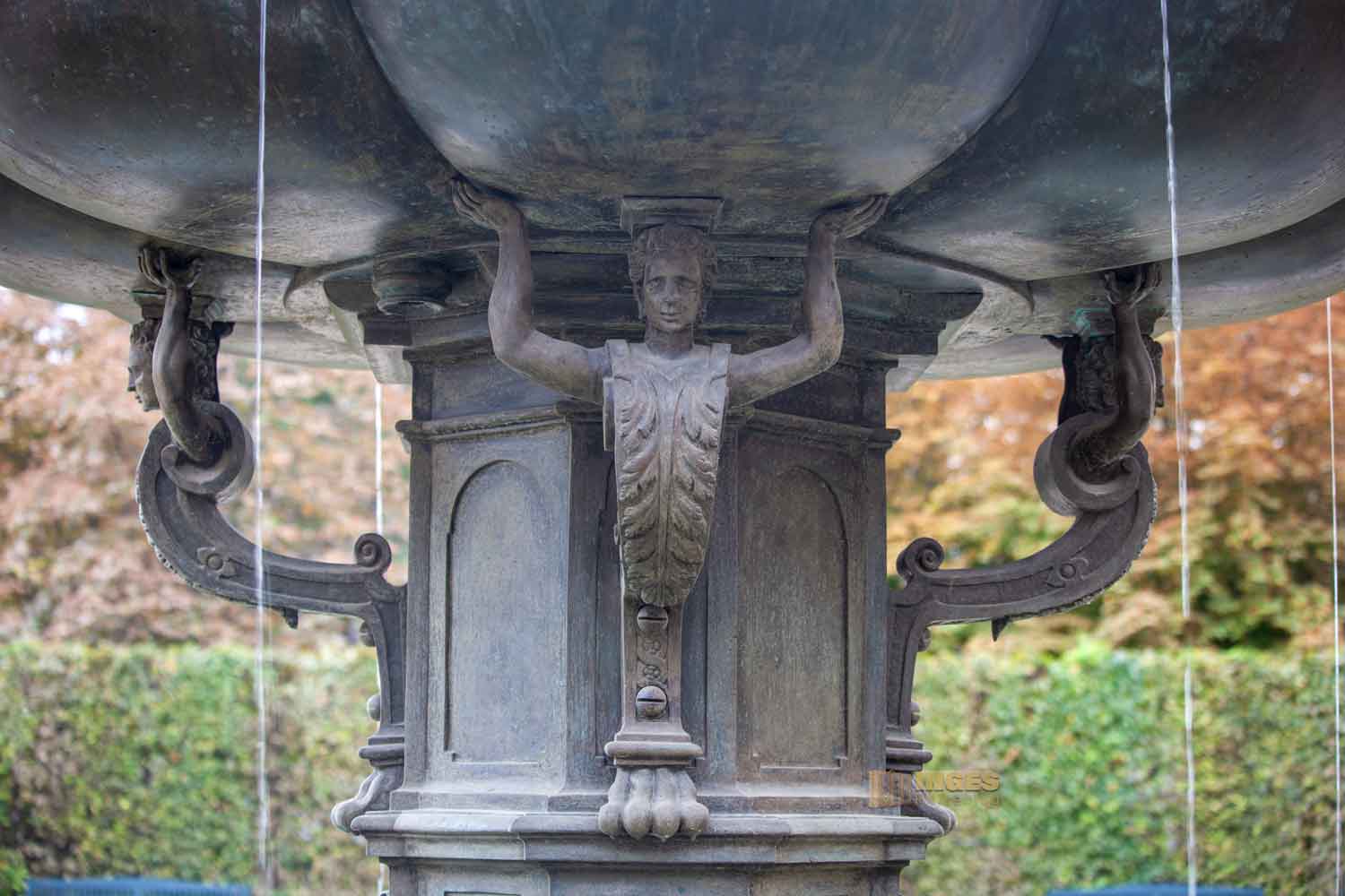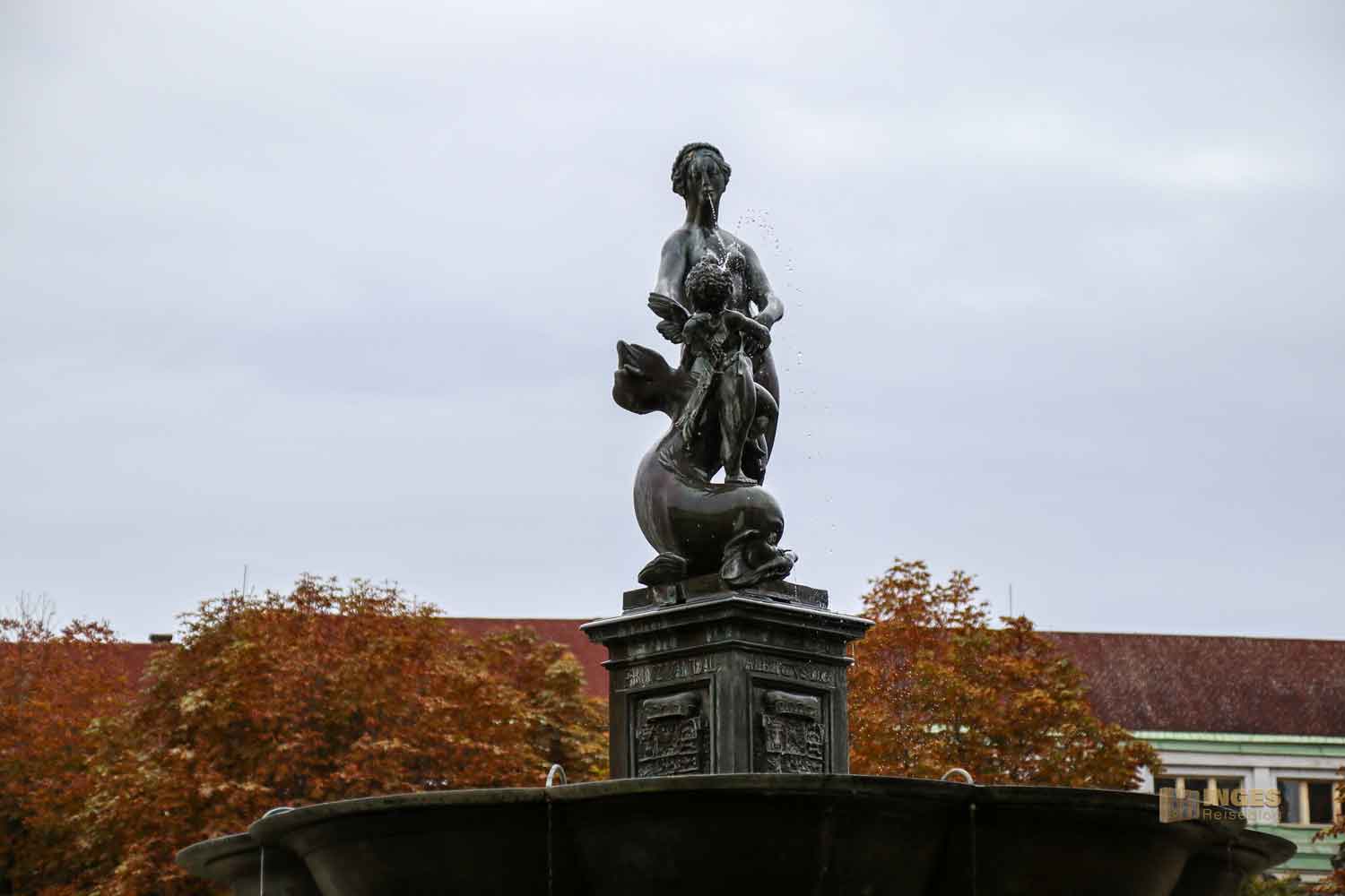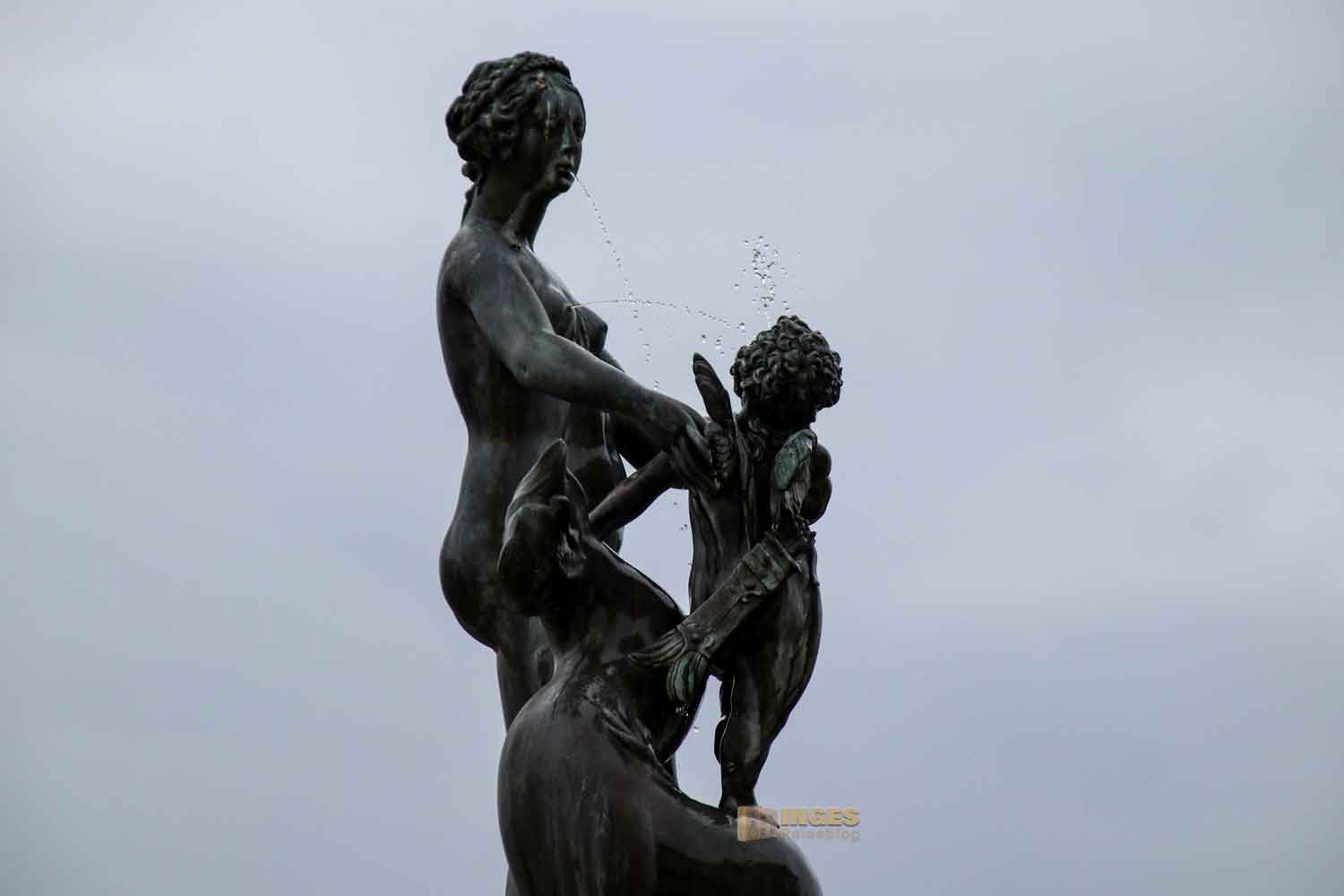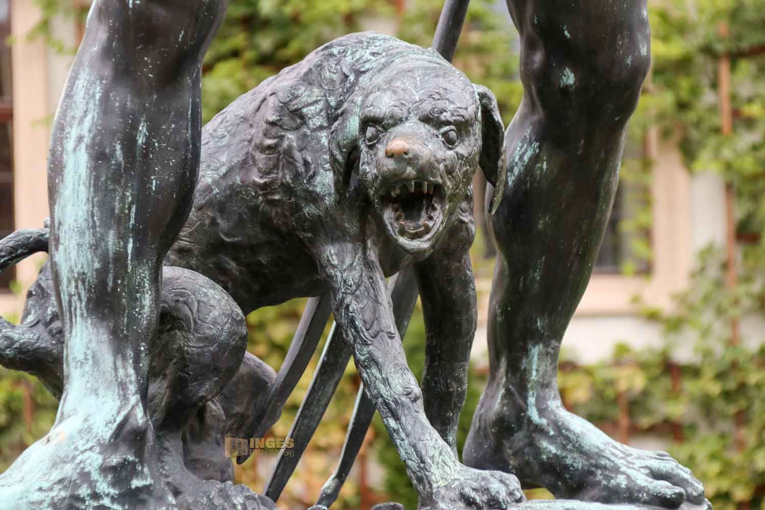 Mitten im Teich kämpft er mit Ladon, dem Drache. Rings um den Brunnen sitzen Najaden, also Nymphen aus der griechischen Mythologie. Sie hatten die Aufgabe über die Gewässer zu wachen. Ließen sie eines austrocknen, mussten sie sterben. Eine der zwölf Aufgaben von Herkules war, goldene Äpfel von einem Baum zu pflücken. Doof nur, dass der Drache genau diesen Baum bewachte.